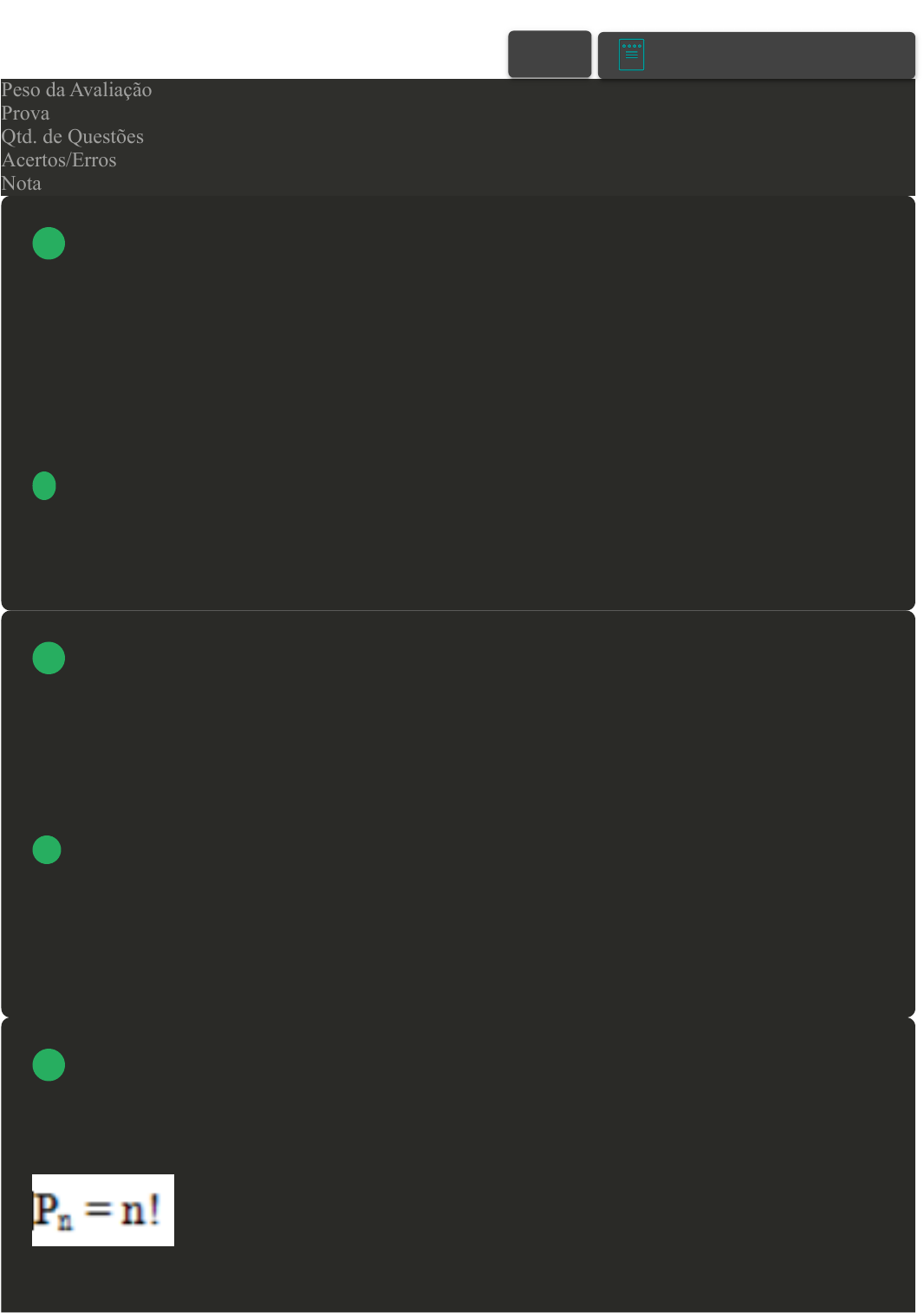 Prova Impressa GABARITO | Avaliação I - Individual (Cod.:955579) Peso da Avaliação 2,00 Prova 81370834 Qtd. de Questões 10 Acertos/Erros 10/0 Nota 10,00 Com as letras x, y e z você pode formar as seguintes sucessões: (x, y, z); (x, z, y); (y, z, x); (y, x, z); (z, x, y); (z, y, z). Cada uma dessas seis sucessões é chamada uma permutação das três letras. Acerca da Permutação, assinale a alternativa CORRETA: A Denomina-se permutação de n toda sucessão de (n-1) elementos, formada com os n elementos dados. B Denomina-se permutação de n elementos dados a toda sucessão de n-1 termos formada com elementos nulos. C Denomina-se permutação de n elementos dados a toda sucessão de n elementos formada com os n elementos dados. D Denomina-se permutação de t elementos dados a toda sucessão de g termos formada com as n funções de dados. Dado um baralho comum, com 52 cartas, considere a probabilidade de se retirar, em duas retiradas seguidas sem reposição, as cartas “J” e “Q” nessa ordem. Observação: Em um baralho existem 4 cartas J e 4 cartas Q. Acerca do resultado, assinale a alternativa CORRETA: A A probabilidade é 1/16. B A probabilidade é 4/663. C A probabilidade é 1/4. D A probabilidade é 4/169. Pense em quantas permutações podem ser formadas com as vogais a, e, i, o e u. Você poderia resolver fazendo o mesmo procedimento dos anagramas, mas daria certo trabalho. Pense que para formar uma dessas permutações você deve fazer uma ação que é composta de cinco etapas sucessivas. Qual o número total de permutações? VOLTAR A+ Alterar modo de visualização 1 2 3 14/05/2024, 09:24 Avaliação I - Individual about:blank 1/5 Acerca do resultado, assinale a alternativa CORRETA: A 50 permutações. B 120 permutações. C 5 permutações. D 24 permutações. Pense em quantas permutações podem ser formadas com as vogais a, e, i, o e u. Você poderia resolver fazendo o mesmo procedimento dos anagramas, mas daria certo trabalho. Pense que para formar uma dessas permutações você deve fazer uma ação que é composta de cinco etapas sucessivas. Acerca da 1° etapa, assinale a alternativa CORRETA: A Você deve escolher o 1° número da permutação. Ele pode ser 8 ou 9 ou 7 ou 5 ou 4, sendo assim, há cinco possibilidades para esta etapa. B Você deve escolher a 1ª vogal da permutação. Ela pode ser a ou e, sendo assim, há duas possibilidades para esta etapa. C Você deve escolher a 1ª vogal da permutação. Ela pode ser a ou e ou i, sendo assim, há três possibilidades para esta etapa. D Você deve escolher a 1ª vogal da permutação. Ela pode ser a ou e ou i ou o ou u, sendo assim, há cinco possibilidades para esta etapa. Denominam-se combinações de n elementos distintos tomados p a p os conjuntos formados por p elementos distintos escolhidos entre os n elementos dados. Quantas são as combinações de 6 elementos tomados 2 a 2? Assinale a alternativa CORRETA: A 10. B 60. C 15. 4 5 14/05/2024, 09:24 Avaliação I - Individual about:blank 2/5 D 6/8. O Princípio Fundamental da Contagem é composto de duas etapas sucessivas, sendo que a primeira pode ser feita de m modos e, para cada um desses, a segunda pode ser feita de n modos, então o número de modos de realizar a ação é m·n. Esse princípio pode ser generalizado para ações compostas de mais de duas etapas. Qual das opções se refere ao Binômio de Newton? Assinale a alternativa CORRETA: A Denominam-se arranjo simples de n elementos distintos tomados k a k os conjuntos formados de k elementos distintos escolhidos entre os n elementos dados, sendo que um conjunto é diferente de outro pela natureza dos elementos ou pela ordem. B Denominam-se combinações de n elementos distintos tomados k a k os conjuntos formados de k elementos distintos escolhidos entre os n elementos dados, sendo que um conjunto é diferente de outro apenas pela natureza dos elementos e não pela ordem. C No desenvolvimento de (x + a)n os coeficientes formam o triângulo. D Denomina-se permutação de n elementos dados a toda sucessão de n termos formada com os n elementos dados. Ao se lançar dois dados cujas faces estão numeradas de 1 a 6, determine a probabilidade das faces voltadas para cima apresentarem no primeiro dado o número 1 e no segundo o número 6. Acerca do resultado, assinale a alternativa CORRETA: A A probabilidade é 5/36. B A probabilidade é 1/36. C A probabilidade é 1/12. D A probabilidade é 2/18. Resolvendo a equação (n + 1)! = 10 n! , obtemos o valor de n. Determine o valor de ( n - 1 )². Acerca do resultado, assinale a alternativa CORRETA: A 100. B 81. C 64. D 36. 6 7 8 14/05/2024, 09:24 Avaliação I - Individual about:blank 3/5 Icosaedros são usados como dados de 20 lados desde a Antiguidade. Considere a probabilidade de se obter o número 6 lançando-se um icosaedro com suas faces numeradas de 1 a 20. Icosaedro Acerca do resultado, assinale a alternativa CORRETA: A A probabilidade é 0,5%. B A probabilidade é 5%. C A probabilidade é 2%. D A probabilidade é 1%. Um anagrama é uma espécie de jogo de palavras criado com a reorganização das letras de uma palavra ou expressão para produzir outras palavras ou expressões, utilizando todas as letras originais exatamente uma vez. Com base nessa definição, qual é o número de anagramas que podem ser formados com as letras do nome UNIASSELVI? Acerca do resultado, assinale a alternativa CORRETA: A 902 700 anagramas. B 75 600 anagramas. C 1 814 400 anagramas. D 907 200 anagramas. 9 10 14/05/2024, 09:24 Avaliação I - Individual about:blank 4/5 Imprimir 14/05/2024, 09:24 Avaliação I - Individual about:blank 5/5