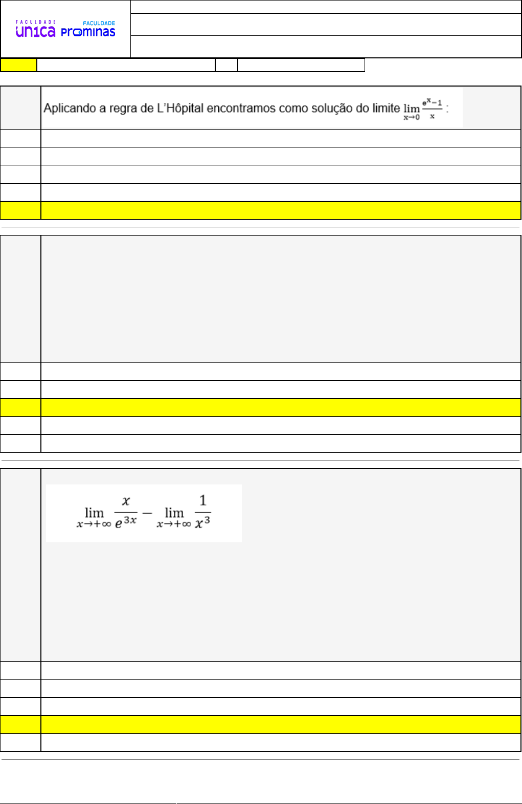 09/04/2024 22:59:18 1/2 REVISÃO DE SIMULADO Nome: LUIZ GUSTAVO MORELLI Disciplina: Cálculo III Respostas corretas são marcadas em amarelo X Respostas marcardas por você. Questão 001 A) 1 X B) -2 C) 3 D) 2 E) -1 Questão 002 Sobre os limites no infinito foram feitas três afirmações: I. Todo limite no infinito pode ser calculado mediante a substituição direta da variável pelo extremo do intervalo superior. II. Quando no limite resultar uma indeterminação dos tipos 0/0 ou (±∞)/(±∞) deve-se considerar a regra de L’Hôpital. III. Os gráficos dos limites no infinito não contribuem para modelos matemáticos de situações reais. É correto o que se afirma em: A) I e II, apenas. B) I, apenas. X C) II, apenas. D) II e III, apenas. E) III, apenas. Questão 003 Analise a situação abaixo: Considerando a situação apresentada, avalie a seguintes asserções e a relação proposta entre elas. I. A soma dos limites da situação será 0. PORQUE II. O primeiro limite resultará em uma indefinição, sendo necessária a regra de L’Hôpital. Já o segundo converge para 0 na medida em que x aumenta seu valor para infinito. A respeito destas asserções, assinale a opção correta. A) As asserções I e II são proposições falsas. X B) A asserção I é uma proposição falsa e, a II é uma proposição verdadeira. C) As asserções I e II são proposições verdadeiras, mas a II não é uma justificativa da I. D) As asserçoÌ�es I e II saÌ�o proposiçoÌ�es verdadeiras, e a II eÌ� uma justificativa da I. E) A asserção I é uma proposição verdadeira e, a II é uma proposição falsa. 09/04/2024 22:59:18 2/2 Questão 004 A) -1 X B) -2 C) 0 D) 2 E) 3 Questão 005 A) 4/7 B) 2/7 X C) 3/7 D) 5/7 E) 1/7 Questão 006 A) 1 B) 1/6 C) 3 X D) 2/5 E) 1/3 Questão 007 X A) 0 B) 2 C) 4 D) 3 E) 1 Questão 008 A) 5 B) 4 X C) 1 D) 3 E) 2
