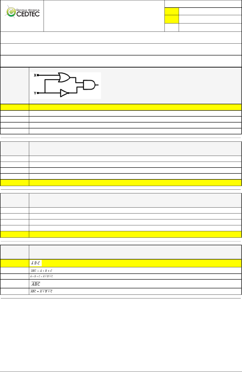 Pincel Atômico - 15/05/2024 20:50:53 1/1 LUCAS DE SOUZA DOS SANTOS Exercício Caminho do Conhecimento - Etapa 7 (22703) Atividade finalizada em 15/05/2024 20:38:02 (1989000 / 1) LEGENDA Resposta correta na questão # Resposta correta - Questão Anulada X Resposta selecionada pelo Aluno Disciplina: ELETRÔNICA [838680] - Avaliação com 4 questões, com o peso total de 13,00 pontos [capítulos - 112] Turma: Curso Técnico: Automação Industrial - Grupo: EAD - 05/23 - EAD AUT [88401] Aluno(a): 91457450 - LUCAS DE SOUZA DOS SANTOS - Respondeu 4 questões corretas, obtendo um total de 13,00 pontos como nota [349998_146005] Questão 001 Analise o circuito lógico a seguir. Esse circuito lógico possui duas entradas digitais “X” e “Y”. Assinale a alternativa que apresenta a saída desse sistema. X (X + Y). Ó® (X + Y) + Ó® (X + Y). Y Não possui saída logica (X . Y) + Ó® [349998_145998] Questão 002 Ao verificar um conversor de binário para octal, foi induzido como teste, na entrada, o número 11111, que, na saída, corresponderá ao número: 46 26 27 16 X 37 [349998_145999] Questão 003 O valor binário da subtração de 101110 - 101010 tem como resultado: 1001 0011 1100 0010 X 0100 [349998_146023] Questão 004 A negação da função lógica representada pela expressão ABC+A+B+C equivale a: X