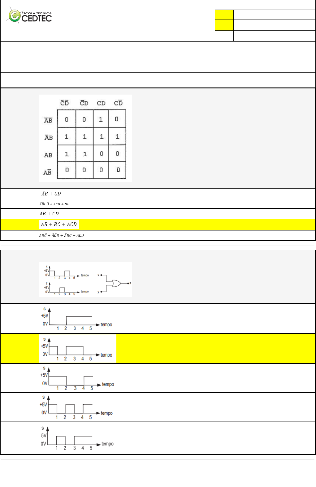 Pincel Atômico - 15/05/2024 20:51:00 1/2 LUCAS DE SOUZA DOS SANTOS Exercício Caminho do Conhecimento - Etapa 11 (22706) Atividade finalizada em 15/05/2024 20:43:45 (1989001 / 1) LEGENDA Resposta correta na questão # Resposta correta - Questão Anulada X Resposta selecionada pelo Aluno Disciplina: ELETRÔNICA [838680] - Avaliação com 4 questões, com o peso total de 13,00 pontos [capítulos - 113] Turma: Curso Técnico: Automação Industrial - Grupo: EAD - 05/23 - EAD AUT [88401] Aluno(a): 91457450 - LUCAS DE SOUZA DOS SANTOS - Respondeu 4 questões corretas, obtendo um total de 13,00 pontos como nota [349997_146136] Questão 001 Observe a seguir o mapa de Karnaugh para quatro variáveis. Encontre a equação lógica simplificada, através do mapa de Karnaugh apresentado acima, e assinale a opção correta. X [349998_146126] Questão 002 Um circuito eletrônico digital, representado na Figura abaixo, através de sua simbologia lógica equivalente, apresenta duas entradas (x e y) e uma saída (s) e trabalha com lógica positiva na qual a tensão mais positiva é atribuída como sendo o estado “1” lógico. Conhecendo−se a forma de onda dos sinais de entrada x e y, mostrados na mesma Figura, qual é a forma de onda do sinal de saída s? X Pincel Atômico - 15/05/2024 20:51:00 2/2 [349998_146116] Questão 003 Um circuito lógico da figura foi programado para acionar um motor quando apenas duas das três chaves (A, B, C) estiverem ligadas. Para o acionamento, convencionou-se que as variáveis assumem valor lógico 1, quando ligadas, e 0, quando desligadas A expressão lógica da saída M é: X [349998_146132] Questão 004 Em um microprocessador, a unidade de controle tem como função básica: X Buscar, decodificar e executar as instruções. Armazenar o resultado das operações lógicas e aritméticas. Controlar o consumo de potência do microprocessador. Armazenar endereço de retorno de subrotina. Controlar a velocidade de processamento.