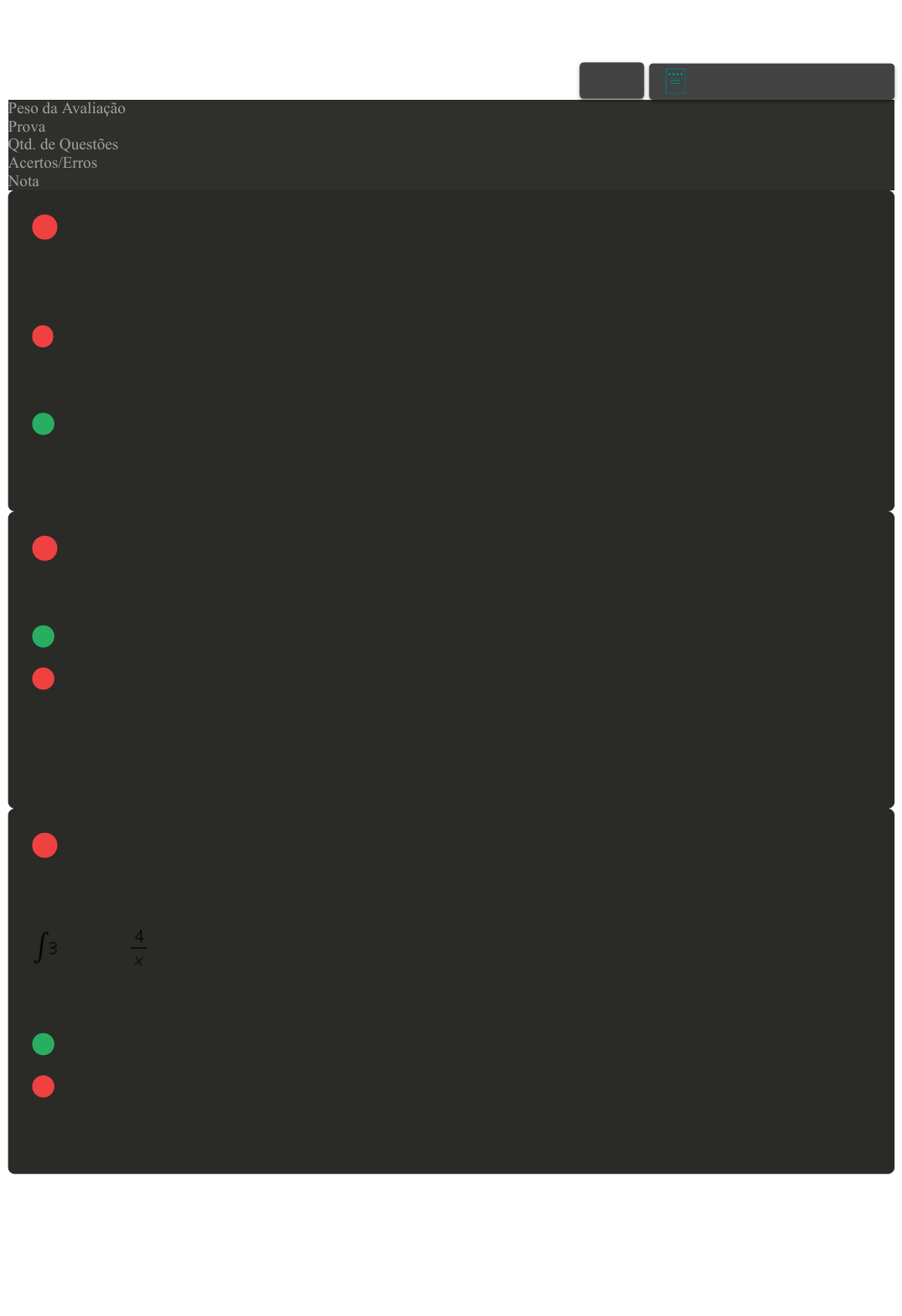Prova Impressa GABARITO | Avaliação I - Individual (Cod.:738718) Peso da Avaliação 1,50 Prova 45093451 Qtd. de Questões 10 Acertos/Erros 2/8 Nota 2,00 Existem algumas maneiras de calcular a integral de uma função. Por exemplo, calculando a integral usando a Soma de Riemann (entretanto, é bastante demorado), usando a primitiva da função (é mais rápido, porém não conhecemos as primitivas de todas as funções) etc. Para funções complexas, existem alguns métodos para facilitar o cálculo das integrais. Assinale a alternativa CORRETA que define quando devemos utilizar o método da substituição: A Quando é necessário fazer uma substituição adequada trocando algum termo na função original por uma função trigonométrica. B Para integrações de funções que podem ser escritas como o produto de outras duas funções - f(x) * g(x). Exemplo x*exdx. C Quando a função que queremos integrar seja escrita da seguinte forma: f (g (x))g'(x). Exemplo: 3 / (1+2x)³ dx. D Quando a função que queremos integrar seja escrita da seguinte forma: f (x (x))g'(g). Exemplo: 3 / (1+2g)³ dx. Três propriedades elementares da Integral são embasadas pelas somas de Riemann, em que são conservdas as propriedades da área e de somatório. Assinale a alternativa CORRETA que apresenta uma dessas propriedades: A A integral de uma soma algébrica de funções é igual à soma algébrica das integrais das funções. B A motivação para o conceito de integral é o cálculo de área. C A integral do produto de uma constante por uma função não existe. D A integral do quociente de uma função é sempre zero. O processo de se calcular a integral de uma função é chamado de integração. A integral indefinida também é conhecida como antiderivada. A integra indefinida defere da integral definida por que a indefinida não possui limites de integração para a integral, ou seja, para calculá-la, é necessário apenas utilizar as regras de integração. Sabendo disso, considere a integral indefinida a seguir: x2 + 5x2 + dxCalcule a itegrada definida e assinale a alternativa CORRETA: A 3x44 + 5x33 + lnx + c. B 3x44 + 5x33 +4 . ln x + c. C 9x² + 5x + 4 + c. D 3x4 + 5x3 + 4 . ln x + c. VOLTAR A+ Alterar modo de visualização 1 2 3 Observe o gráfico a seguir: Qual é a fórmula da área da imagem? A A = b2/2 B A = Y2/2 C A = x2/y D A = x.y Dependendo da função que você quer obter a integral, determinado método será mais adequado que outro. Qual é o método em que temos que fazer uma substituição adequada trocando algum termo na função original por uma função trigonométrica? A Método da Integração por partes. B Método da Substituição. C Método Frações Parciais. D Método da Substituição Trigonométrica. Considere a função Assinale a alternativa CORRETA que apresenta seu resultado: A ln tg x+C B ln sec x+C C ln cos x + tg x+C D ln sec x + tg x+C Se f é uma função de x, então a sua integral definida é uma integral restrita a valores em um intervalo específico, digamos, a ≤ x ≤ b . O resultado é um número que depende apenas de a e b, e não de x. Assinale a alternativa CORRETA que apresenta o resultado da integral A (e-1) / 2. B (-e-1) / 2. 4 5 6 7 C (-e+1) / 2. D (e+1) / 2. Os métodos de aproximação de áreas sob curvas implicam um somatório que é dado pela região a ser calculada em formas (retângulos, trapézios, parábolas ou cubos) que juntos formam uma região que é similar àquela a ser medida, então calcula-se a área de cada uma das formas e finalmente soma-se todas essas áreas juntas. Essa abordagem pode ser utilizada para encontrar uma aproximação numérica para a integral definida, mesmo se o teorema fundamental do cálculo não ajudar a encontrar uma forma fechada. Assinale a alternativa CORRETA que apresenta o nome da aproximação em referência: A Soma de Fibonacci. B Soma de Poincaré. C Soma de Riemann. D Soma de Leibniz. Considere o retângulo a seguir: Qual é a fórmula para cálculo da área desse retângulo? A B=(a+c).A B A = (b-a).c C A=(a+c).c D A = (a-b).c Considere que c representa uma constante real qualquer na integral indefinida ∫ e (ex + x) dx.Qual será o seu valor? A B C D 8 9 10 Imprimir