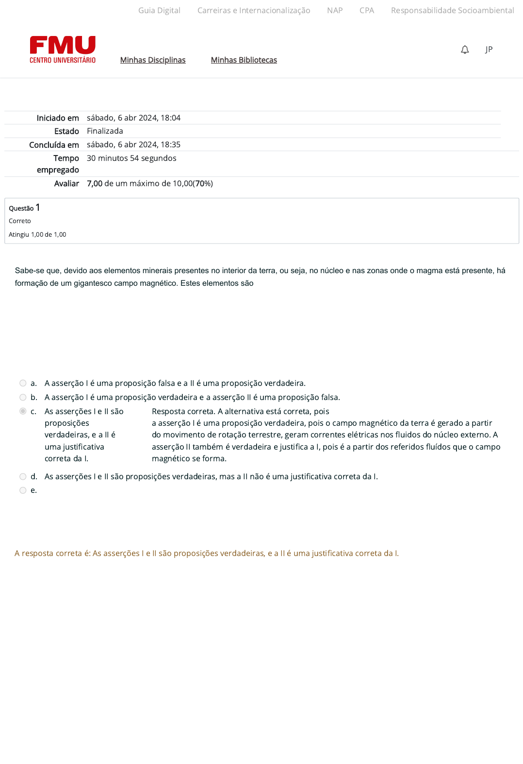 08/04/2024, 11:48 Atividade 2 (A2): Revisão da tentativa https://ambienteacademico.com.br/mod/quiz/review.php?attempt=4006256&cmid=1342716 1/9 Iniciado em sábado, 6 abr 2024, 18:04 Estado Finalizada Concluída em sábado, 6 abr 2024, 18:35 Tempo empregado 30 minutos 54 segundos Avaliar 7,00 de um máximo de 10,00(70%) Questão 1 Correto Atingiu 1,00 de 1,00 Sabe-se que, devido aos elementos minerais presentes no interior da terra, ou seja, no núcleo e nas zonas onde o magma está presente, há formação de um gigantesco campo magnético. Estes elementos são classificados como metais, ferro e níquel, principalmente. Sobre esta questão, analise as asserções a seguir e a relação proposta entre elas. I. A terra possui um campo magnético. Pois: II. O movimento de rotação terrestre gera correntes elétricas nos fluidos do núcleo externo. a. A asserção I é uma proposição falsa e a II é uma proposição verdadeira. b. A asserção I é uma proposição verdadeira e a asserção II é uma proposição falsa. c. As asserções I e II são proposições verdadeiras, e a II é uma justi�cativa correta da I. Resposta correta. A alternativa está correta, pois a asserção I é uma proposição verdadeira, pois o campo magnético da terra é gerado a partir do movimento de rotação terrestre, geram correntes elétricas nos �uidos do núcleo externo. A asserção II também é verdadeira e justi�ca a I, pois é a partir dos referidos �uídos que o campo magnético se forma. d. As asserções I e II são proposições verdadeiras, mas a II não é uma justi�cativa correta da I. e. As asserções I e II são proposições falsas. A resposta correta é: As asserções I e II são proposições verdadeiras, e a II é uma justi�cativa correta da I. Guia Digital Carreiras e Internacionalização NAP CPA Responsabilidade Socioambiental Minhas Disciplinas Minhas Bibliotecas JP https://codely-fmu-content.s3.amazonaws.com/Moodle/GuiaDigital/Guia+digital/index.html https://carreiras.fmu.br/ https://codely-fmu-content.s3.amazonaws.com/Moodle/NAP/inicial/nap/fmu/index.html https://codely-fmu-content.s3.amazonaws.com/Moodle/CPA/landing_CPA/index.html https://portal.fmu.br/sustentabilidade https://ambienteacademico.com.br/ https://ambienteacademico.com.br/ https://ambienteacademico.com.br/course/view.php?id=236 08/04/2024, 11:48 Atividade 2 (A2): Revisão da tentativa https://ambienteacademico.com.br/mod/quiz/review.php?attempt=4006256&cmid=1342716 2/9 Questão 2 Incorreto Atingiu 0,00 de 1,00 Em muitas situações é necessário realizar a conversão entre rumos e azimutes, pois as informações disponíveis estão em apenas um destes tipos de ângulos. Por exemplo, se em uma bússola que disponibilize a orientação em forma de rumo e o memorial descritivo da propriedade que se deseja realizar o levantamento topográfico esteja com os dados em azimute, deve-se realizar a conversão. Nesse contexto, indique a alternativa correta de conversão entre Azimute e Rumo. a. 89º 41' 33" = 89º 41' 33". b. 227º 33' 44" = 180º 21" 47" SE. c. 18º 06' 24" NW = 341º 53' 36". Sua resposta está incorreta. A alternativa está incorreta, pois os valores não correspondem à correta conversão entre azimute e rumo. É necessário substituir o valor correspondente do Rumo ou do Azimute no quadrante em que ele pertence e obter o valor que se deseja. Desta forma, como o ângulo 341º 53' 36" é um azimute e está no quarto quadrante, deve-se subtrair 360º deste ângulo, assim, obtém-se o valor de 18º 06' 24" NW. d. 127º 12' 21" = 52º 47º 39º. e. 341º 53' 36" = 18º 06' 24" NW. A resposta correta é: 341º 53' 36" = 18º 06' 24" NW. Guia Digital Carreiras e Internacionalização NAP CPA Responsabilidade Socioambiental Minhas Disciplinas Minhas Bibliotecas JP https://codely-fmu-content.s3.amazonaws.com/Moodle/GuiaDigital/Guia+digital/index.html https://carreiras.fmu.br/ https://codely-fmu-content.s3.amazonaws.com/Moodle/NAP/inicial/nap/fmu/index.html https://codely-fmu-content.s3.amazonaws.com/Moodle/CPA/landing_CPA/index.html https://portal.fmu.br/sustentabilidade https://ambienteacademico.com.br/ https://ambienteacademico.com.br/ https://ambienteacademico.com.br/course/view.php?id=236 08/04/2024, 11:48 Atividade 2 (A2): Revisão da tentativa https://ambienteacademico.com.br/mod/quiz/review.php?attempt=4006256&cmid=1342716 3/9 Questão 3 Correto Atingiu 1,00 de 1,00 A estrutura interna da terra é dividida em camadas: superfície terrestre, astenosfera, manto, núcleo externo e núcleo interno. Éa partir da característica líquida do núcleo externo que se associa a formação do campo magnético da terra. Esse campo surge com o movimento de rotação terrestre, que geram correntes elétricas nos fluidos do núcleo externo. Desta forma, define-se o norte magnético, que pode ser indicado através de uma bússola. Sobre esta questão, analise as asserções a seguir e a relação proposta entre elas. I. O norte magnético muda de posição ao longo do tempo. Pois: II. O magnetismo gerado pelo núcleo da terra é constante. a. A asserção I é uma proposição falsa e a II é uma proposição verdadeira. b. As asserções I e II são proposições verdadeiras, e a II é uma justi�cativa correta da I. c. As asserções I e II são proposições verdadeiras, mas a II não é uma justi�cativa correta da I. d. A asserção I é uma proposição verdadeira e a asserção II é uma proposição falsa. Resposta correta. A alternativa está correta, pois a asserção I é uma proposição verdadeira, pois o norte magnético muda de posição ao longo do tempo, devido a diminuição da intensidade do campo magnético da terra. A asserção II é falsa, pois o magnetismo gerado pelo núcleo da terra, através das correntes elétricas, não é constante, mudando de posição devido a sua intensidade. e. As asserções I e II são proposições falsas. A resposta correta é: A asserção I é uma 