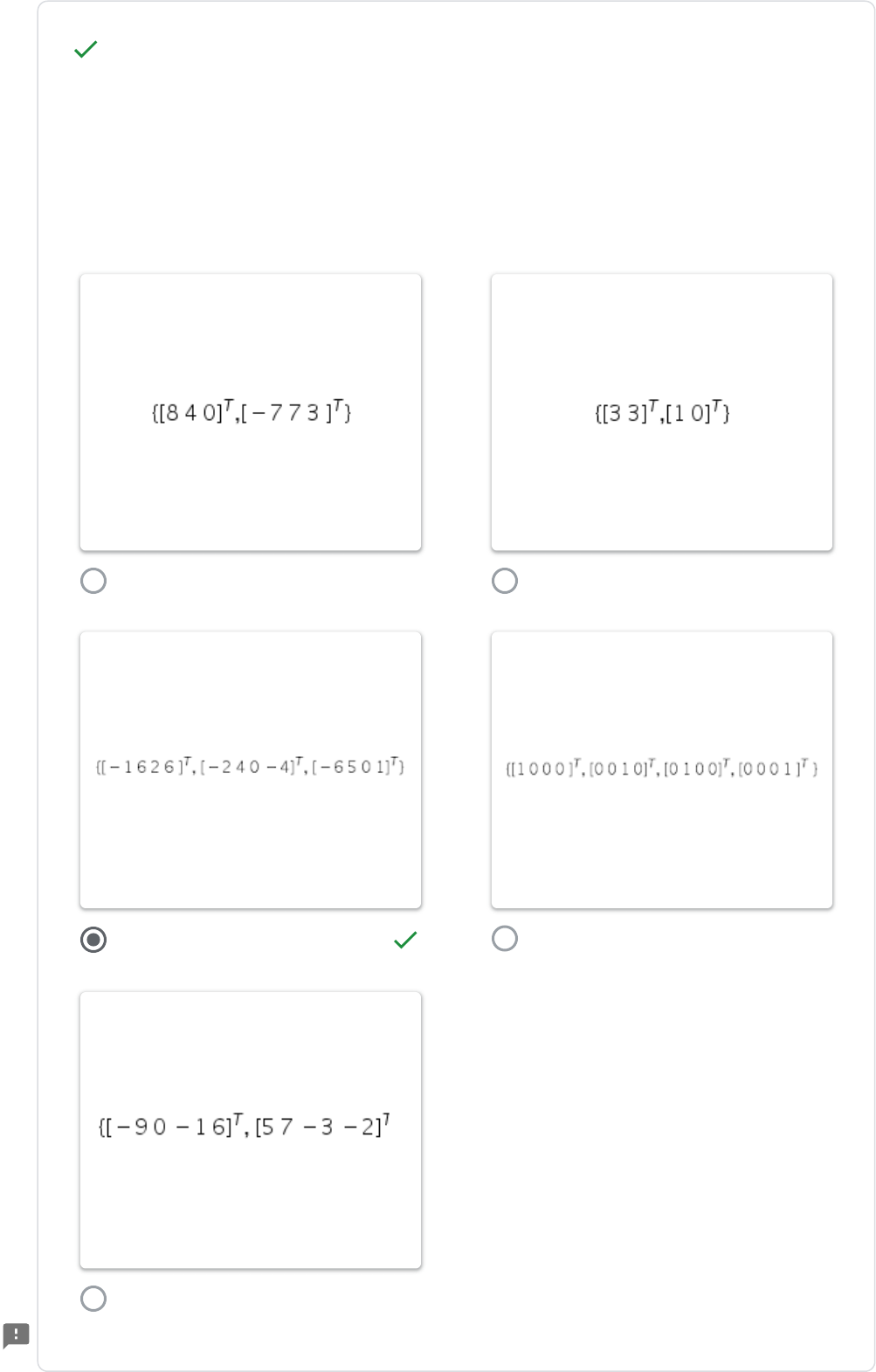 19/11/23, 19:18 Questionário U3-U4 G-23200195 https://docs.google.com/forms/d/e/1FAIpQLSfX-5pkoFV9j-E5rnDPG2-aWpnONjcQLhn-nDWrz2Un0GfdXg/viewscore?vc=0&c=0&w=1&flr=0&vie… 2/11 1/1 A) B) C) D) E) 1. Em Álgebra Linear, os conceitos de base e dimensão estão fortemente relacionados. Em cada alternativa, o conjunto dado é uma base para o subespaço que ele gera. Marque a alternativa que contém uma base para um subespaço cuja dimensão é 3. * 19/11/23, 19:18 Questionário U3-U4 G-23200195 https://docs.google.com/forms/d/e/1FAIpQLSfX-5pkoFV9j-E5rnDPG2-aWpnONjcQLhn-nDWrz2Un0GfdXg/viewscore?vc=0&c=0&w=1&flr=0&vie… 3/11 1/1 A) I, apenas. B) III, apenas. C) I e II, apenas. D) II e III, apenas. E) I, II e III. 3. Espaço vetorial é o conjunto de vetores que necessitam de propriedades básicas para encontrar o valor vetorial. Para determinar um subespaço, depende do número de operações que será utilizado no espaço vetorial. Essas operações demonstram implicitamente as propriedades básicas que definem o espaço vetorial. PORQUE Um espaço vetorial é definido por um conjunto de vetores que apresentam, como operações fundamentais, a soma e a multiplicação de um vetor por um número real. 2. Sabemos que uma reta pode ser representada por meio de sua equação. No caso da reta no espaço, essa equação pode ser vetorial, paramétrica, simétrica ou reduzida. A partir da equação da reta, é possível identificar seu vetor diretor e verificar se um ponto dado pertence ou não a essa reta. Com base nas informações apresentadas, avalie as afirmações a seguir. * 19/11/23, 19:18 Questionário U3-U4 G-23200195 https://docs.google.com/forms/d/e/1FAIpQLSfX-5pkoFV9j-E5rnDPG2-aWpnONjcQLhn-nDWrz2Un0GfdXg/viewscore?vc=0&c=0&w=1&flr=0&vie… 4/11 0/2 A) As duas asserções são proposições verdadeiras, e a segunda é uma justificativa correta da primeira. B) As duas asserções são proposições verdadeiras, mas a segunda não é uma justificativa correta da primeira. C) A primeira asserção é uma proposição verdadeira, e a segunda, uma proposição falsa. D) A primeira asserção é uma proposição falsa, e a segunda, uma proposição verdadeira. E) Tanto a primeira quanto a segunda asserções são proposições falsas. Resposta correta A) As duas asserções são proposições verdadeiras, e a segunda é uma justificativa correta da primeira. Acerca dessas asserções e da relação proposta entre elas, assinale a alternativa correta. * 19/11/23, 19:18 Questionário U3-U4 G-23200195 https://docs.google.com/forms/d/e/1FAIpQLSfX-5pkoFV9j-E5rnDPG2-aWpnONjcQLhn-nDWrz2Un0GfdXg/viewscore?vc=0&c=0&w=1&flr=0&vie… 5/11 2/2 A) I, apenas. B) III, apenas. C) I e II, apenas. D) II e III, apenas. E) I, II e III. 5. 4. Analise os itens a seguir sobre autovetores e autovalores: * 19/11/23, 19:18 Questionário U3-U4 G-23200195 https://docs.google.com/forms/d/e/1FAIpQLSfX-5pkoFV9j-E5rnDPG2-aWpnONjcQLhn-nDWrz2Un0GfdXg/viewscore?vc=0&c=0&w=1&flr=0&vie… 6/11 0/2 A) I, apenas. B) III, apenas. C) I e II, apenas. D) II e III, apenas. E) I, II e III. Resposta correta C) I e II, apenas. Com base nas informações apresentadas, avalie as afirmações a seguir. * 19/11/23, 19:18 Questionário U3-U4 G-23200195 https://docs.google.com/forms/d/e/1FAIpQLSfX-5pkoFV9j-E5rnDPG2-aWpnONjcQLhn-nDWrz2Un0GfdXg/viewscore?vc=0&c=0&w=1&flr=0&vie… 7/11 0/2 A) As duas asserções são proposições verdadeiras, e a segunda é uma justificativa correta da primeira. B) As duas asserções são proposições verdadeiras, mas a segunda não é uma justificativa correta da primeira. C) A primeira asserção é uma proposição verdadeira, e a segunda, uma proposição falsa. D) A primeira asserção é uma proposição falsa, e a segunda, uma proposição verdadeira. E) Tanto a primeira quanto a segunda asserções são proposições falsas. Resposta correta B) As duas asserções são proposições verdadeiras, mas a segunda não é uma justificativa correta da primeira. Este formulário foi criado em Universidade La Salle. 6. Na Álgebra Linear, o conceito de transformação linear é muito importante na resolução de problemas aplicados, entre eles os que envolvem processamento de imagens digitais. Na figura a seguir, foram aplicadas algumas transformações na imagem digitalizada: *
