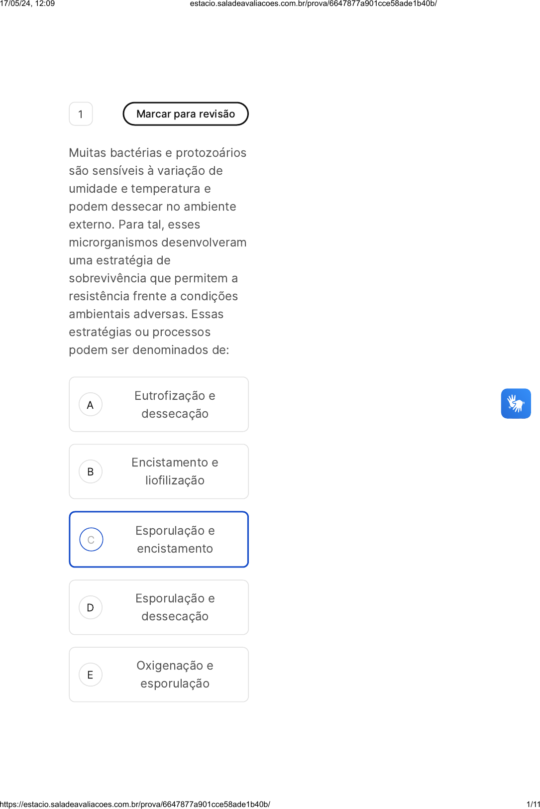A B C D E 1 Marcar para revisão Muitas bactérias e protozoários são sensíveis à variação de umidade e temperatura e podem dessecar no ambiente externo. Para tal, esses microrganismos desenvolveram uma estratégia de sobrevivência que permitem a resistência frente a condições ambientais adversas. Essas estratégias ou processos podem ser denominados de: Eutrofização e dessecação Encistamento e liofilização Esporulação e encistamento Esporulação e dessecação Oxigenação e esporulação 17/05/24, 12:09 estacio.saladeavaliacoes.com.br/prova/6647877a901cce58ade1b40b/ https://estacio.saladeavaliacoes.com.br/prova/6647877a901cce58ade1b40b/ 1/11 ALTERNATIVA CORRETA A B C D E 2 Marcar para revisão O filo Platyhelminthes é composto por organismos com corpo achatado dorso- ventralmente, habitando ambientes aquáticos, solo ou interior de outros animais, como o homem. São representantes desse grupo: Taenia saginata e Fascíola hepática Ascaris lumbricoides e Trypanosoma cruzi Taenia saginata e Plasmodium falciparum Ascaris lumbricoides e Giardia duodenalis Entamoeba coli e Plasmodium ovale 3 Marcar para revisão A leishmaniose é uma doença transmitida por protozoários do gênero Leishmania. A Leishmaniose visceral, também conhecida como Calazar, geralmente se desenvolve 17/05/24, 12:09 estacio.saladeavaliacoes.com.br/prova/6647877a901cce58ade1b40b/ https://estacio.saladeavaliacoes.com.br/prova/6647877a901cce58ade1b40b/ 2/11 ALTERNATIVA CORRETA A B C dentro de meses após a picada do flebotomíneo. Diferentemente da Leishmaniose tegumentar, a leishmaniose visceral afeta órgãos, por causa disso se torna uma doença grave que necessita de tratamento o quanto antes. Entre as alternativas abaixo, marque aquela que diz respeito à leishmaniose visceral. Dentre os sintomas da doença, podemos destacar o aparecimento de feridas ulcerosas na pele e nas mucosas, que podem causar até mesmo deformidades. Essa doença é transmitida pela ingestão de água e alimentos contaminados por cistos desse protozoário. Febre, perda de peso, inchaço do fígado e baço que leva ao crescimento anormal do abdome, anemia e leucopenia assim como trombocitopenia. 17/05/24, 12:09 estacio.saladeavaliacoes.com.br/prova/6647877a901cce58ade1b40b/ https://estacio.saladeavaliacoes.com.br/prova/6647877a901cce58ade1b40b/ 3/11 ALTERNATIVA CORRETA D E A B É uma doença exclusiva de animais domésticos, como cães e gatos, sendo o homem um hospedeiro acidental. É causada principalmente por um protozoário ciliado, intracelular obrigatório que apresenta como formas evolutivas as amastigotas e tripomastigotas. 4 Marcar para revisão Assinale a alternativa em que todas as espécies de parasitos apresentadas são pertencentes à mesma classe. Leishmania donovani, Trypanosoma cruzi, e Trichomonas vaginalis Giardia lamblia, Taenia saginata, e Balantidium coli 17/05/24, 12:09 estacio.saladeavaliacoes.com.br/prova/6647877a901cce58ade1b40b/ https://estacio.saladeavaliacoes.com.br/prova/6647877a901cce58ade1b40b/ 4/11 ALTERNATIVA CORRETA C D E A B Trichuris trichiura, Trichomonas vaginalis, e Trypanosoma cruzi Trypanosoma brucei, Plasmodium falciparum, e Trichomonas vaginalis Toxoplasma gondii, Leishmania braziliensis, e Wuchereria bancrofti 5 Marcar para revisão Com relação à hidatidose, assinale a alternativa correta. No seu ciclo evolutivo, o homem é considerado o principal hospedeiro definitivo. Na hidatidose hepática, pode ocorrer hipertrofia do fígado. 17/05/24, 12:09 estacio.saladeavaliacoes.com.br/prova/6647877a901cce58ade1b40b/ https://estacio.saladeavaliacoes.com.br/prova/6647877a901cce58ade1b40b/ 5/11 C D E A B C O hospedeiro intermediário raramente manifesta quadro clínico, podendo ocorrer diarreia devido ao parasitismo no intestino delgado. Em função de ciclo evolutivo, o controle dessa enfermidade é muito difícil. O hospedeiro definitivo se infecta ao ingerir alimentos contaminados com ovos, eliminados pelas fezes de algum hospedeiro intermediário. 6 Marcar para revisão O tratamento da esquistossomose mansônica é feito com o uso de: Praziquantel Cambendazol Azitromicina 00 hora : 17 min : 31 seg Ocultar SM2 Parasitologia 17/05/24, 12:09 estacio.saladeavaliacoes.com.br/prova/6647877a901cce58ade1b40b/ https://estacio.saladeavaliacoes.com.br/prova/6647877a901cce58ade1b40b/ 6/11 ALTERNATIVA CORRETA ALTERNATIVA CORRETA PRAZIQUANTEL D E A B C Tiabendazol Albendazol 7 Marcar para revisão Nematódeos são animais vermiformes de vida livre ou parasitária, encontrados em plantas e animais, inclusive no homem. Sobre as características presentes em nematódeos, considere as afirmativas a seguir. I. Apresentam corpo não segmentado coberto por cutícula; II. Apresentam trato digestório completo; III. Possuem órgãos especializados para circulação; IV. Possuem pseudoceloma. Estão corretas apenas as afirmativas: II, III e IV. I, II e IV. II e III. Questão 10 de 10 Respondidas �10� Em branco �0� Finalizar prova 1 2 3 4 5 6 7 8 9 10 17/05/24, 12:09 estacio.saladeavaliacoes.com.br/prova/6647877a901cce58ade1b40b/ https://estacio.saladeavaliacoes.com.br/prova/6647877a901cce58ade1b40b/ 7/11 ALTERNATIVA CORRETA D E I e IV. I e III. 8 Marcar para revisão O envenenamento por serpente ocorre quando ela consegue injetar o conteúdo de suas glândulas venenosas, o que significa que nem toda picada leva ao envenenamento. Há muitas espécies de serpentes que não possuem presas ou, quando presentes, estão localizadas na porção posterior da boca, o que dificulta a injeção de veneno ou toxina. No Brasil, as serpentes peçonhentas são representadas por quatro gêneros: Bothrops, Lachesis e Micrurus. Sobre acidentes por serpentes, analise as afirmativas a seguir: I. Acidente botrópico causa dor, edema, equimose, bolhas serosas/serosas-hemorrágicas, que podem evoluir para necrose e infecções secundárias. O local de inoculação nem sempre é visível, há sangramento de pele e mucosa