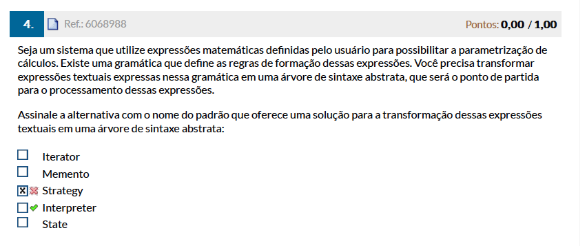 Seja um sistema que utilize expressões matemáticas definidas pelo usuário para possibilitar a parametrização de cálculos. Existe uma gramática que define as regras de formação dessas expressões. Você precisa transformar expressões textuais expressas nessa gramática em uma árvore de sintaxe abstrata, que será ponto de partida para processamento dessas expressões. Assinale a alternativa com nome do padrão que oferece uma solução para a transformação dessas expressões textuais em uma de sintaxe abstrata: Iterator Memento Strategy Interpreter State