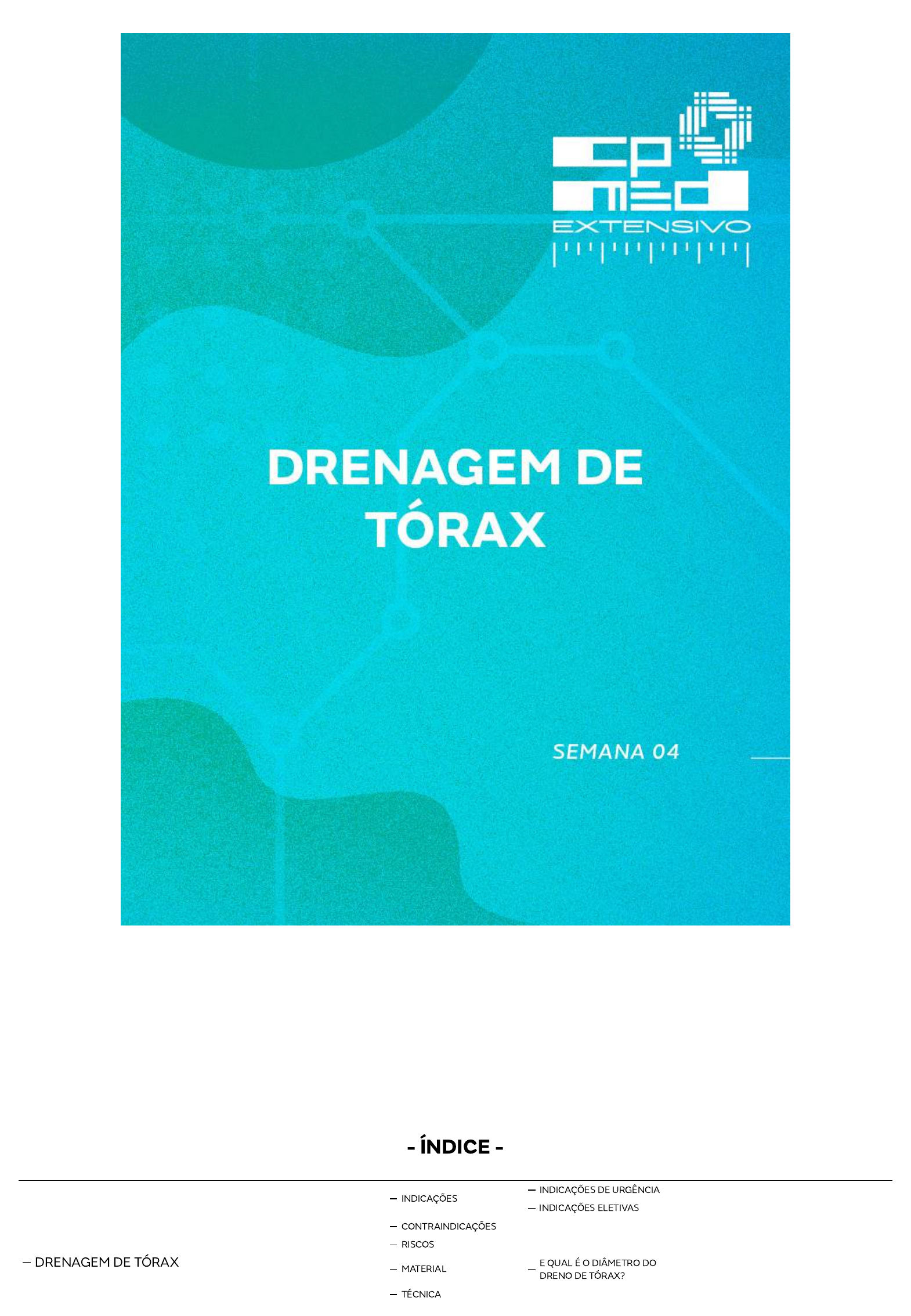 - ÍNDICE - DRENAGEM DE TÓRAX INDICAÇÕES INDICAÇÕES DE URGÊNCIA INDICAÇÕES ELETIVAS CONTRAINDICAÇÕES RISCOS MATERIAL E QUAL É O DIÂMETRO DO DRENO DE TÓRAX? TÉCNICA COMPLICAÇÕES REMOÇÃO DO DRENO TORÁCICO DRENAGEM DE TÓRAX VIDEO_01_CPMED_EXTENSIVO_APOSTILA_04 INDICAÇÕES A drenagem pleural pode ser um procedimento eletivo ou de urgência. INDICAÇÕES DE URGÊNCIA ● Pneumotórax. ● Hemotórax. ● Rotura esofagiana com derrame de conteúdo gástrico no espaço pleural. Todo pneumotórax deve ser drenado? Não! Fique atento às situações em que devemos abordar um pneumotórax: ● Em qualquer paciente em ventilação mecânica; ● Pneumotórax grande, > 1/3 do volume pulmonar; ● Pacientes clinicamente instáveis independentemente do tamanho do pneumotórax; ● Pneumotórax hipertensivo, após descompressão no 5º espaço intercostal com agulha*; ● Recorrência ou persistência; ● Pneumotórax traumático; ● Qualquer paciente antes de transporte aéreo. INDICAÇÕES ELETIVAS ● Derrame pleural exsudativo (exceto em derrame parapneumômico simples). ● Derrames pleurais de origem maligna (inclusive para o procedimento de pleurodese). ● Derrame recorrente. ● Derrame parapneumônico complicado. ● Empiema. ● Quilotórax. ● Drenagem profilática após alguns tipos de cirurgia torácica. Critérios para drenagem do líquido pleural? ● pH < 7,2. ● Glicose < 40 mg/dl. ● LDH > 1.000 UI/L. ● Presença de bactérias ou aspecto purulento CONTRAINDICAÇÕES Não existe contraindicação absoluta para a drenagem pleural. No entanto, fatores como aderências intrapleurais, coleção pleural loculada, coagulopatias, infecção cutânea sobrejacente e doença maligna da parede torácica sobrejacente são consideradas contraindicações relativas e devem ser, quando possível, corrigidas antes do procedimento. Nestes casos, a drenagem exige mais cautela e o risco de complicação é maior. Nos casos de aderências intrapleurais e coleção loculada, a drenagem pleural deve, idealmente, ser realizada sob orientação por tomografia computadorizada ou ultrassonografia. RISCOS São considerados riscos potenciais do procedimento: ● Sangramento; ● Infecção (cutânea e subcutânea); ● Empiema; ● Lesões de estruturas adjacentes: neurovascular, parênquima pulmonar, diafragmática, cardíaca, esplênica e hepática; ● Vazamento de ar persistente; ● Necessidade de toracotomia emergencial. MATERIAL Na grande maioria dos hospitais já existe uma bandeja de drenagem pleural preparada para eventuais emergências. No entanto, é necessário que você saiba com propriedade o material a ser utilizado, uma vez que é comum nas estações práticas de cirurgia solicitar que o aluno monte a bandeja. Inicialmente, vamos lembrar que a drenagem pleural é um procedimento estéril e, por isso, sempre devemos garantir a correta assepsia e antissepsia. O uso de gorro, máscara cirúrgica, capote e luvas estéreis é mandatório. Deve-se atentar para a correta da lavagem de mãos e a degermação do sítio a ser incisado. Na bandeja deverão estar presentes: campo estéril, gaze, degermante (iodopovidona ou clorexidina), anestésico local (ex.: lidocaína 2%), duas agulhas simples, uma de 25 gauge e outra de 18-22 gauge, uma seringa de 10-20 ml, cabo de bisturi e lâmina (ex.: lâmina 11), 2 pinças hemostáticas longas (ex.: Kelly), dreno de tórax, um porta-agulhas, fio de sutura 1.0 ou 0 não absorvível (Nylon® ou Prolene®), tesoura e um sistema coletor em selo d’água. VIDEO_02_CPMED_EXTENSIVO_APOSTILA_04 E QUAL É O DIÂMETRO DO DRENO DE TÓRAX? TÉCNICA VIDEO_06_CPMED_EXTENSIVO_APOSTILA_04 Coletor em selo d’água e dreno de tórax. A drenagem pleural deve ser realizada no centro cirúrgico, no leito da UTI ou em uma sala de procedimentos apropriada, exceto em situações de emergência em que o procedimento poderá ser realizado na sala de trauma ou onde o paciente estiver internado. O paciente pode permanecer em decúbito dorsal ou lateral, dependendo da preferência do cirurgião. O braço ipsilateral ao procedimento deve ser colocado sob a cabeça, para expor de forma adequada a parede torácica anterolateral. Antes do procedimento, você deve marcar o sítio em que será realizada a incisão. A drenagem pleural é feita sem intercorrências quando os limites do triângulo da segurança (o popular triângulo de Safety) são respeitados. Ele consiste na região delimitada pela borda anterior do latíssimo do dorso, borda inferior do peitoral maior e o centro (apex) da axila. O sítio de punção deve se localizar no 5º ou 6º espaço intercostal, entre linha axilar média e anterior. O objetivo desta localização é evitar lesões diafragmáticas, dos órgãos abdominais e do tecido mamário em mulheres. Após marcar o sítio da drenagem, proceda a escovação do local e em seguida a degermação das mãos. Depois de devidamente paramentado com o capote e luvas estéreis, fazer a antissepsia do local e colocar os campos cirúrgicos. Você deve informar ao paciente todas as etapas do procedimento, buscando sempre a cooperação. O procedimento é iniciado com a anestesia do local. Existem três pontos principais que causam dor no trajeto do dreno: a pele, o periósteo da costela e a pleura parietal. É o que chamamos anestesia dos 3 "Ps" (pele, periósteo e pleura). Com uma seringa de 10-20 ml, uma agulha de 25 gauge e anestésico local, faça um botão superficial para anestesia da pele. Em seguida, troque a agulha para uma com calibre maior (18-22 gauge), anestesie generosamente os tecidos subcutâneos e prossiga com a agulha até sentir "bater" a costela. Utilize 50% da solução anestésica no periósteo, mais especificamente, Figura 1 - Triângulo da Segurança na morda superior da costela. Mantenha sempre em mente que a aspiração da seringa deve ser realizada antes da infusão do anestésico local para evitar a infusão intravascular inadv