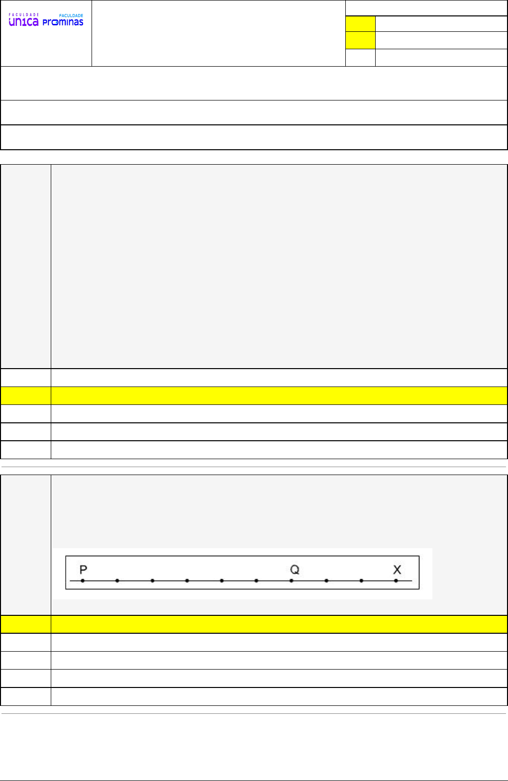 Pincel Atômico - 19/05/2024 16:23:15 1/4 LUDIMILA LAGE DRUMOND DE CARVALHO CAMINHO DO CONHECIMENTO Atividade finalizada em 19/05/2024 16:23:13 (tentativa: 2) LEGENDA Resposta correta na questão # Resposta correta - Questão Anulada X Resposta selecionada pelo Aluno Disciplina: GEOMETRIA: FUNDAMENTOS E MÉTODOS DE ENSINO E PRÁTICAS PEDAGÓGICAS [capítulos - 2] - Avaliação com questões, com o peso total de 1,67 pontos Turma: Segunda Graduação: Segunda Graduação 6 meses - Licenciatura em Matemática - Grupo: FPD-NOVEMBRO/2023 - SGegu0A211123 [107152] Aluno(a): 91158314 - LUDIMILA LAGE DRUMOND DE CARVALHO - Respondeu 8 questões corretas, obtendo um total de 1,67 pontos como nota Questão 001 Não há dúvidas que os instrumentos e as técnicas utilizados nas construções geométricas são essenciais para que os axiomas e postulados da Geometria Euclidiana Plana sejam preservados e os objetos desenhados sejam, de fato, representativos das ideias abstratas e lógico-dedutivas subjacentes. Considere as seguintes afirmativas e julgue-as como verdadeiras (V) ou falsas (F): ( ) Com os ângulos disponíveis no par de esquadros é possível substituir um transferidor na medição de qualquer ângulo. ( ) Por usarem medidas internacionalmente aceitas, os instrumentos de desenho geométrico são adequados para construções mais simples em que a técnica axiomática precisa ser utilizada. ( ) Apenas uma régua graduada é suficiente para construir retas perpendiculares. Um compasso não é um instrumento adequado para fornecer a leitura direta de medidas, apesar de ser um instrumento utilizado para transportá-las. A sequência correta que preenche as lacunas é: A) F – V – V – V. X B) F – V – F – V. C) V – V – F – V. D) V – V – V – V. E) F – F – F – V. Questão 002 (VUNESP/2021/Engenheiro - adaptada) O segmento de reta da figura representa um trecho de uma estrada. Os pontos destacados dividem o segmento de reta em intervalos congruentes. Esses pontos são os marcos quilométricos onde serão colocadas algumas placas. O ponto P representa o marco 5 e o ponto Q, o marco 89. Nessa representação, o marco correspondente ao ponto X é: X A) 131,0. B) 125,0. C) 127,5. D) 139,4. E) 123,9. Pincel Atômico - 19/05/2024 16:23:15 2/4 Questão 003 Analise a seguinte figura. Nela, representamos alguns segmentos de reta. Considerando-se esses segmentos de reta representados e as relações existentes entre eles, pode-se afirmar que: A) ⊂ , pois são segmentos consecutivos. B) ⊃ , pois são segmentos consecutivos. X C) e são segmentos consecutivos. D) e são segmentos consecutivos e colineares. E) e são segmentos colineares. Questão 004 Considere os axiomas de medição de segmentos. Tendo em vista que a todo segmento de reta corresponde um número maior ou igual a zero (ou seja, um número que corresponde ao comprimento ou à distância entre os pontos que definem um segmento de reta) e que os extremos que definem um segmento possuem correspondência biunívoca com os números reais, podemos afirmar que: A) Se os extremos de um segmento são distintos, o módulo entre eles sempre será negativo, especialmente se considerarmos a diferença da coordenada menor pela maior. B) Se dois pontos pertencentes a um segmento coincidem, eles têm coordenadas desconhecidas ou indeterminadas. X C) Conhecendo-se os dois extremos de um segmento, obtém-se o comprimento por meio do módulo da diferença entre as coordenadas desses pontos. D) Com quaisquer pontos de um segmento de reta é possível obter a distância entre os extremos desse segmento considerado originalmente. E) Se dois pontos pertencentes a um segmento coincidem, eles têm coordenadas distintas. Questão 005 Decorre dos axiomas de medição de segmentos a definição de que “o ponto médio C de um segmento AB é um ponto deste segmento tal que ” e o teorema de que “um segmento tem exatamente um ponto médio”. Logo, é possível determinar, de forma única, a coordenada ou o número real que corresponde ao ponto médio de um determinado segmento de reta. Considere a seguinte figura: Sabendo que A e B são os pontos extremos desse segmento, a coordenada x do ponto médio C (ou número real associado) de é: Pincel Atômico - 19/05/2024 16:23:15 3/4 A) 16. B) 24. X C) 26. D) 31. E) 12. Questão 006 Com o apoio de alguns instrumentos de desenho, é possível esboçar algumas construções elementares utilizando-se, para tal, a técnica axiomática que permite que os desenhos fiquem, adequadamente, de acordo com o que preconiza as leis da Geometria Euclidiana Plana. É importante assumir como premissa as propriedades dos instrumentos utilizados como os ângulos dos esquadros, a linearidade da régua ou a circularidade da volta do compasso, por exemplo. A seguir, um conjunto de retas foi construído. Observe-o: Nesse conjunto, as retas r, s e t são paralelas entre si. As retas x, y e z são paralelas entre si também e perpendiculares às retas r e t, respectivamente. Para fazer essa construção, é possível afirmar que, seguramente, os seguintes instrumentos de desenho foram utilizados: A) apenas uma régua milimetrada. B) apenas um compasso. C) apenas lápis e borracha. X D) par de esquadros ou régua e um dos esquadros. E) apenas um transferidor. Questão 007 (CESGRANRIO/2016/Petrobras - adaptada) Considere a construção geométrica descrita a seguir. Com alguma inclinação sobre o segmento de reta AB dado, traça-se uma semirreta auxiliar s, com origem num dos extremos A ou B. Sobre esse segmento auxiliar, e a partir da origem escolhida, marcam-se comprimentos iguais, com uma abertura qualquer de compasso, de acordo com o número (n) de divisões desejadas, achando-se os pontos 1, 2, 3, ... , n. Une-se o último ponto marcado com o outro extremo do segmento de reta AB e traçam-se paralelas a essa linha que passam pelos pontos marcados na semirreta auxiliar s. Após realizar esse procedimento descrito,