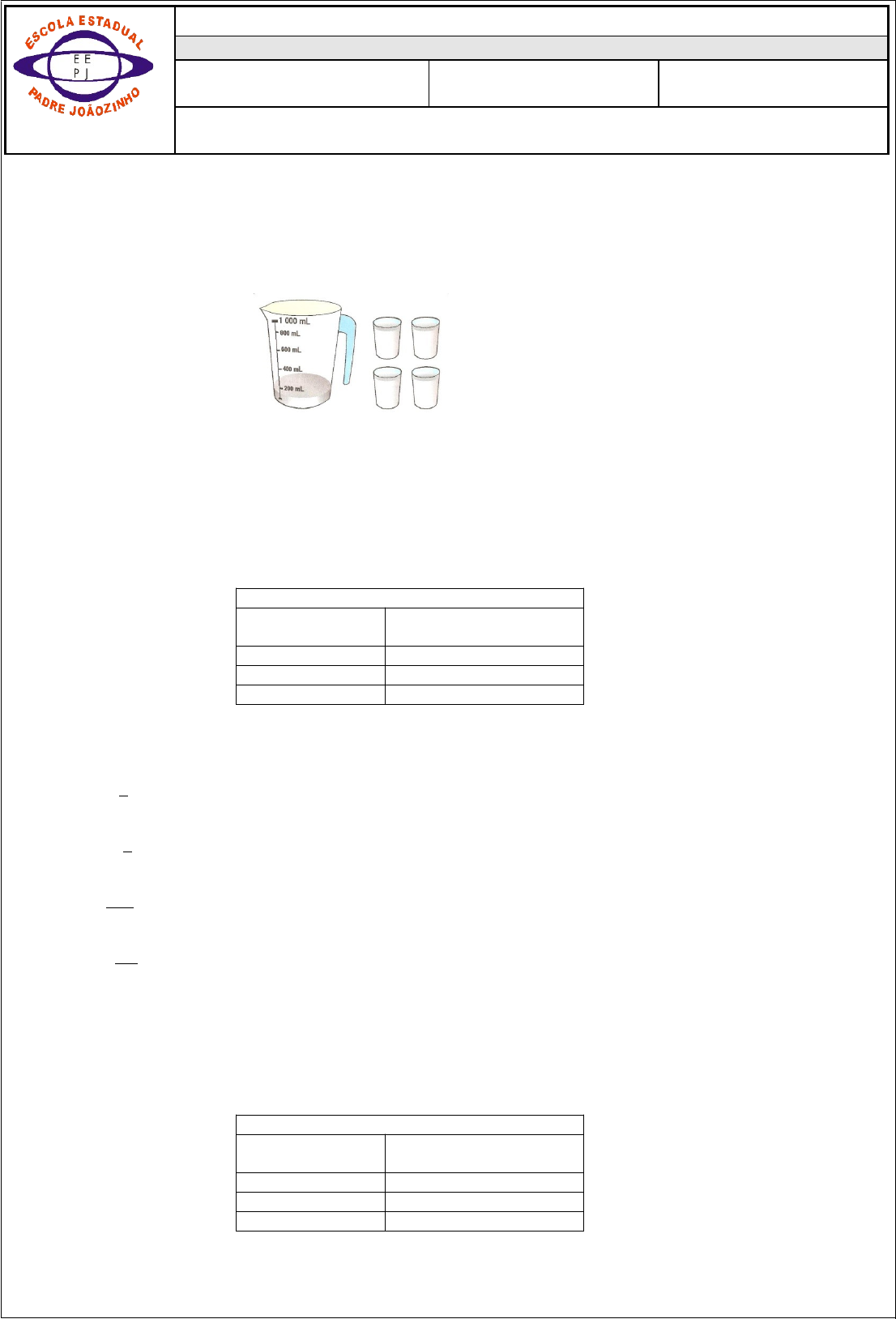 40 anos ESCOLA ESTADUAL “PADRE JOÃOZINHO” Avaliação diagnóstica –Valor: pontos–__/__/2024 Componente curricular: MATEMÁTICA Professor: ROSANGELA 7° ANO _ Estudante:____________________________________________________________ 1) (EF06MA10MG) A jarra da figura tinha 1litro de leite. Sílvia colocou a mesma quantidade de leite em cada um dos 4 copos representados na figura e ainda ficaram na jarra 100 ml de leite. Quantos mililitros de leite foram colocados em cada copo? A ( ) 200 ml B ( ) 225 ml C ( ) 250 ml D( ) 300ml 2) (EF06MA09AMG) A tabela a seguir mostra o resultado de uma pesquisa realizada com os alunos do 7º ano. Filmes preferidos pelo 6º ano Tipo de filme Quantidade de alunos Aventura 30 Romântico 10 Comédia 10 Qual é a fração que representa o número de alunos que preferem filme romântico em relação ao total de alunos pesquisados? A( ) 1 5 B( ) 2 5 C( ) 10 20 D( ) 20 30 3) (EF06MA44MG) A tabela a seguir mostra o resultado de uma pesquisa realizada com os alunos do 7º ano. Filmes preferidos pelo 6º ano Tipo de filme Quantidade de alunos Aventura 30 Romântico 10 Comédia 10 Na forma de porcentagem, quantos alunos preferem filme de aventura? A( ) 20% B( ) 30% C( ) 50% D( ) 60% 4) (EF06MA43MG) Na escola Crescendo e Aprendendo, o número de meninos representa 3/8 do número total de alunos. Se há 300 meninas, quantos são os números de meninos? A( ) 60 B( ) 180 C( ) 240 D( ) 480 5) (EF06MA44MG) Veja a ilustração que mostra as moedas que Joaquim tem. Ele quer trocar essas moedas por notas de R$ 1,00. Com quantas notas de R$ 1,00 Joaquim ficará? A( ) 2. B( )3 C( )4 D( ) 5 6) (EF06MA41MG) 7) Verifique as somas em cada linha, cada coluna e cada diagonal do quadro abaixo. Pode-se concluir que: A( ) apenas nas linhas os resultados são iguais. B( ) apenas nas colunas os resultados são iguais. C( ) apenas nas diagonais os resultados são iguais. D( ) todos os resultados são iguais. 7) (EF06MA40MG) Observe o anúncio: Quanto pagarei pela compra do conjunto de malas? A( ) R$ 267,20 B( ) R$ 295,35 C( ) R$ 451,25 D( ) R$ 500,25 8) (EF06MA40MG) Observando a figura abaixo, qual é a altura da menina? A( )1,09m B( )2,00m C( )2,07m D( )0,49m 09)( EF06MA09BMG) O relógio assinala dois momentos: o do início e o do final de um filme. início final Quanto tempo durou esse filme? A( ) 1:45 h B( ) 1:35 h C( ) 2:05 h D( ) 1:25 h 10) (EF06MA41MG) Inês comprou um fogão que custou R$ 480,00. Ela vai pagar esse fogão em 6 prestações iguais. Qual será o valor de cada prestação? A( ) R$ 8,00 B( ) R$ 70,00 C( ) R$ 80,00 D( ) R$ 486,00 Boa Prova! Rosangela image5.png image6.png image7.png image8.jpeg image1.png image2.jpeg image3.png image4.emf