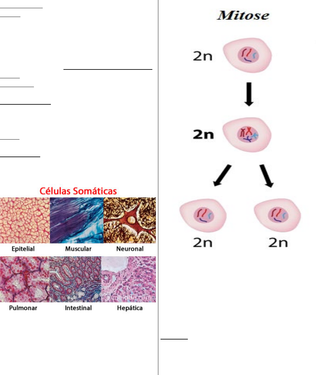 Instituto de Ciências da Saúde Biologia, Histologia e Embriologia 1 Ciclo Celular e Gametogênese O Ciclo Celular Células: capazes de crescer e se reproduzir. Eucariontes: aumento quantitativo e coordenado dos milhares de tipos de moléculas e seu material genético. Partição do núcleo e citoplasma em duas células- filhas. Processo denominado ciclo de divisão celular ou ciclo celular. Embriologia: zigoto inicia duplicações celulares sucessivas ao longo do desenvolvimento. Células somáticas: responsáveis pela formação de tecidos e órgãos em organismos multicelulares. Engloba todas as células diploides (2n) do organismo. Replicam-se apenas por um processo denominado de mitose e que, portanto, não estão envolvidas diretamente na reprodução. Corpo humano: cerca de cem trilhões de células. Processo de crescimento de um tecido, órgão ou o organismo como um todo se dá pela multiplicação do número de células, não pelo crescimento destas. Uma das principais propriedades celulares é manter o volume constante. Divisões celulares continuam frequentemente por toda a vida. Processo responsável pela reposição de células mortas e regeneração. Apoptose: processo fisiológico normal de morte celular programada. Desenvolvimento e a manutenção de tecidos e órgãos dependem de um balanço constante entre proliferação e morte celular. Instituto de Ciências da Saúde Biologia, Histologia e Embriologia 2 Formação de novas células nem sempre ocorre por meio do ciclo celular. Células germinativas: processo de divisão de células somáticas específicas (presentes nas gônadas masculinas e femininas) que dão origem à gametas. Gametas carregam somente a metade do número de cromossomos (haploides – n) presentes nas células somáticas. Processo reducional de divisão celular denominado meiose. Meiose: Processo pelo qual um célula pré-existente dá origem a células diferentes dela própria e diferentes entre si. Meiose gera uma fase haploide da vida dos organismos. Fecundação: reestabelece a fase diploide com a fusão de dois gametas haploides (fertilização). Instituto de Ciências da Saúde Biologia, Histologia e Embriologia 3 Mitose – Etapas do Ciclo Celular Ciclo Celular: compreende os processos que ocorrem desde a formação de uma célula até sus própria divisão em duas células-filhas, todas iguais entre si. Dividido em duas grandes etapas: - 1º etapa: período entre duas divisões sucessivas, crescimento celular e preparação para nova divisão – intérfase. - 2º etapa: divisão propriamente dita, originam duas células-filhas. divisão do núcleo (cariocinese) ou mitose seguida pela divisão do citoplasma (citocinese). Crescimento e divisão celular são coordenados e regulados para que ocorra em equilíbrio. Tamanho celular das células filhas deve ser compensado durante o crescimento celular. Duração do ciclo deve se ajustar perfeitamente ao tempo que a célula necessita para dobrar de tamanho. Eucariontes: controle realizado através de fatores genéticos, nutrientes e fatores de crescimento. Intérfase Fase que ocorre a duplicação dos componentes da célula-mãe, inclusive a duplicação do DNA (pré- requisito para que a divisão ocorra). A duplicação do DNA está situada em um período intermediário da intérfase. Intérfase é dividida em quatro fases: G1, S, G2 e M. Fase S: duplicação ou síntese do DNA. Fases G1 e G2: gap (intervalo). G1: intervalo de tempo que transcorre entre o fim da mitose (M) até o início da síntese de DNA (S). Período pós-mitótico ou pré-sintético. Instituto de Ciências da Saúde Biologia, Histologia e Embriologia 4 G2: intervalo entre o término da síntese de DNA e a próxima mitose. Período pós-sintético ou pré- mitótico. Cerca de 95% do ciclo celular se passa na intérfase, mas o tempo total dessa fase varia conforme o tipo celular, condições fisiológicas (idade, disponibilidade de hormônios e fatores de crescimento, temperatura, pressão osmótica, hidrostática, oxigênio e ciclo circadiano. Mitose: subdividida em quatro etapas: prófase, metáfase, anáfase e telófase. Prófase (pro = primeira): caracteriza-se pela condensação gradual das fibras de cromatina. Cromatina: complexo de DNA, RNA, e proteínas que se encontra dentro do núcleo celular nas células eucarióticas. Alcançam um nível de condensação de até 1.000 vezes superior ao estado original. Torna os cromossomos visivelmente individualizados ao final da fase. Metáfase (meta = metade): cromossomos atingem um grau avançado de condensação. Cromátides se tornam totalmente visíveis ao microscópio óptico. Alinhamento dos cromossomos na região equatorial da célula. Formação do fuso mitótico: fibras (microtúbulos) originadas a partir dos centríolos que ligam diretamente aos cromossomos. Anáfase (ana = movimento): início dos eventos finais da mitose. Separação e migração das cromátides-irmãs (cromossomos-filhos). Encurtamento dos microtúbulos aproximam os cromossomos-filhos dos polos celulares. Ao final dessa fase se inicia o reestabelecimento do envoltório nuclear, agora um em cada extremidade da célula, envolvendo os cromossomos. Instituto de Ciências da Saúde Biologia, Histologia e Embriologia 5 Telófase (telos = fim): tem início quando os cromossomos atingem os polos e ocorre o desaparecimento dos microtúbulos. Reconstituição total dos núcleos e a divisão citoplasmática (citocinese). Descondensação da cromatina e reconstituição da membrana plasmática dando origem a duas células- filhas. Meiose – Fundamental para a reprodução sexuada Mitose: ciclo de divisão celular de células somáticas. Resulta na produção de duas células-filhas com mesmo número de cromossomos (células diploides – 2n). Meiose: células germinativas que dão origem à gametas/esporos (gametogênese). Divisão celular de uma célula germinativa diploide (2n) em duas células haploides (n).
