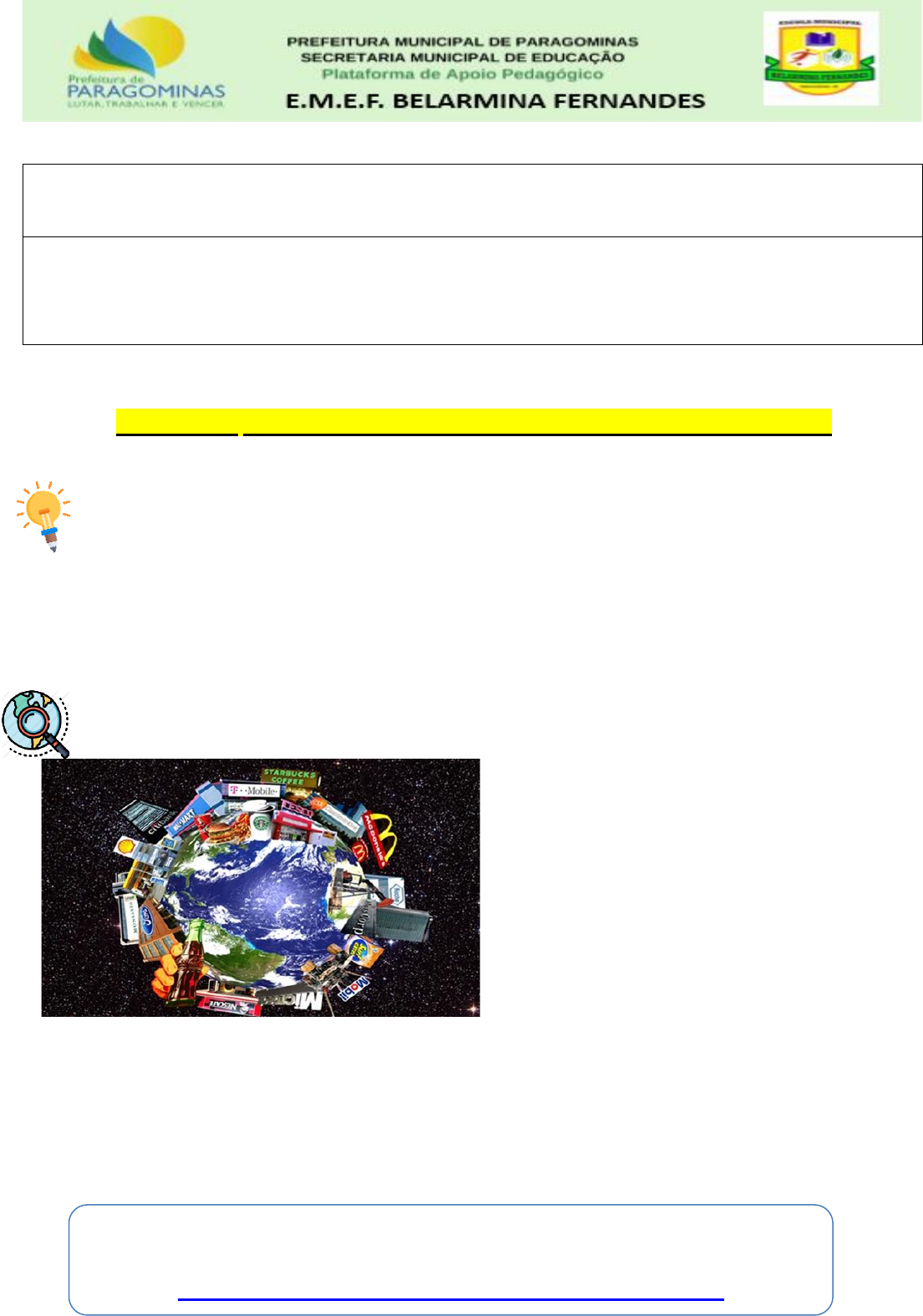 Etapa de Ensino: 9ª ano Data: ______/_______/2021 Professor (a): Piera Amora Área de Conhecimento: Geografia Unidade Temática: Conexões e escalas Objeto do conhecimento: Corporações e organismos internacionais Habilidades: (EF09GE02) Analisar a atuação das corporações internacionais e das organizações econômicas mundiais na vida da população em relação ao consumo, à cultura e à mobilidade. Atividade: 06 Nome do Aluno(a):..................................................................................................Turma:.................. ASSUNTO: ASSUNTO: ECONOMIA GLOBAL: TRANSNACIONAIS Provocando o conhecimento: Você sabia que muitas coisas que consumimos em nosso dia a dia não foram produzidas no Brasil? Hoje devido ao processo de mundialização estamos consumindo cada vez mais produtos importados (músicas, roupas, comidas, aparelhos eletrônicos). Explorando o conhecimento: As pessoas se alimentam, se vestem, moram, se comunicam, se divertem, por meio de bens e serviços mundiais, utilizando mercadorias produzidas pelo capitalismo mundial globalizado, produzidas em vários locais no mundo. Imagine que você vá com seus amigos comer um sanduiche e tomar Coca-Cola no Mc Donald’s. em seguida, assiste um filme de Steven Spielberg “E.T. – O Extraterrestre” e volta para casa num ônibus da marca Mercedes. Ao chegar em casa, liga seu aparelho de TV Philips para assistir Netflix e, em seguida deve ouvir uma música internacional em sua caixa de som JBL. Perceba quantas empresas transnacionais, ou seja, empresas que atuam em quase todos os países do mundo, estiveram presentes nesse seu curto programa de algumas horas. Para compreender melhor o assunto estudado nessa atividade, acesse o link abaixo e assista o vídeo com atenção. https://www.youtube.com/watch?v=9W4BclX6p-s https://www.youtube.com/watch?v=9W4BclX6p-s Rua Santa Helena, s/ nº, Paragominas Pará. Praticando conhecimento: 1 – O que são empresas transnacionais? Empresas que estão presentes em vários países do mundo. Empresas que só estão presentes no Brasil 2 – Todas as logomarcas abaixo são de empresas transnacionais. Observe atentamente as imagens e circule aquelas empreses que foram citadas no texto. 3 – Com a ajuda de seu responsável observe os objetos que tem em sua casa diga o nome do objeto, a marca e o país em que foi produzido. Objeto Marca País que foi produzido Exemplo: Televisão Sony Japão . Por hoje encerramos mais um assunto geográfico, espero que tenham gostado. Eu gostaria de acompanhar a sua evolução nas atividades, se estiver com dúvidas entre em contato comigo através do meu WhatsApp (998100858) ou e-mail prof.pieraamora@gmail.com Tchauzinho, até a próxima!