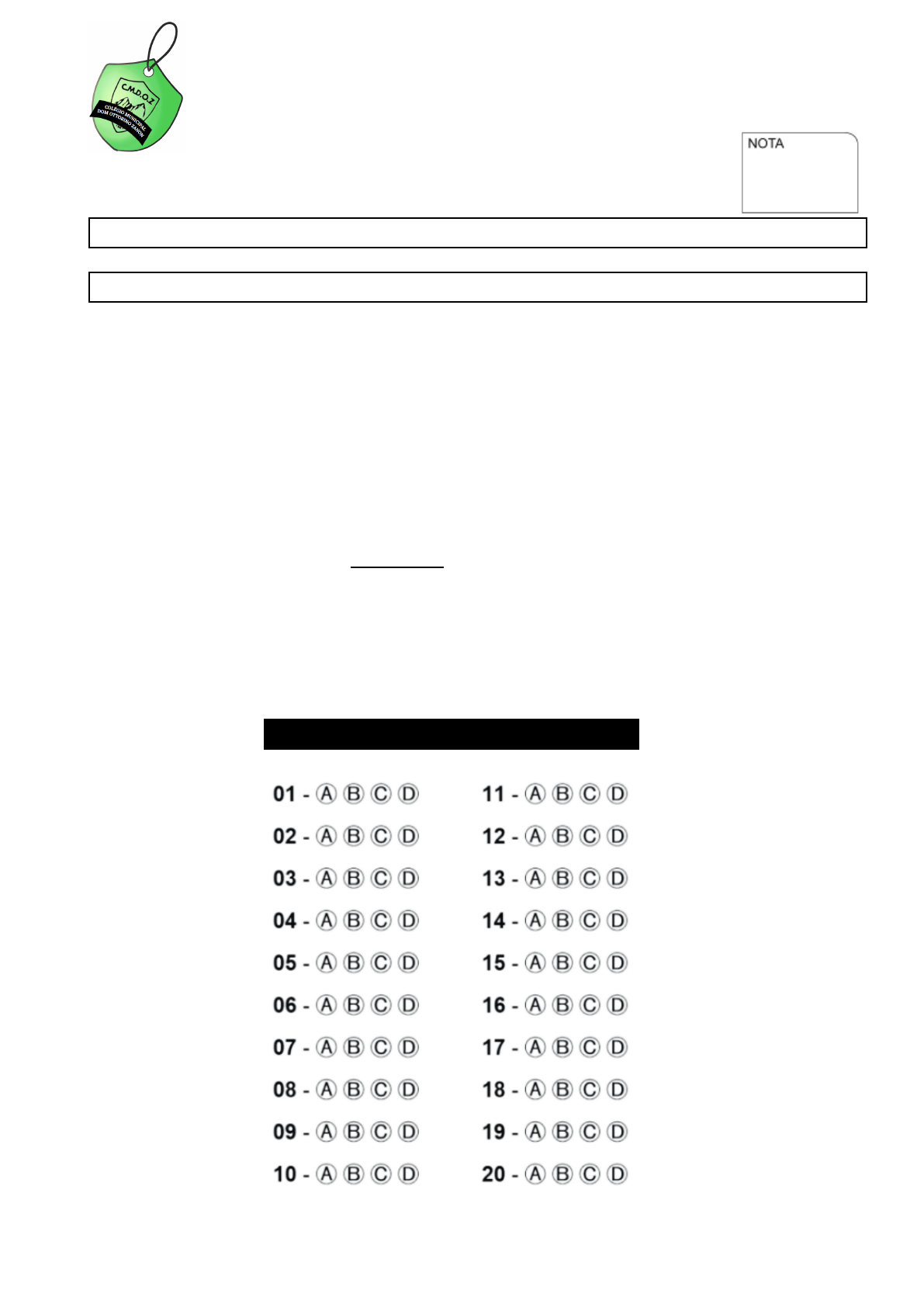 Secretaria Municipal de Educação de Itatiaia Colégio Municipal Dom Ottorino Zanon Aluno (a): Professora: Data: ______/______/____________ Turma: _______________ VALOR: 100 pontos RECUPERAÇÃO BIMESTRAL DE CIÊNCIAS OBSERVAÇÕES IMPORTANTES: ● São 4 (quatro) opções, mas SOMENTE 1 (uma) está correta. ● Marque a letra da resposta certa no caderno de resposta. ● Pinte completamente a letra da resposta certa no gabarito abaixo: Boa prova! GABARITO Questão 1: Assim como mostra a imagem abaixo, como é chamado esse processo que os vegetais precisam realizar para fabricar o seu próprio alimento? (5 pontos) A. Clorofila. B. Pigmento verde. C. Gás carbônico. D. Fotossíntese Questão 2: Além da água e os sais minerais que são retirados do solo através da raiz, qual outro elemento é ESSENCIAL para que aconteça a fotossíntese (5 pontos) A. O fogo. B. A pedra. C. A luz solar. D. O vento. Questão 3: Na fotossíntese, os vegetais absorvem o gás ______________ e liberam gás __________ para o meio ambiente. (5 pontos) As palavras que completam, respectivamente, o trecho são: A. hidrogênio e carbônico. B. oxigênio e nitrogênio. C. carbônico e oxigênio. D. nitrogênio e carbônico. Questão 4: Qual das atitudes abaixo é necessária para a colaboração do meio ambiente? (5 pontos) A. Deixar a torneira derramando água apenas. B. Queimar papéis e plásticos somente nos lixões. C. Jogar lixo nos rios, mas recolher assim que possível. D. Realizar plantio de árvores em ambientes externos. Questão 5: As plantas promovem abrigo para uma série de seres vivos e estão relacionadas com outras funções importantes, como a liberação de oxigênio para a atmosfera e a captação de gás carbônico. Logo, para que essas plantas sobrevivam é necessária a existência de. (5 pontos) A. Solo, vento e frio. B. Vento, neve e calor. C. Clima, calor e neve. D. Água, ar e sol. 1 Questão 6: Existe uma estrutura na planta que a sustenta e serve de passagem para que os nutrientes cheguem a todas suas partes. A outra parte de sua estrutura tem a função de fixar a planta no solo e absorver os nutrientes e sais minerais que alimentam a planta. (5 pontos) O texto fala, respectivamente: A. da folha e da raiz. B. do caule e da raiz. C. da raiz e da flor. D. da folha e da flor. Questão 7: A fotossíntese é um dos processos mais importantes da natureza, é nela que acontece a produção de energia nas plantas. Marque a alternativa que mostra a forma correta como ocorre a fotossíntese: (5 pontos) A. A raiz capta a luz solar e absorve o gás carbônico do ar para conseguir retirar a água e os sais minerais do solo. B. b) As raízes das plantas absorvem a água e os sais minerais do solo. Nas folhas, a clorofila capta a luz solar e absorve o gás carbônico do ar. C. c) As folhas captam a luz solar e absorvem o gás oxigênio para conseguirem retirar a água e os sais minerais do solo. D. d) As folhas das plantas absorvem a água e os sais minerais do solo. Depois, libera o gás carbônico no ar. Questão 8: Sem a fotossíntese, não existiria vida em nosso planeta, pois é através dela que se iniciam todas as cadeias alimentares. A medida em que a planta produz seu alimento, ela elimina um gás essencial para os seres vivos que é chamado de: (5 pontos) A. nitrogênio. B. hidrogênio. C. carbono. D. oxigênio. Questão 9: As _________________ são responsáveis por DAR ORIGEM às novas plantas: (5 pontos) A. raízes. B. sementes. C. folhas. D. flores. Questão 10: Com a ajuda das abelhas, beija-flores, insetos e outros, as _________________ são as REPRODUTORAS das plantas. (5 pontos) A. raízes. B. sementes. C. folhas. D. flores. 2 Questão 11: Quando um ser vivo é capaz de produzir seu próprio alimento ele é chamado de: (5 pontos) A. consumidores. B. produtores. C. decompositores. D. nenhuma das anteriores. Questão 12: Dentre os seres desenhados na cadeia alimentar abaixo, qual deles corresponde a um produtor? (5 pontos) A. O humano. B. A alface. C. A galinha. D. A lagarta. Questão 13: Sobre os produtores, é CORRETO afirmar que: (5 pontos) A. são seres que se alimentam de outros seres. B. são seres considerados a base da cadeia alimentar. C. são seres que se alimentam dos consumidores. D. são seres desnecessários na cadeia alimentar. Questão 14: Observe a cadeia alimentar abaixo: (5 pontos) PLANTA – COELHO – COBRA – GAVIÃO O gavião pertence a qual nível da cadeia alimentar? A. Produtor. B. Consumidor. C. Decompositor. D. Recompositor. Questão 15: Os decompositores são organismos que aproveitam os restos da matéria morta de outros seres e finalizam o ciclo dentro da cadeia alimentar, assim sendo, qual dos seres abaixo pertencem este grupo (5 pontos) A. Plantas e coelho B. Fungos e bactéria C. Humano e cobra D. Rato e aves Questão 16: Na representação da cadeia alimentar acima, a cobra é considerada um ser: (5 pontos) A. herbívoro. B. decompositor. C. produtor. D. consumidor. 3 Questão 17: Observe a imagem abaixo. Nesta cadeia alimentar, os seres consumidores são: (5 pontos) A. a planta e o gafanhoto. B. o gafanhoto e o sapo. C. a planta e os fungos. D. o sapo e os fungos. Questão 18:Marque um X na resposta correta sobre os produtores: (5 pontos) A. Na cadeia alimentar as plantas são consideradas decompositores. B. As algas e a maioria das plantas são consideradas produtores. C. As plantas são consideradas consumidores por se alimentarem de outros seres vivos. D. As plantas não fazem parte da cadeia alimentar. Questão 19: O animal que come a carne de outro animal é chamado de carnívoro. podemos dizer que é um animal carnívoro. (5 pontos) A. o cupim. B. a abelha. C. o tubarão. D. a borboleta. Questão 20: Em uma teia alimentar, os organismos produtores são aqueles. (5 pontos) A. que realizam a decomposição da matéria orgânica. B. que são capazes de sintetizar seu próprio alimento. C. que se alimentam de plantas. D. que se alimentam de an