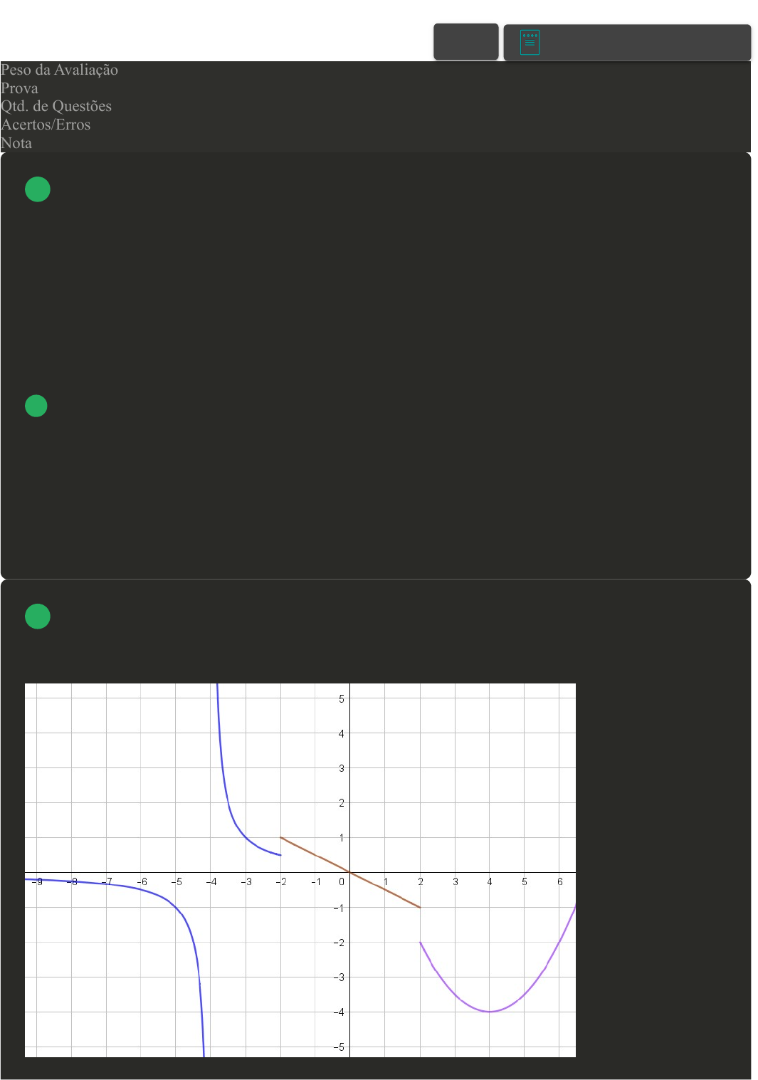 Prova Impressa GABARITO | Avaliação I - Individual (Cod.:957203) Peso da Avaliação 2,00 Prova 80866160 Qtd. de Questões 10 Acertos/Erros 10/0 Nota 10,00 Na matemática, o limite tem o objetivo de determinar o comportamento de uma função à medida que ela se aproxima de alguns valores, sempre relacionando os pontos x e y. Essa noção é aplicada em diversos campos, desde o cálculo diferencial e integral até a análise de séries numéricas. Desta forma, classifique V para as sentenças verdadeiras e F para as falsas: ( ) A utilização de limites é restrita apenas a funções lineares. ( ) É possível calcular o limite de uma função mesmo quando ela não é contínua. ( ) A existência do limite de uma função em um ponto implica necessariamente na existência da própria função naquele ponto. ( ) limite de uma função sempre corresponde ao valor exato da função em um determinado ponto. Assinale a alternativa que apresenta a sequência CORRETA: A F – V – F – F. B V – F – F – V. C V – F – V – V. D F – V – V – F. A representação gráfica de uma função nos permite visualizar e compreender o comportamento do limite de uma função à medida que se aproxima de um determinado valor, fornecendo uma perspectiva intuitiva sobre o seu comportamento em relação a esse valor específico. Observe a ilustração gráfica de uma função: VOLTAR A+ Alterar modo de visualização 1 2 29/04/2024, 21:55 Avaliação I - Individual about:blank 1/5 Acerca do desta ilustração, analise as sentenças a seguir: I. O limite da função é -1 quando x tende a 2 pela esquerda. II. O limite da função é infinito positivo quando x tende a -4. III. O limite da função não existe quando x tende ao infinito negativo. IV. O limite da função é 1 quando x tende a -2 pela direita. Assinale a alternativa CORRETA: A As sentenças I e IV estão corretas. B As sentenças II e IV estão corretas. C As sentenças I e III estão corretas. D As sentenças I, III e IV estão corretas. Um agricultor está estudando o crescimento de uma determinada cultura em sua plantação. Após realizar diversas medições, ele concluiu que a altura da planta, em metros, é dada por uma função H(t), onde t representa o tempo decorrido em dias após o plantio da muda no local específico para o seu desenvolvimento completo. A função H(t) é definida da seguinte forma: Com base nela, podemos aferir dois principais dados, a altura ideal para o plantio da muda (t = 0) e a altura máxima atingida pela planta (utilizando t tendendo ao infinito). Desta forma, analise cada uma das sentenças a seguir, referentes a esse assunto: I. A Altura máxima atingida pela planta é de 1,20 m. II. Podemos determinar a altura máxima, utilizando os limites laterais. III. A altura ideal para o plantio da muda é de 8 cm. IV. A função H(t) não possui um limite definido quando t tende ao infinito. Assinale a alternativa CORRETA: A Somente as sentenças II e IV estão corretas. B Somente as sentenças II e III estão corretas. C Somente as sentenças I e III estão corretas. D Somente as sentenças I, III e IV estão corretas. Em matemática, uma função é contínua quando, intuitivamente, pequenas variações nos objetos correspondem a pequenas variações nas imagens. Nos pontos onde a função não é contínua, diz-se que a função é descontínua, ou que se trata de um ponto de descontinuidade. Determine o ponto de descontinuidade da função: A O ponto é x = -1. B O ponto é x = 3. C O ponto é x = 7. D O ponto é x = 10. 3 4 29/04/2024, 21:55 Avaliação I - Individual about:blank 2/5 Formulário - Cálculo Diferencial e Integral (MAD) - PauloClique para baixar o anexo da questão As assíntotas horizontais e verticais são linhas imaginárias que se aproximam infinitamente de uma função, descrevendo seu comportamento no infinito e auxiliando na compreensão de limites e tendências em matemática. Sobre a função , classifique V para as sentenças verdadeiras e F para as falsas: ( ) Não possui assíntota horizontal. ( ) Possui três assíntotas verticais. ( ) Há uma assíntota horizontal x = 0. ( ) Há apenas uma assíntota horizontal. Assinale a alternativa que apresenta a sequência CORRETA: A V – F – F – F B F – V – V – V C F – V – F – V D V – F – V – F O conceito de limites inaugura, dentro da história da ciência, um novo paradigma, em que as análises científicas ganham um grau de abstração muito maior. Podemos perceber esse fato na definição de infinito. Nesse sentido, vamos retomar os cálculos relacionados aos limites no infinito. Calcule o valor do limite representado a seguir: Acerca do resultado, assinale a alternativa CORRETA: A O limite é 12. B O limite é 6. C O limite é 0. D O limite é 16. Em determinadas situações, desejamos estudar o comportamento de uma função quando seu argumento se aproxima (ou "tende") de um valor determinado. É importante também, por vezes, entender o comportamento de uma função quando seu argumento tende ao infinito (ou a menos infinito) para termos conhecimento do seu comportamento depois de um tempo muito longo (também chamado de regime permanente). Nessas situações, devemos usar o cálculo de limites. Calcule, se existir, o limite para quando x tende a infinito da função a seguri: f(x) = 1 / (2x + 3). Acerca do resultado, assinale a alternativa CORRETA: A Não existe limite para essa função quando x tende a infinito. 5 6 7 29/04/2024, 21:55 Avaliação I - Individual about:blank 3/5 B 0. C - infinito. D Infinito. Em determinadas situações, desejamos estudar o comportamento de uma função quando seu argumento se aproxima (ou "tende") de um valor determinado. Por vezes, temos a intenção de analisar propriedades de uma função, como, por exemplo, as assíntonas (vertical ou horizontal) e pontos de descontinuidade. Nessas situações, devemos usar o cálculo de limites. Seja f a função definida por