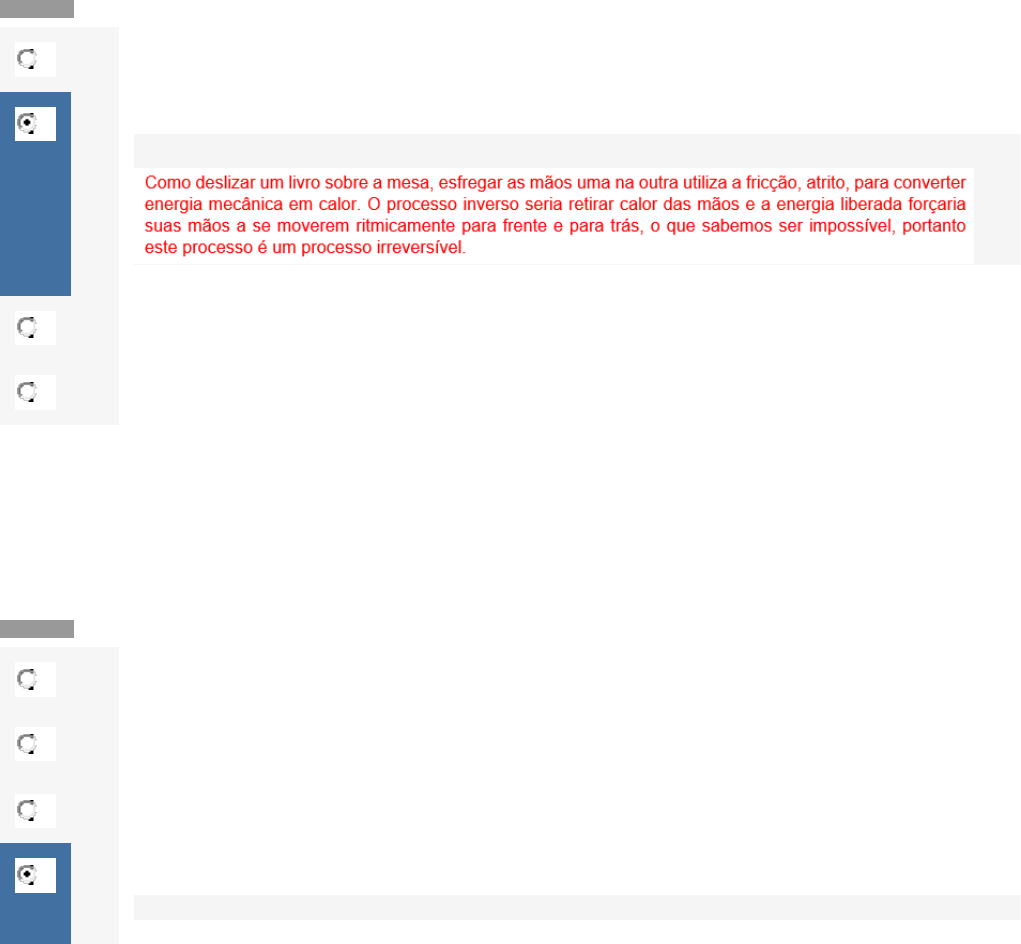 Questão 1/10 - Física- Termodinâmica e Ondas A sua mão direita e a sua mão esquerda normalmente estão a mesma temperatura. Ao esfregar as mãos uma na outra para aquece-las é um processo: Nota: 10.0 A Reversível B Irreversível Você acertou! C Adiabático D Cíclico Questão 2/10 - Física- Termodinâmica e Ondas Suponha que, numa escala de temperatura X, a água ferva a -53,5 ºX e congele a -170 ºX. Qual o valor de 340 K, na escala X? Qual o valor de 340 K, na escala X? Assinale a alternativa correta: Nota: 10.0 A - 34,8 ºX B - 78,7 ºX C - 88,3 ºX D - 91,9 ºX Você acertou! Questão 3/10 - Física- Termodinâmica e Ondas O sistema descrito na figura passa por 4 caminhos termodinâmicos diferentes. Cada processo é representado em um diagrama PV como uma linha partindo do estado inicial 1 e terminando no estado final 2. Qual dos processos possui menor trabalho realizado pelo sistema? Nota: 10.0 A 1 -> 3 -> 2 B 1 -> 3 -> 4 -> 2 C 1 -> 2 D 1 -> 5 -> 2 Você acertou! Questão 4/10 - Física- Termodinâmica e Ondas Calcular o rendimento teórico máximo de uma máquina a vapor cujo fluído entra a 400ºC e abandona 105ºC. Assinale a alternativa correta: Nota: 10.0 A 12,8% B 34,8% C 43,8% Você acertou! D 59,9% Questão 5/10 - Física- Termodinâmica e Ondas Qual o trabalho realizado por um gás ao se expandir tendo o volume inicial de 3 litros e cuja temperatura cresce de 27 ºC para 227 ºC, supondo ser a pressão externa constante de 2 atm? Assinale a alternativa correta: Nota: 10.0 A W = 120 J B W = 405 J Você acertou! C W = 560 J D W = 890 J Questão 6/10 - Física- Termodinâmica e Ondas Uma quantidade de gás ideal passa por uma expansão que aumenta seu volume de V1 para V2 = 2.V1. A pressão final do gás é P2. O gás realiza mais trabalho sobre seu meio ambiente se a expansão ocorre a uma pressão constante ou a uma temperatura constante? Nota: 10.0 A Pressão constante B Temperatura constante Você acertou! C A mesma quantidade de trabalho é realizada em ambos os casos D Não há informações suficiente para decidir Questão 7/10 - Física- Termodinâmica e Ondas A temperatura de 5 kg de N2 gasoso sobe de 10 ºC para 130 ºC. Determine a quantidade de calor necessário para isto. Os calores específicos do gás N2 cp = 0,248 kcal/kgK e cv = 0,177 kcal/kgK Assinale a alternativa correta: Nota: 10.0 A 100 kcal B 149 kcal Você acertou! C 209 kcal D 342 kcal Questão 8/10 - Física- Termodinâmica e Ondas Enade 2014 - O gráfico a seguir apresenta o diagrama PV (pressão-volume) de uma máquina térmica que opera com um gás ideal monoatômico. Os trechos BC e DA representam processos adiabáticos. Com base no diagrama e nas leis da termodinâmica, avalie as afirmações a seguir. I. A variação de energia interna no trecho AB é dada por ΔEintAB=32n.R.TA(PBPA−1)ΔEintAB=32n.R.TA(PBPA−1), em que n é o número de moles do gás, R é a constante dos gases ideais e TA é a temperatura no ponto A. II. No trecho BC, a variação da energia interna é dada por ΔEintBC=−WBCΔEintBC=−WBC , em que WBC é o trabalho executado pela expansão do gás. III. No trecho DA, o trabalho é executado pelo gás, o que produz a variação da energia interna. IV. No trecho CD, há aumento de energia interna do gás. V. O ciclo ABDCA tem variação de energia interna nula. É correto apenas o que se afirma em: Nota: 10.0 A I, II e III. B I, II e V. Você acertou! C I, IV e V. D II, III e IV. E III, IV e V. Questão 9/10 - Física- Termodinâmica e Ondas Calcular o rendimento teórico máximo de uma máquina a vapor cujo fluído entra a 400 ºC e abandona 105 ºC. Assinale a alternativa correta: Nota: 10.0 A 12,8 % B 34,8 % C 43,8 % Você acertou! D 59,9 % Questão 10/10 - Física- Termodinâmica e Ondas Um bloco de gelo inicialmente a 0 oC é aquecido a uma taxa constante. Um tempo t é necessário para transformar o bloco de gelo completamente em vapor d’água a 100 oC, veja o gráfico abaixo. O que temos após metade do tempo, t/2? Nota: 10.0 A Apenas gelo a 0 oC B Uma mistura de gelo e água a 0 oC C Água a uma temperatura entre 0 oC e 100 oC D Uma mistura de água e vapor a 100 oC Você acertou!