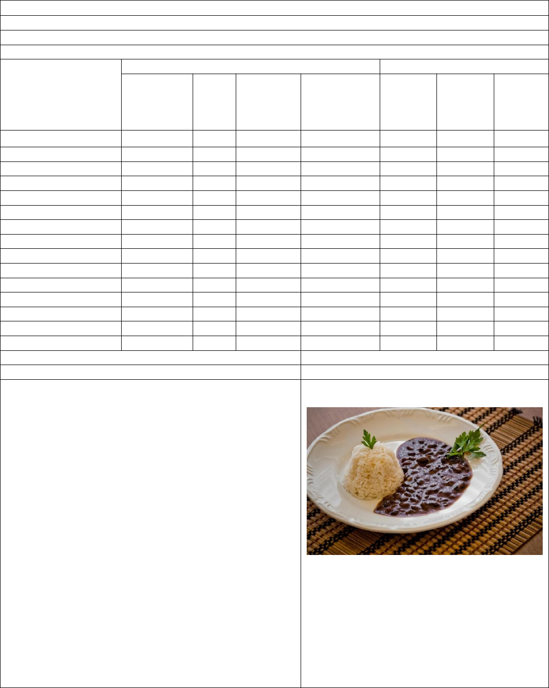 FICHA TÉCNICA Nº: 4 PREPARAÇÃO: Arroz branco e feijão preto PESO DA PREPARAÇÃO: 855,40g Nº DE PORÇÕES: 4 porções INGREDIENTES QUANTIDADE CUSTO Per Capita Líquido (g/mL) F.C* Per Capita Bruto (g/mL) Total dos ingredientes Peso Bruto (g/mL) Custo Unitário (R$)* Unidade (kg) (g) (ml) Custo Total (R$) Arroz branco Arroz branco 55g 1 55g 220g 6,76 1000g 1,49 Água 120ml 1 120ml 480ml - - - Cebola 6,85g 1,64 11,25g 45g 8,49 1000g 0,38 Azeite 3,25 1 3,25 13ml 21,75 250ml 1,13 Sal 1g 1 1g 4g 3,19 1000g 0,01 Feijão preto Feijão preto 121,36 1,03 125g 500g 9,99 1000g 4,99 Água 750ml 1 750ml 3000ml - - - Sal 1g 1 1g 4g 3,19 1000g 0,01 Cebola 13,72 1,64 22,5 90g 8,49 1000g 0,76 Alho 4,17g 1,08 4,5g 18g 19,90 1000g 0,36 Óleo 7,5g 1 7,5g 30ml 5,95 900ml 0,20 MEDIDA CASEIRA DA PORÇÃO: 2 col de servir CUSTO TOTAL: 9,33 PESO DA PORÇÃO: 213,85 CUSTO PER CAPITA: 2,33 MÉTODO DE PREPARO E COCÇÃO Arroz: 1. Descasque e pique fino a cebola. Numa chaleira, leve um pouco mais de 2 xícaras (chá) de água ao fogo baixo, até ferver. 2. Leve uma panela média ao fogo baixo. Quando aquecer, regue com o azeite e acrescente a cebola. Tempere com uma pitada de sal e refogue por cerca de 2 minutos, até murchar. 3. Acrescente o arroz e mexa bem para envolver todos os grãos com o azeite por cerca de 1 minuto – isso ajuda a deixar o arroz soltinho depois de cozido. 4. Meça 2 xícaras (chá) da água fervente e regue o arroz. Tempere com o sal, misture bem e aumente o fogo para médio, não mexa mais. 5. Assim que a água atingir o mesmo nível do arroz, diminua o fogo e tampe parcialmente a panela. Deixe cozinhar até que o arroz absorva toda a água – para verificar se a água secou, fure o arroz com um garfo e afaste delicadamente alguns grãos do fundo da panela; se ainda estiver molhado, deixe cozinhar mais um pouquinho. 6. Desligue o fogo e mantenha a panela tampada por 5 minutos antes de servir para que os grãos terminem de cozinhar no próprio vapor. Em seguida, solte os grãos com um garfo, transfira para uma tigela e sirva quente. 7. 8. Feijão: 1. Lave bem o feijão e reserve num recipiente plástico. 2. Ferva 1 litro de água, junte ao feijão lavado, tampe a vasilha e deixe de molho por uns 30 minutos. 3. Passe para a panela de pressão, sem escorrer a água do molho, acrescente os 2 litros de água restantes. 4. Tampe e deixe cozinhar por uns 30 minutos após a panela pegar pressão. 5. Em outra panela, aqueça o óleo e refogue a cebola e o alho. 6. Acrescente o feijão cozido e o sal. 7. Abaixe o fogo e deixe ferver por uns 10 minutos. REGISTRO FOTOGRÁFICO TEMPO DE PREPARO: 30min (arroz) 1h10min (feijão) TEMPO DE COCÇÃO: 25min (arroz) 40min (feijão) FATOR DE COCÇÃO: 2,33 (arroz) 1,89 (feijão) image1.png