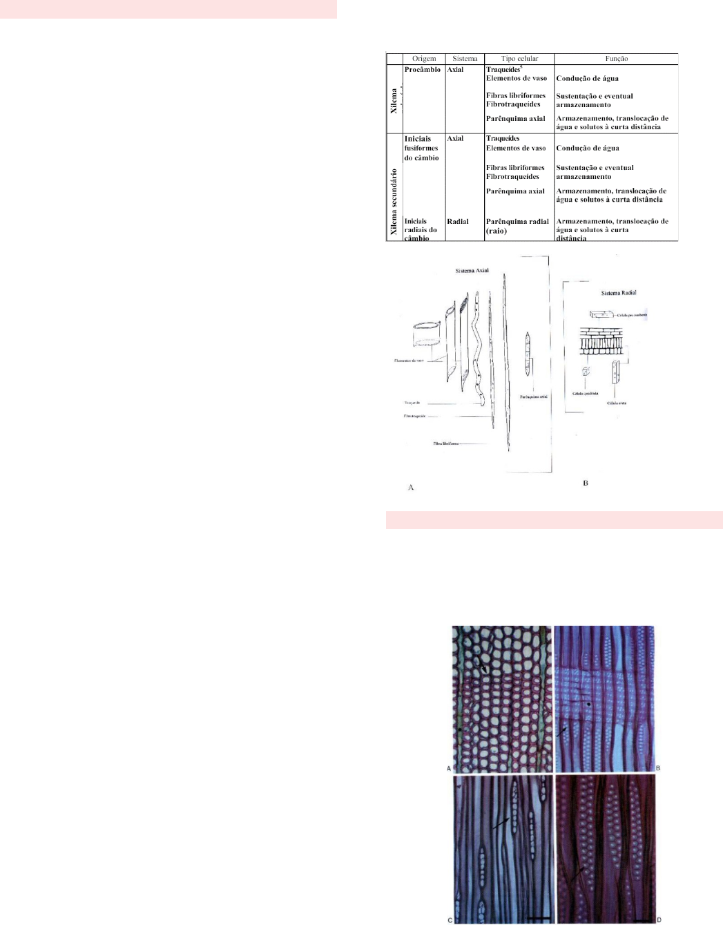 Xilema • O xilema é o principal tecido condutor de água das plantas vasculares. Está associado ao floema, o principal tecido condutor dos alimentos. Em conjunto é chamado, simplesmente, tecido ou tecidos vasculares. O conjunto xilema-floema forma um sistema vascular continuo que percorre a planta inteira, incluindo todas as ramificações do caule e da raiz. • Os tecidos primários diferenciam-se durante a formação do corpo primário da planta. O corpo que se origina do embrião, e é elaborado pela atividade do meristema apical e de seus tecidos meristemáticos. • O meristema relacionado com a formação dos tecidos vasculares primário é o procâmbio ou tecido provascular. • Os tecidos vasculares secundários são produzidos durante o segundo maior estágio de desenvolvimento da planta, que resulta no aumento de espessura pela adição lateral de tecidos novos ao corpo primário. Este espessamento é mais pronunciado nas partes axiais da planta (caule e raiz) e suas ramificações maiores, e resulta da atividade de um meristema especial, o câmbio vascular. Está a usente nas plantas dicotiledôneas anuais de pequeno porte e na maioria das monocotiledôncas. • O xilema é o tecido responsável pelo transporte de água e solutos à longa distância, armazenamento de nutrientes e suporte mecânico. • O xilema e o floema constituem o tecido vascular. Estes tecidos são contínuos através de todos os órgãos (vegetativos ou reprodutivos) das plantas vasculares, formando o sistema vascular. • Ontogeneticamente, para o xilema e floema, é mais didática a distinção entre sistema vascular primário (formado a partir do procâmbio) e sistema vascular secundário (formado a partir do câmbio vascular). um meristema lateral. • Os xilemas primário e secundário são tecidos formados por elementos condutores, células parenquimáticas e fibras, além de outros tipos celulares. No xilema primário esses tipos celulares organizam-se apenas no sistema axial e são derivados do procâmbio; No xilema secundário, estão organizados nos sistemas axial e radial e são originados pelo câmbio. Tipos celulares dos xilemas primário e secundário, origem e função Composição Celular do Xilema Elementos traqueais • Há dois tipos básicos: traqueídes e elementos de vaso. (A - xilema secundário mostrando a constituição do lenho homogêneo de uma gimnosperma; observam-se o anel de crescimento e a diferença entre o lenho inicial e lenho tardio (seta); traqueídes e raios (*). B - xilema secundário mostrando a constituição do lenho homogêneo; observam-se traqueídes (seta) e a composição do raio (*). C - xilema secundário mostrando traqueídes e raios unisseriados (seta). D - Detalhe das pontoações nas paredes terminais das traqueídes (seta). Representação esquemática de um tronco de angiosperma seccionado nos planos transversal, longitudinal tangencial e longitudinal radial. A-C: A - xilema secundário mostrando um anel de crescimento e a nítida separação entre lenho inicial e lenho tardio (seta). B - xilema secundário mostrando um vaso constituído por elementos vasculares curtos (seta); largura e altura dos raios e parênquima axial. C - Seção longitudinal radial do xilema secundário mostrando a composição celular dos raios e o parênquima axial. Traqueídes Elementos de vaso São imperfuradas. São dotados de placas de perfuração. Típicas de gimnospermas, encontradas entre as famílias primitivas das angiospermas. São característicos das angiospermas e das ordens mais evoluídas de gimnospermas. Se posicionam em fileiras longitudinais, justapondo-se pelas extremidades não perfuradas. Ocorrem em fileiras longitudinais e se comunicam através das placas de perfuração, constituindo os vasos. • As traqueídes e os elementos de vaso, no curso de sua diferenciação, perdem seus protoplastos, tornando-se aptos para o transporte da água e dos sais minerais. • Nos elementos de vaso, a parede terminal de cada extremidade sofre um processo de dissolução, originando a placa de perfuração. • A dissolução da parede terminal pode ser: Total, dando origem à placa de perfuração simples; Parcial, constituindo as placas de perfuração foraminada, reticulada, escalariforme, mista e radiada. Representação das placas de perfuração Detalhe da placa de perfuração radiada. • As placas de perfuração também podem ser encontradas nas paredes laterais dos elementos de vaso e, em alguns casos, nas células específicas do parênquima radial, as células perfuradas de raio que estão diretamente envolvidas no transporte de água. Parede celular dos elementos traqueais • A deposição de parede secundária sobre a parede primária nos elementos traqueais pode ocorrer em diferentes graus, estabelecendo diferentes padrões. • Esses padrões aparecem em séries ontogenéticas de elementos traqueais, nos quais há progressivo aumento da extensão de cobertura da parede primária pela parede secundária. Padrão de deposição da parede secundária nos elementos traqueais do xilema primário. A - Anelar. B - Helicoidal. C - Escalariforme. D - Reticulado. E e F - Pontoado. • Nos primeiros elementos traqueais formados, a deposição de parede secundária ocorre na forma de anéis que não se conectam uns com os outros - padrão anelar (A), ou de forma helicoidal - padrão helicoidal (B), que é muito semelhante ao anelar, formando uma ou duas hélices. • Tem poucas regiões com deposição de parede secundária, e por isso, podem sofrer colapso facilmente, porém têm a vantagem da extensibilidade. Permite que os elementos traqueais se diferenciem em tecidos que estão crescendo, já que podem se alongar e continuar funcionais, suprindo de água as partes jovens das plantas. O protoxilema, geralmente, apresenta esses padrões. • Quando a deposição de parede secundária é mais extensa, cobrindo grandes áreas da parede primária, têm-se t