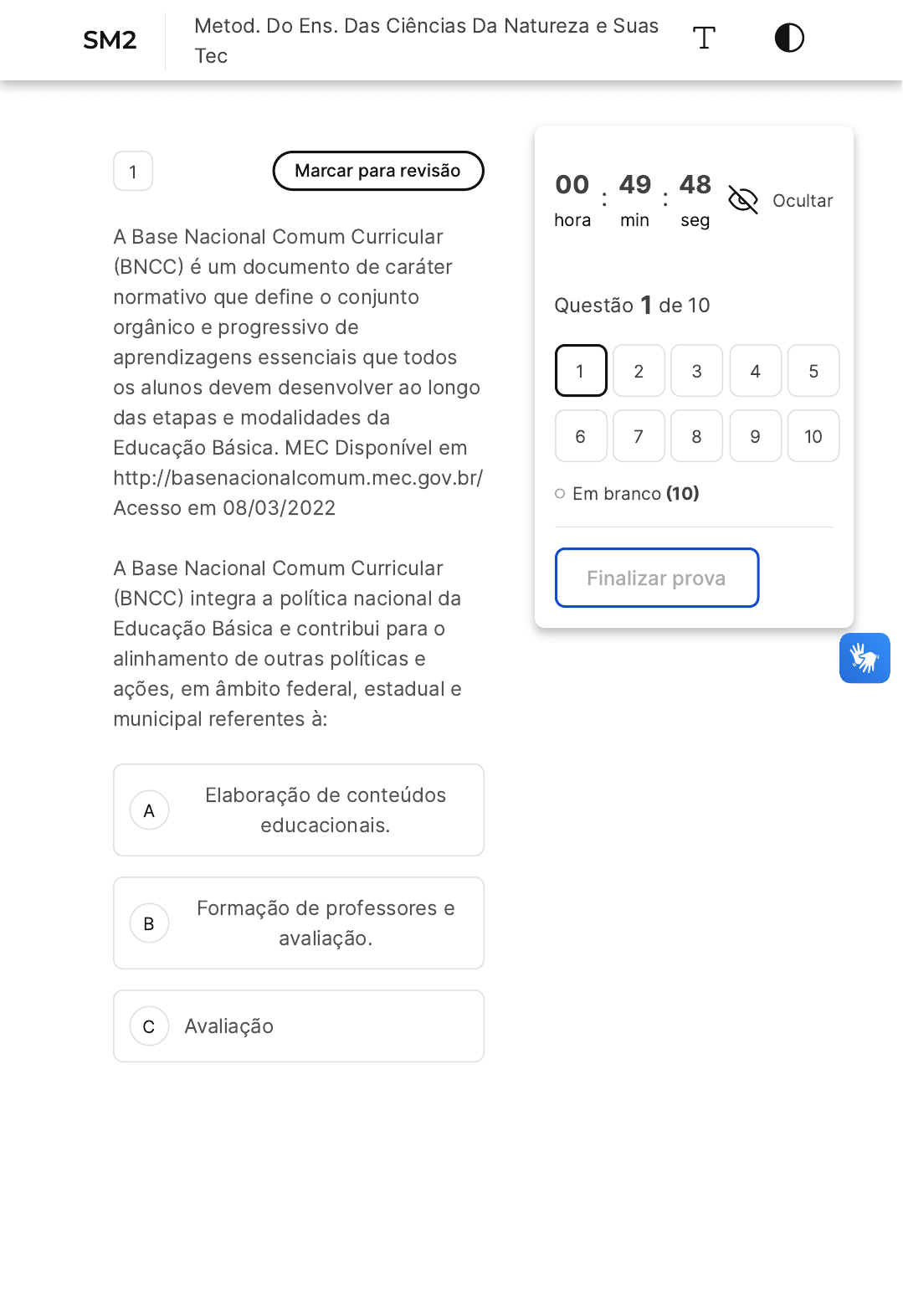 A B C 1 Marcar para revisão A Base Nacional Comum Curricular �BNCC� é um documento de caráter normativo que define o conjunto orgânico e progressivo de aprendizagens essenciais que todos os alunos devem desenvolver ao longo das etapas e modalidades da Educação Básica. MEC Disponível em http://basenacionalcomum.mec.gov.br/ Acesso em 08/03/2022 A Base Nacional Comum Curricular �BNCC� integra a política nacional da Educação Básica e contribui para o alinhamento de outras políticas e ações, em âmbito federal, estadual e municipal referentes à: Elaboração de conteúdos educacionais. Formação de professores e avaliação. Avaliação 00 hora : 49 min : 48 seg Ocultar Questão 1 de 10 Em branco �10� Finalizar prova 1 2 3 4 5 6 7 8 9 10 SM2 Metod. Do Ens. Das Ciências Da Natureza e Suas Tec D E A B C D E Formação de professores, avaliação e elaboração de conteúdos educacionais. Formação de professores. 2 Marcar para revisão Prefeitura de Feira de Santana/BA � 2018�. A Base Nacional Comum Curricular �BNCC� organizou o componente curricular de Ciências em unidades temáticas que se repetem ao longo de todo o Ensino Fundamental. São elas: Vida e ambiente; Ser Humano e Saúde; Tecnologia e Sociedade. Matéria e Energia, Vida e Ambiente; Terra e Universo. Vida e Saúde; Matéria e Energia; Terra e Universo. Matéria e Energia; Vida e Evolução; Terra e Universo. Terra e Universo, Vida e Saúde; Ser Humano e Sociedade. A B 3 Marcar para revisão �IF/BA � 2019 � Adaptada) O professor é um mediador de uma sala de aula que se torna espaço de trocas, interações e construções. É valorizada a utilização da tecnologia, inclusive da internet, mas os alunos não são dispensados das aulas presenciais e estes são respeitados em seu tempo e ritmo de aprendizagem. Sobre os aspectos relacionados ao uso das tecnologias da informação e comunicação �TICs) na prática pedagógica e a qualidade para o processo ensino-aprendizagem, podemos afirmar que: O emprego das tecnologias da informação e comunicação não impõe mudanças nos métodos de trabalho dos professores, gera apenas modificações no funcionamento das instituições e no sistema educativo. A formação docente em nada precisa ser alterada, pois as tecnologias são instrumentos coadjuvantes à prática docente (tanto tecnicamente, quanto pedagogicamente) e perceba quando integrá-las à sua prática pedagógica. C D E As atividades educacionais com apoio tecnológico diminuem o tempo de planejamento do trabalho do professor e requerem menor capacidade de criação, já que muitos programas trazem tudo pronto para ser usado em sala. O docente precisa ter consciência de que a tecnologia é o meio e a ferramenta do fazer pedagógico, porque as TICs são o mais importante centro da ação. Um melhor desempenho educacional não acontece com o uso de melhores instrumentos de ensino, é necessário um professor "bem formado" que os utilize. 4 Marcar para revisão �DPE/AM � 2018� No delineamento de projetos de pesquisa-ação, o pesquisador cumpre as principais etapas de uma pesquisa, desenvolve uma fase exploratória e realiza um seminário, que cumprem, respectivamente, os objetivos de: A B C D E Realizar uma imersão sistemática na literatura científica e seminários educativos com os pesquisadores. Determinar o campo de investigação e expectativa dos interessados, recolhendo propostas dos participantes e de especialistas convidados. Operacionalizar e manipular as variáveis independentes e intervenientes. Formular o problema e definir os instrumentos de coleta de dados. Explorar o campo de pesquisa e realizar um seminário de padronização da coleta de dados com os pesquisadores. 5 Marcar para revisão A BNCC faz indicações e normatiza focando os conteúdos da parte comum do currículo para todo território nacional, em cada etapa da Educação Básica, através de um conjunto orgânico e progressivo de aprendizagens. O currículo também A B C D E tem a ver com a vida, com as experiências formativas e profissionais. Milhares de currículos de Pesquisadores, Professores e Estudantes, de todas as áreas do conhecimento, estão armazenados e podem ser visualizados. A plataforma online oficial onde esses currículos ficam abrigados é: Lattes � Conselho Nacional de Pesquisas �CNPq) Sucupira � Coordenação de Aperfeiçoamento de Pessoal de Nível Superior �Capes) Classroom � Site de busca Google Fala BR � Governo Federal Wikipédia � Enciclopédia online colaborativa aberta 6 Marcar para revisão A Base Nacional Comum Curricular é enfática acerca das contribuições das Ciências no desenvolvimento de competências da prática social e princípios éticos sustentáveis. Nas perspectivas da BNCC, a Biologia, a Química e a Física estão inseridas dentro da área de Ciências Naturais. De acordo com a BNCC, sobre os A B C D E objetivos de ensino das ciências da natureza é CORRETO afirmar que: O processo investigativo não é foco de toda Educação Básica, mas sua ênfase é na Educação Infantil, sendo elemento central na formação das crianças. Somente no Ensino Médio os alunos devem ser estimulados à utilização do método científico para a realização de atividades investigativas. O Letramento Científico em Ciências das Natureza envolve a compreensão e interpretação do mundo e a transposição do aprendizado para o cotidiano da vida. Química, Física e Biologia devem trabalhar de forma individualizada pelo desenvolvimento da capacidade de atuação sobre o mundo. As Ciências Naturais fazem parte do currículo da Educação Básica e as questões ambientais devem ser tratadas em disciplina específica e não por essas ciências. A B 7 Marcar para revisão �UECE�CEV / 2018 � adaptada) O conhecimento científico é muito importante para o ensino de Química. A pesquisa científica é a realização de um estudo planejado, sendo o 