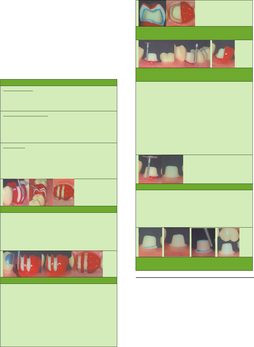 Laura Ferreira Araujo Técnica da Silhueta Nesta técnica vamos fazer metade do dente e depois a outra porção. É uma técnica que apresenta, como vantagens: - Ser um procedimento simplificado; - Usar um número reduzido de brocas; - Poder visualizar a quantidade de desgastes. 1. Sulcos de orientação Vestibular: - PD 3216 com desgaste em todos os planos - Profundidade de 1.2mm - Angulação paralela ao plano trabalhado Palatina/lingual: - PD 3216 - Profundidade de 1.2mm - Angulação paralela à parede cervical vestibular Oclusal: - PD 3216 - Inclinação das vertentes das cúspides - Profundidade de 1.2mm ** Quando em anteriores, a broca deve estar em posição de 45º a incisal para o desgaste incisal 2. Desgaste proximal - PD 2200 e 3216 + matriz metálica no dente vizinho; - Angulação paralela ao longo eixo do dente - Profundidade de 1.2mm - Distância mínima de 1mm do dente vizinho; - Acompanha o contorno gengival! 3. União dos sulcos de orientação - PD 3216 - Angulação no terço cervical vestibular e palatino paralelos - Profundidade de 1.2mm verificando a oclusão ** Retenção eletiva é dada pelo paralelismo 1/3 cervical vestibular e lingual ** Redução oclusal insuficiente resulta em uma restauração com falta de contorno, aparecimento do metal ou necessidade de desgaste do antagonista 4. Preparo da outra metade do dente 5. Término cervical + preparo sub-gengival - PD 3216 - Profundidade supragengival na palatina - Profundidade gengival na proximal/palatina - Profundidade subgengival na vestibular (0.7 a 1mm) e proximal/palatina (0.5mm) ** Razões para fazer o preparo gengival no término subgengival: 1. Estética; 2. Trauma; 3. Proteção contra cárie subgengival; 4. Aumento da área de retenção; 5. Proteção contra cárie cervical (comum em idosos). 6. Acabamento - PD 4138 - Aumentar desgaste cervical e arredondar ângulos - Profundidade metal-cerâmica/sem metal (1.5mm) ** Verificar a oclusão pelas guias anteriores 7 . Confecção da restauração provisória Preparos dentários - Localização: a. Coronários b. Intrarradiculares (polpa morta) c. Dentes anteriores d. Dentes posteriores - Forma: a. Preparos totais b. Preparos parciais (MOD, inlay, onlay, ¾ e 4/5, adesiva) - Material restaurador: a. Metal b. Metal-resina c. Metal-cerâmica d. Sem metal image4.jpeg image5.jpeg image6.jpeg image7.jpeg image8.jpeg image9.jpeg image10.jpeg image11.jpeg image12.jpeg image13.jpeg image14.jpeg image15.jpeg image16.jpeg image1.jpeg image2.jpeg image3.jpeg
