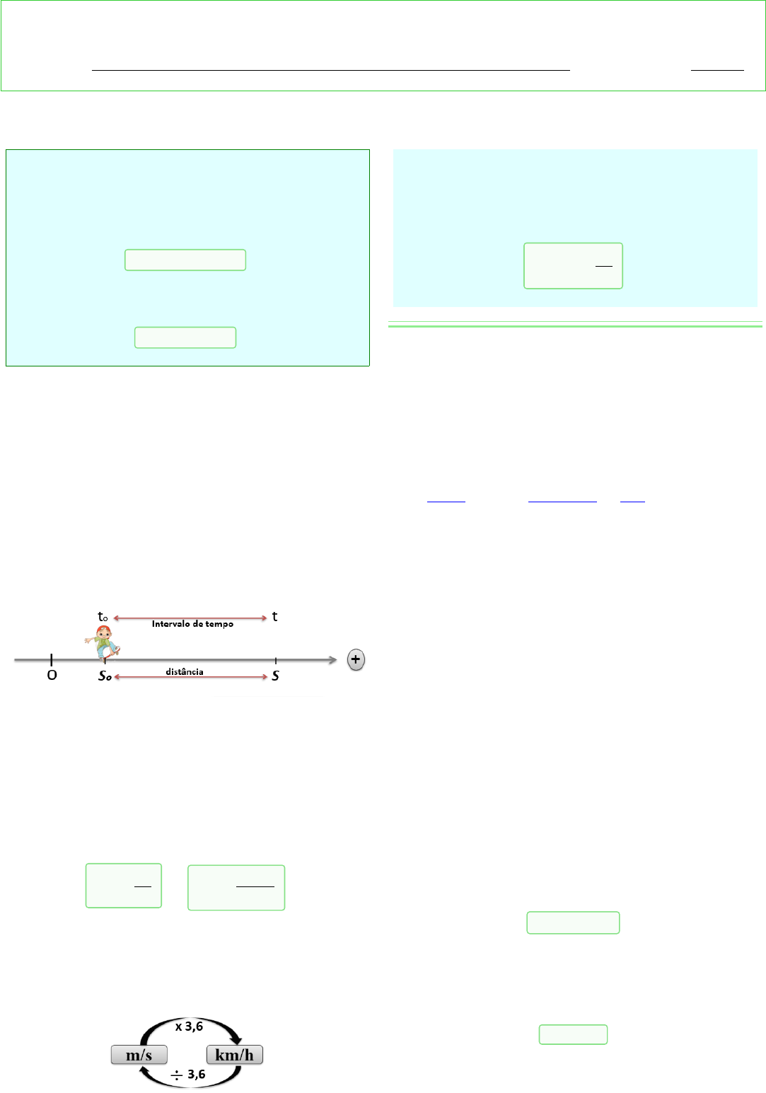 Escola de Educação Básica Profª Maria Amin Ghanem/Joinville/ Santa Catarina Professor: Jardel Cardoso da Rosa Discplina: Física Data: ___/___/ ______ Aluno(a): Série: 1ª série Aula - Velocidade e Movimento Uniforme. Revisão Unidades de comprimento 1 km = 1000 m . Unidades de tempo 1 h = 3600 s . Velocidade média A noção de velocidade está relacionada com a maior ou menor rapidez com que um móvel percorre uma determinada distância. Observe que a velocidade depende das grande- zas comprimento e tempo. Vamos analizar a velocidade de um móvel que percorre um determinado trajeto, conforme a figura abaixo. O móvel parte da posição s0 (posição inicial) no instante t0 (instante inicial) e chega na posição s (posi- ção final) no instante t (instante final). Define-se velocidade média de um móvel como o quociente entre a variação do espaço e o intervalo de tempo gasto. vm = ∆s ∆t ou vm = s− s0 t− t0 . No SI a unidade de velocidade é o m/s. No en- tanto, é muito comum usarmos a unidade km/h. Abaixo segue a relação entre as duas unidades. A velocidade instantânea (v) de um móvel é a velocidade média medida em um intervalo de tempo muito pequeno, tendendo a zero. v = lim ∆t→0 ∆s ∆t . Exemplo 1. Um automóvel passou pelo marco 100 km de uma estrada às 13 h. Às 15 h, ele estava no marco 244 km. Qual foi a velocidade média do automóvel, em m/s, neste trecho de estrada? Dados: t0 = 13 h; t = 15 h; s0 = 100 km e s = 244 km. vm = s− s0 t− t0 ⇒ vm = 244−100 15−13 = 144 2 ⇒ vm = 72 km/h Convertendo para m/s, temos: vm = 72÷3,6m/s⇒ vm = 20 m/s. Movimento Uniforme (MU) O movimento uniforme pode ser definido como aquele em que um móvel tem velocidade instantânea constante e igual à velocidade média para qualquer in- tervalo de tempo. No MU, o móvel percorre distâncias iguais em intervalos de tempo iguais. Se a trajetória for retilínea, o movimento é chamado movimento retilíneo e uniforme (MRU). Função horária Suponha que no instante t0 = 0 o móvel se en- contra na posição s0, então: s = s0 + v.t . Na cinemática, quando dois móveis A e B se en- contram sobre uma determinada trajetória suas posições são iguais, logo: sA = sB . Da mesma maneira, os instantes do encontro também são iguais: 1 tA = tB = t(encontro) . Exemplo 2. Duas cidades distam 250 km entre si. Da cidade A parte um caminhão em direção a B, e da cidade B parte um caminhão em direção a A. Consi- derando que um dos móveis tem velocidade constante igual a 40 km/h e o outro 60 km/h, em quanto tempo os caminhões irão se encontrar e a que distância da cidade A será o ponto de encontro? sA = 0+40.t e sB = 250−60.t No encontro, temos: sA = sB⇒ 40.t = 250−60.t⇒ t = 2,5 h. A distância do ponto de encontro da cidade A é: sA = 40.t = 40.2,5 = 100 km. Gráficos do Movimento Uniforme (MU) Os gráficos da função horária da posição estão mostrados abaixo: Exemplo 3. Trace o gráfico do espaço em função do tempo com os dados das tabelas: ATIVIDADES PARA RESOLVER 1 Um avião está em MU. O espaço percorrido em t = 0 h é 2.500 km. No instante t = 1,6 h, o espaço percorrido é 3.620 km.4. a) Determine a velocidade do avião. b) Escreva a equação horária do movimento. c) Em que posição o avião se encontra em t = 4,5 h? d) Em que instante o avião atinge a posição igual a 7.400 km? 2 Converta as velocidades abaixo: a) 90 km/h para m/s; b) 30 m/s para km/h. 3 A cidade de Joinville dista 180 km da cidade de Floripa. Da cidade de Joinville parte um carro em direção a Floripa, e da cidade Floripa parte um carro em direção a Joinville. Considerando que um dos móveis tem velocidade constante igual a 80 km/h e o outro 100 km/h, em quanto tempo os dois carros irão se encontrar e a que distância da cidade Joinville será o ponto de encontro? 4 Construa o diagrama do espaço pelo tempo para cada função abaixo (SI). a) s = 2+3.t b) s = 10−4.t 2