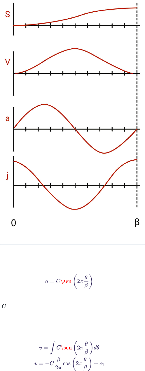 Nos casos em que a massa do trem seguidor for considerável ou, então, não existir uma especificação sobre a velocidade, essas funções devem ser meticulosamente projetadas. Função cicloidal Vamos retomar o projeto do came iniciando pela função da aceleração e as funções harmônicas. Veja o tempo completo de uma senoidal de tempo total, empregada como função da aceleração: Ângulo do came. A equação para a aceleração senoidal é: Em que é a amplitude da função seno. Integrando a aceleração, obtemos a velocidade: a = C\sen(2π θ β ) C v = ∫ C\sen(2π θ β )dθ v = −C β 2π cos(2π θ β ) + c1