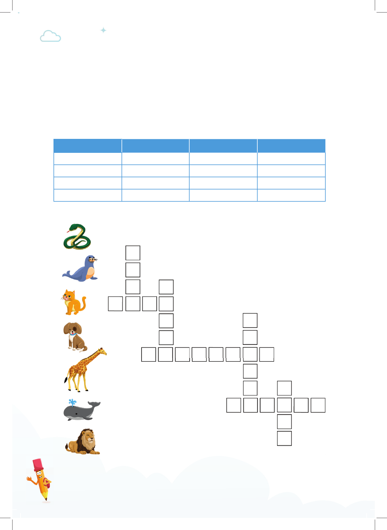 38 EDUCA JUNTOS - LÍNGUA PORTUGUESA - 1º ANO - COLETÂNEA DE ATIVIDADES - VOLUME 1 ATIVIDADE 19 NOME ___________________________________DATA______/_______/_____ RESOLVA A CRUZADINHA, ESCOLHENDO E PINTANDO A PALAVRA CERTA NO QUADRO ABAIXO. 4 Letras 5 Letras 6 Letras 8 Letras MALA COBRA BALEIA CACHORRO FOCA LEITE CABELO LIVRARIA GATO GRILO GIRAFA FARMÁCIA LEÃO LÁPIS PANELA DENTISTA