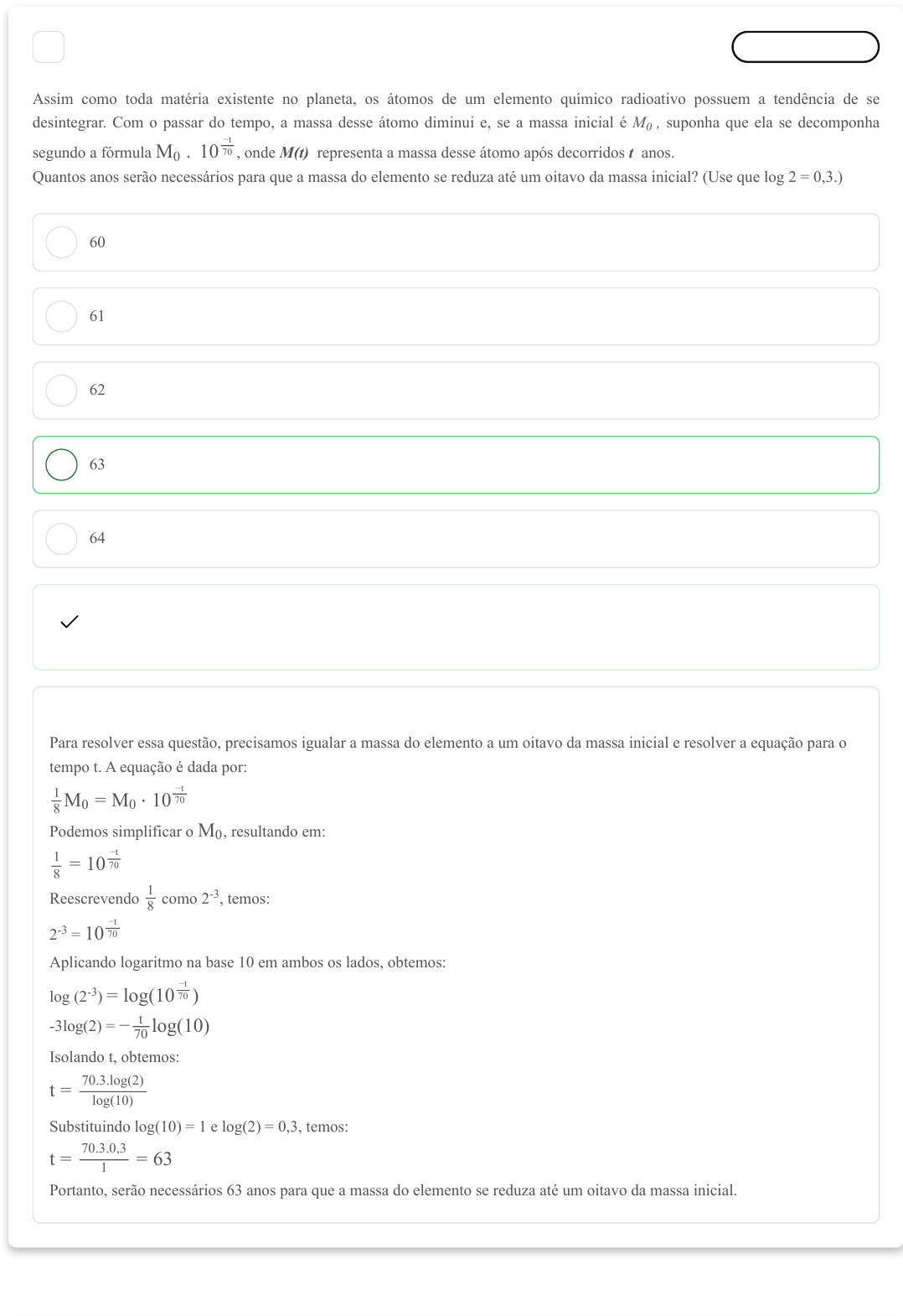 Portanto, serão necessários 63 anos para que a massa do elemento se reduza até um oitavo da massa inicial.