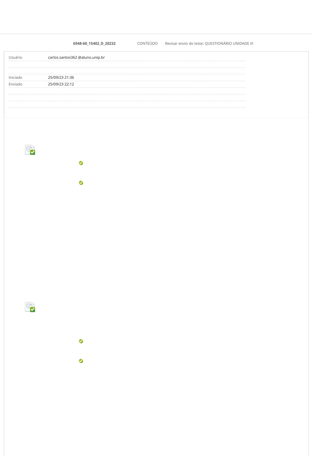 Revisar envio do teste: QUESTIONÁRIO UNIDADE IIIDIDÁTICA ESPECÍFICA - MATEMÁTICA 6948-60_15402_D_20232 CONTEÚDO Usuário carlos.santos362 @aluno.unip.br Curso DIDÁTICA ESPECÍFICA - MATEMÁTICA Teste QUESTIONÁRIO UNIDADE III Iniciado 25/09/23 21:36 Enviado 25/09/23 22:12 Status Completada Resultado da tentativa 3,6 em 4 pontos Tempo decorrido 36 minutos Resultados exibidos Todas as respostas, Respostas enviadas, Respostas corretas, Comentários, Perguntas respondidas incorretamente Pergunta 1 Resposta Selecionada: b. Respostas: a. b. c. d. e. Comentário da resposta: Um princípio estratégico presente em uma atividade com o Papiro de Rhind, que refere‑se ao trabalho re�exivo sobre o processo de conhecimento, tendo como base a metacognição e a autorregulação da aprendizagem, é a organização do: Metaconhecimento. Formalismo. Metaconhecimento. Procedimento didático. Conhecimento padrão. Ensino híbrido. Resposta: B Comentário: a atividade com o Papiro de Rhind tem como princípio estratégico, portanto, a organização do metaconhecimento. Essencialmente o metaconhecimento formaliza o vínculo interdisciplinar presente na transposição didática. Atividades pedagógicas com transposição didática é uma ação pedagógica precedida pelo estímulo da curiosidade discente. No caso Papiro de Rhind, trata‑se de uma ação despertada pela busca de informações referentes ao Papiro e pela necessidade de familiarização com as relações de causa e efeito entre passado e presente. Pergunta 2 Resposta Selecionada: b. Respostas: a. b. c. d. e. Comentário da resposta: Sabe-se que a sala de aula não é um espaço plano, apesar de suas simetrias. É um local que antes de afunilar, simplesmente expande diferentes contextos. É o local de inter‑relacionamento de questões de natureza educativa, expectativas, interesses, interações, estilos de ensinar e de aprender, abordagem curricular e organização institucional, como também da cultura da comunidade do entorno. O ambiente de sala de aula, portanto, é heterogêneo e formado por uma complexidade multicultural. A percepção mais apurada do contexto de ambiente de aprendizagem ou de sala de aula, abraçando outros conceitos, como a autorregulação e o autocontrole, mesmo diante das improvisações pertinentes a esse contexto educativo, é reconhecido como: Gestão ou manejo da sala de aula. Metodologia inovadora. Gestão ou manejo da sala de aula. Heterogeneidade discente ou docente. Inter-relacionamento de planos educativos. Planejamento estratégico de ensino em nível macro ou institucional ou, simplesmente, de plano de aula. Resposta: B Comentário: gestão de sala de aula são todas as ações realizadas pelo professor para promover um ambiente de aprendizagem efetivo, em que todos os estudantes se sintam seguros e estimulados a aprender; implica em: conhecer o nível de engajamento de cada estudante, identi�car quais recursos tecnológicos mais estimulam a turma, saber quais atividades e práticas geram melhores resultados. Com base nesses pressupostos, o docente se vê capaz de se autorregular e autocontrolar suas atitudes, comportamentos e estratégias a �m de garantir o melhor ambiente de aprendizagem. Os demais itens são limitantes ou restritos demais em relação ao enunciado da questão. UNIP EAD BIBLIOTECAS MURAL DO ALUNO TUTORIAIS LABORATÓRIOSCONTEÚDOS ACADÊMICOS 0,4 em 0,4 pontos 0,4 em 0,4 pontos http://company.blackboard.com/ https://ava.ead.unip.br/webapps/blackboard/execute/courseMain?course_id=_312800_1 https://ava.ead.unip.br/webapps/blackboard/content/listContent.jsp?course_id=_312800_1&content_id=_3663499_1&mode=reset https://ava.ead.unip.br/webapps/portal/execute/tabs/tabAction?tab_tab_group_id=_10_1 https://ava.ead.unip.br/webapps/portal/execute/tabs/tabAction?tab_tab_group_id=_27_1 https://ava.ead.unip.br/webapps/portal/execute/tabs/tabAction?tab_tab_group_id=_47_1 https://ava.ead.unip.br/webapps/portal/execute/tabs/tabAction?tab_tab_group_id=_29_1 https://ava.ead.unip.br/webapps/portal/execute/tabs/tabAction?tab_tab_group_id=_64_1 https://ava.ead.unip.br/webapps/portal/execute/tabs/tabAction?tab_tab_group_id=_25_1 https://ava.ead.unip.br/webapps/login/?action=logout User-PC Retângulo User-PC Retângulo User-PC Retângulo Pergunta 3 Resposta Selecionada: e. Respostas: a. b. c. d. e. Na prática docente, um dos principais objetivos do livro didático é oferecer um percurso de entrada e saída para a construção de conhecimento, subsidiar atividades que sejam coerentes com a realidade dos escolares e atribuir uma rota para buscas e aprofundamentos, sem permitir que haja dispersão dos objetivos de ensino‑aprendizagem. A utilização de livro didático não pode ser concebida como uma decisão para todas as aulas. Isso implica em: Compartimentalização do conhecimento e situação de ensino reducionista. Necessidade de elaboração de material didático próprio por apostilas, segundo regras aplicadas pela instituição de ensino para substituição permanente do livro didático. Organizar uma concepção técnica própria do docente para fomentar a instrumentalização de suas aulas sem a necessidade de material de apoio. A mais correta distribuição dos capítulos sequencializados de acordo com o conteúdo programático, atrelando o docente a uma prática sistematizada e com direcionamento técnico reducionista. Maior autonomia na decisão docente para a elaboração de suas práticas e, por conseguinte, na eleição de como ou quando utilizar o material estruturado. Compartimentalização do conhecimento e situação de ensino reducionista. Pergunta 4 Resposta Selecionada: c. Respostas: a. b. c. d. e. Comentário da resposta: O livro didático recebe, na cultura de ensino brasileira, alto grau de prescrição para utilização entre os docentes (CASSIANO, 2017). Contudo, é necessário recomendar ao professor que: O livro didático não pode assumir um papel limitante na atua