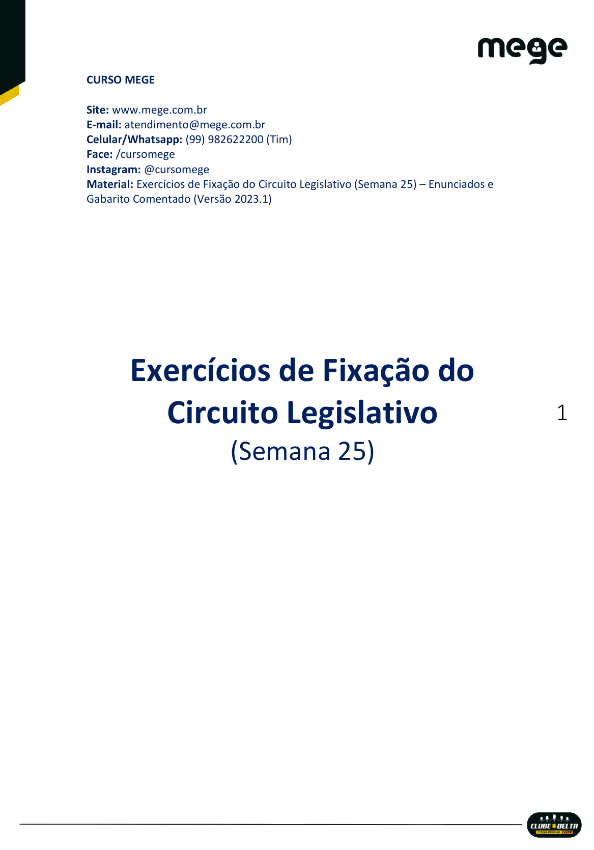 CPF: 860.542.154-18 PACHEGO GONÇALVES | 9999999999 | alesantosf2020@gmail.com | CPF: 860.542.154-18 É proibida a reprodução deste material sem a devida autorização, sob pena da adoção das medidas cabíveis na esfera cível e penal. 1 CURSO MEGE Site: www.mege.com.br E-mail: atendimento@mege.com.br Celular/Whatsapp: (99) 982622200 (Tim) Face: /cursomege Instagram: @cursomege Material: Exercícios de Fixação do Circuito Legislativo (Semana 25) – Enunciados e Gabarito Comentado (Versão 2023.1) Exercícios de Fixação do Circuito Legislativo (Semana 25) CPF: 860.542.154-18 PACHEGO GONÇALVES | 9999999999 | alesantosf2020@gmail.com | CPF: 860.542.154-18 É proibida a reprodução deste material sem a devida autorização, sob pena da adoção das medidas cabíveis na esfera cível e penal. 2 SUMÁRIO ENUNCIADOS ............................................................................................................. 3 LEGISLAÇÃO PENAL ESPECIAL (CTB) ............................................................................ 3 LEGISLAÇÃO PENAL EXTRAVAGANTE – 9.613/98 ........................................................ 4 DIREITO CONSTITUCIONAL .......................................................................................... 5 DIREITO ADMINISTRATIVO .......................................................................................... 7 GABARITO COMENTADO ........................................................................................... 9 LEGISLAÇÃO PENAL ESPECIAL (CTB) ............................................................................ 9 LEGISLAÇÃO PENAL EXTRAVAGANTE – 9.613/98 ...................................................... 10 DIREITO CONSTITUCIONAL ........................................................................................ 13 DIREITO ADMINISTRATIVO ........................................................................................ 15 CPF: 860.542.154-18 PACHEGO GONÇALVES | 9999999999 | alesantosf2020@gmail.com | CPF: 860.542.154-18 É proibida a reprodução deste material sem a devida autorização, sob pena da adoção das medidas cabíveis na esfera cível e penal. 3 EXERCÍCIOS DE FIXAÇÃO DO CIRCUITO LEGISLATIVO SEMANA 25 (VERDADEIRO OU FALSO) ENUNCIADOS LEGISLAÇÃO PENAL ESPECIAL (CTB) 1. No homicídio culposo de trânsito, a pena é aumentada de 1/3 à metade se o agente utiliza o veículo sem placas, com placas falsas ou adulteradas. ( ) Verdadeiro. ( ) Falso. 2. No crime de embriaguez ao volante, a alteração da capacidade psicomotora pode ser constatada, embora não exclusivamente, pela concentração igual ou superior a 6 decigramas de álcool por litro de sangue ou igual ou superior a 0,3 miligrama de álcool por litro de ar alveolar. ( ) Verdadeiro. ( ) Falso. 3. O juiz fixará a pena-base segundo as diretrizes previstas no Código Penal, dando especial atenção à culpabilidade do agente e às circunstâncias e consequências do crime. ( ) Verdadeiro. ( ) Falso. 4. Transitada em julgado a sentença condenatória de crime de trânsito e havendo a penalidade de suspensão ou de proibição de se obter a permissão ou a habilitação para dirigir veículo automotor, o réu será intimado a entregar à autoridade judiciária, em 24 horas, a Permissão para Dirigir ou a Carteira de Habilitação. ( ) Verdadeiro. ( ) Falso. 5. Se o réu for reincidente na prática de crime previsto no CTB, o juiz aplicará a penalidade de suspensão da permissão ou habilitação para dirigir veículo automotor, sem prejuízo das demais sanções penais cabíveis. ( ) Verdadeiro. ( ) Falso. CPF: 860.542.154-18 PACHEGO GONÇALVES | 9999999999 | alesantosf2020@gmail.com | CPF: 860.542.154-18 É proibida a reprodução deste material sem a devida autorização, sob pena da adoção das medidas cabíveis na esfera cível e penal. 4 6. Constitui crime a conduta de permitir, confiar ou entregar a direção de veículo automotor à pessoa que não seja habilitada independentemente da ocorrência de lesão ou de perigo de dano concreto na condução do veículo. ( ) Verdadeiro. ( ) Falso. LEGISLAÇÃO PENAL EXTRAVAGANTE – 9.613/98 7. Segundo a Lei 9.613/98, a pena será aumentada de um a dois terços, se os crimes definidos nela forem cometidos de forma reiterada e por intermédio de organização criminosa. ( ) Verdadeiro. ( ) Falso. 8. Na Lei 9.613, a pena poderá ser reduzida de um a dois terços ou ser cumprida em regime aberto ou semiaberto, facultando-se ao juiz deixar de aplicá-la ou substituí-la, a qualquer tempo, por pena restritiva de direitos, se o autor, coautor ou partícipe colaborar espontaneamente com as autoridades, prestando esclarecimentos que conduzam à apuração das infrações penais, à identificação dos autores, coautores e partícipes, e à localização dos bens, direitos ou valores objeto do crime. ( ) Verdadeiro. ( ) Falso. 9. A denúncia será instruída com indícios suficientes da existência da infração penal antecedente, sendo puníveis os fatos previstos na Lei 9.613/98, ainda que desconhecido ou isento de pena o autor, ou extinta a punibilidade da infração penal antecedente. ( ) Verdadeiro. ( ) Falso. 10. A autoridade policial e o Ministério Público terão acesso, exclusivamente, aos dados cadastrais do investigado que informam qualificação pessoal, filiação e endereço, mediante autorização judicial, mantidos pela Justiça Eleitoral, pelas empresas telefônicas, pelas instituições financeiras, pelos provedores de internet e pelas administradoras de cartão de crédito. ( ) Verdadeiro. ( ) Falso. 11. A Secretaria da Receita Federal do Brasil conservará os dados fiscais dos contribuintes pelo prazo mínimo de 5 CPF: 860.542.154-18 PACHEGO GONÇALVES | 9999999999 | alesantosf2020@gmail.com | CPF: 860.542.154-18 É proibida a reprodução deste material sem a devida autorização, sob pena da adoção das medidas cabíveis na esfera cível e penal. 5 anos, cont