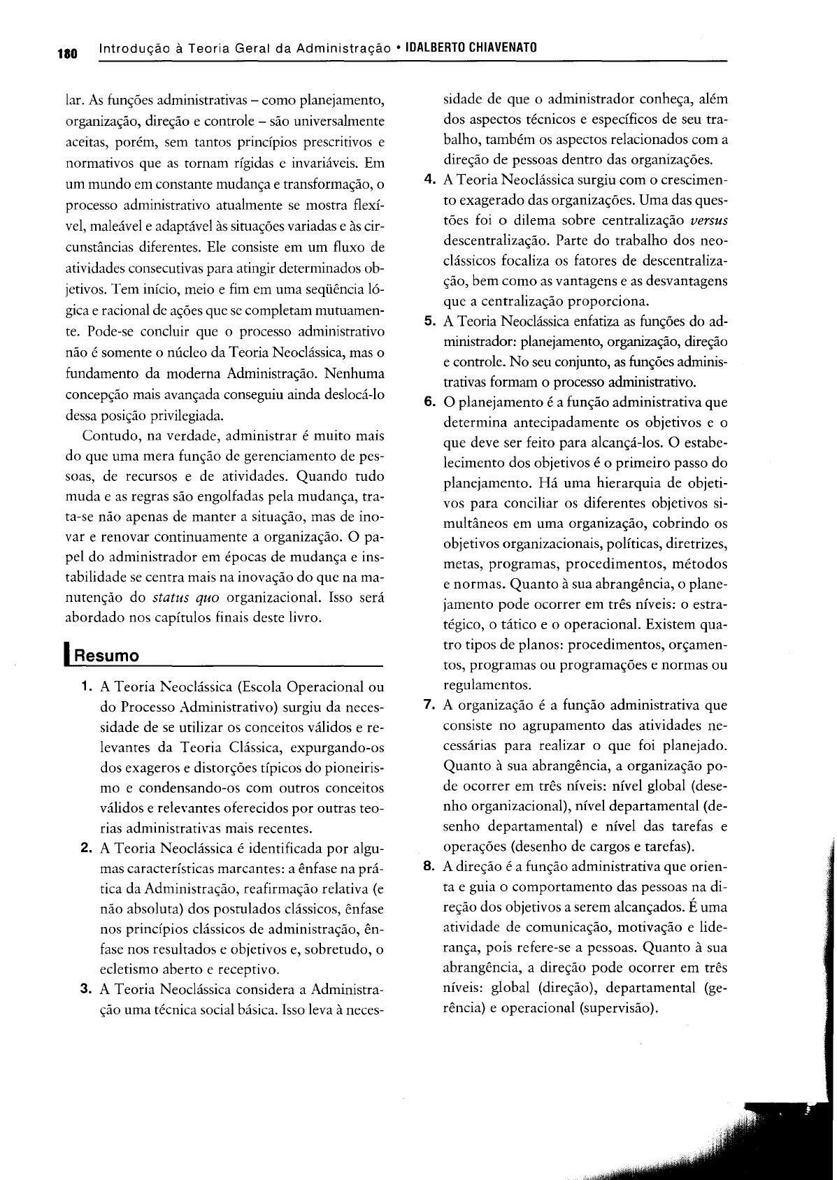 188 Introdução à Teoria Geral da Administração· IDALBERTO CHIAVENATO lar. As funções administrativas - como planejamento, organização, direção e controle - são universalmente aceitas, porém, sem tantos princípios prescritivos e normativos que as tornam rígidas e invariáveis. Em um mundo em constante mudança e transformação, o processo administrativo atualmente se mostra flexí vel, maleável e adaptável às situações variadas e às cir cunstâncias diferentes. Ele consiste em um fluxo de atividades consecutivas para atingir determinados ob jetivos. Tem início, meio e fim em uma seqüência ló gica e racional de ações que se completam mutuamen te. Pode-se concluir que o processo administrativo não é somente o núcleo da Teoria Neoclássica, mas o fundamento da moderna Administração. Nenhuma concepção mais avançada conseguiu ainda deslocá-lo dessa posição privilegiada. Contudo, na verdade, administrar é muito mais do que uma mera função de gerenciamento de pes soas, de recursos e de atividades. Quando tudo muda e as regras são engolfadas pela mudança, tra ta-se não apenas de manter a situação, mas de ino var e renovar continuamente a organização. O pa pel do administrador em épocas de mudança e ins tabilidade se centra mais na inovação do que na ma nutenção do status quo organizacional. Isso será abordado nos capítulos finais deste livro. IResumo 1. A Teoria Keoclássica (Escola Operacional ou do Processo Administrativo) surgiu da neces sidade de se utilizar os conceitos válidos e re levantes da Teoria Clássica, expurgando-os dos exageros e distorções típicos do pioneiris mo e condensando-os com outros conceitos válidos e relevantes oferecidos por outras teo rias administrativas mais recentes. 2. A Teoria Neoclássica é identificada por algu mas características marcantes: a ênfase na prá tica da Administração, reafirmação relativa (e não absoluta) dos postulados clássicos, ênfase nos princípios clássicos de administração, ên fase nos resultados e objetivos e, sobretudo, o ecletismo aberto e receptivo. 3. A Teoria Neoclássica considera a Administra ção uma técnica social básica. Isso leva à neces- sidade de que o administrador conheça, além dos aspectos técnicos e específicos de seu tra balho, também os aspectos relacionados com a direção de pessoas dentro das organizações. 4. A Teoria Neoclássica surgiu com o crescimen to exagerado das organizações. Uma das ques tões foi o dilema sobre centralização versus descentralização. Parte do trabalho dos neo clássicos focaliza os fatores de descentraliza ção, bem como as vantagens e as desvantagens que a centralização proporciona. 5. A Teoria Neoclássica enfatiza as funções do ad ministrador: planejamento, organização, direção e controle. No seu conjunto, as funções adminis trativas formam o processo administrativo. 6. O planejamento é a função administrativa que determina antecipadamente os objetivos e o que deve ser feito para alcançá-los. O estabe lecimento dos objetivos é o primeiro passo do planejamento. Há uma hierarquia de objeti vos para conciliar os diferentes objetivos si multâneos em uma organização, cobrindo os objetivos organizacionais, políticas, diretrizes, metas, programas, procedimentos, métodos e normas. Quanto à sua abrangência, o plane jamento pode ocorrer em três níveis: o estra tégico, o tático e o operacional. Existem qua tro tipos de planos: procedimentos, orçamen tos, programas ou programações e normas ou regulamentos. 7. A organização é a função administrativa que consiste no agrupamento das atividades ne cessárias para realizar o que foi planejado. Quanto à sua abrangência, a organização po de ocorrer em três níveis: nível global (dese nho organizacional), nível departamental (de senho departamental) e nível das tarefas e operações (desenho de cargos e tarefas). 8. A direção é a função administrativa que orien ta e guia o comportamento das pessoas na di reção dos objetivos a serem alcançados. É uma atividade de comunicação, motivação e lide rança, pois refere-se a pessoas. Quanto à sua abrangência, a direção pode ocorrer em três níveis: global (direção), departamental (ge rência) e operacional (supervisão). f 9. O controle é a função administrativa que visa a assegurar se o que foi planejado, organizado e di rigido realmente cumpriu os objetivos pretendi dos. O controle é constituído por quatro fases: estabelecimento de critérios ou padrões, observa- • CASO COMO VAI A IBM?27 A IBM está procurando uma nova identidade. Ou um novo reposicionamento. No início da década de 1990, a Big Blue - tal como é conhecida nos Estados Unidos amargou um enorme prejuízo de US$16 bilhões. Isso custou a cabeça do presidente da corporação. O novo presidente, Louis Gerstner, com um salário anual de qua se US$8 milhões, tomou rápidas providências: de cara cortou US$3 bilhões em despesas e demitiu cerca de 40 mil empregados. O colosso de US$63 bilhões de fatura mento anual, que virou sinônimo de dinossauro eletrôni co, parece afinal estar no rumo da retomada. Parece? Ao reassumir, Gerstner descartou a alternativa de desmembrar a empresa, como pretendia seu anteces sor, que achava que o desmembramento poderia tornar a IBM (ou as IBMs) mais fácil de manejar. Em vez de re talhar a empresa em divisões autônomas, independen tes e presumivelmente mais ágeis, como tem feito a grande maioria das megaempresas americanas, o novo presidente optou por manter o gigante intacto, na pre sunção de que a companhia é mais competitiva como um conjunto uníssono. Na verdade, o novo presidente, que veio da Nabisco para botar ordem na casa, enfrenta problemas para fazer a companhia andar no ritmo e na direção que se pretende. O seu principal desafio é des pertar o sentido de urgência e mudança em uma gigan tesca organização composta por 216 mil funcionár