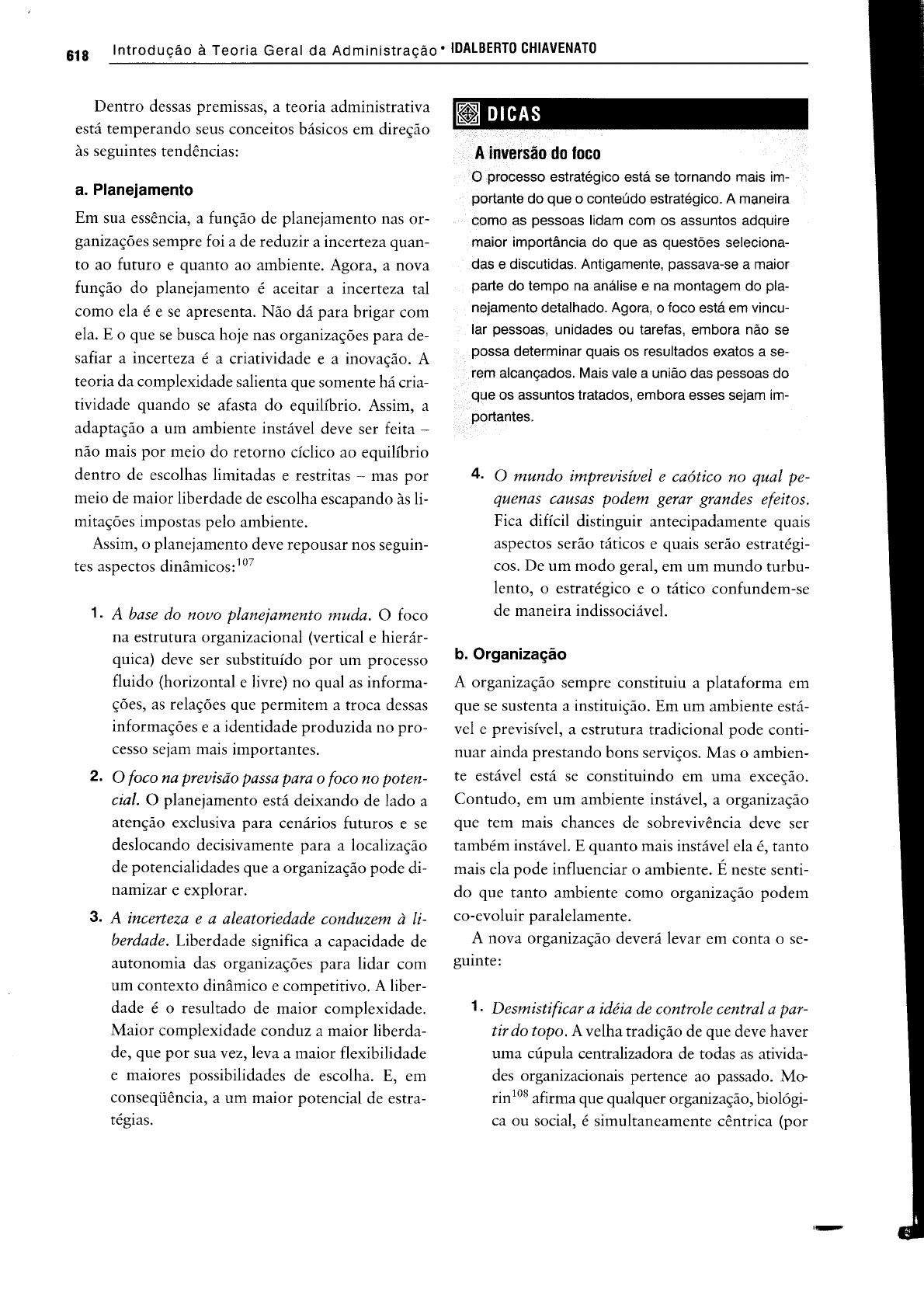 Introdução à Teoria Geral da Administração· IDAlBERTO CHIAVENATO618 Dentro dessas premissas, a teoria administrativa está temperando seus conceitos básicos em direção às seguintes tendências: a. Planejamento Em sua essência, a função de planejamento nas or ganizações sempre foi a de reduzir a incerteza quan to ao futuro e quanto ao ambiente. Agora, a nova função do planejamento é aceitar a incerteza tal como ela é e se apresenta. Não dá para brigar com ela. E o que se busca hoje nas organizações para de safiar a incerteza é a criatividade e a inovação. A teoria da complexidade salienta que somente há cria tividade quando se afasta do equilíbrio. Assim, a adaptação a um ambiente instável deve ser feita não mais por meio do retorno cíclico ao equilíbrio dentro de escolhas limitadas e restritas - mas por meio de maior liberdade de escolha escapando às li mitações impostas pelo ambiente. Assim, o planejamento deve repousar nos seguin tes aspectos dinâmicos: 107 1. A base do novo planejamento muda. O foco na estrutura organizacional (vertical e hierár quica) deve ser substituído por um processo fluido (horizontal e livre) no qual as informa ções, as relações que permitem a troca dessas informações e a identidade produzida no pro cesso sejam mais importantes. 2. O foco na previsão passa para o foco no poten cial. O planejamento está deixando de lado a atenção exclusiva para cenários futuros e se deslocando decisivamente para a localização de potencialidades que a organização pode di namizar e explorar. 3. A incerteza e a aleatoriedade conduzem à li berdade. Liberdade significa a capacidade de autonomia das organizações para lidar com um contexto dinâmico e competitivo. A liber dade é o resultado de maior complexidade. Maior complexidade conduz a maior liberda de, que por sua vez, leva a maior flexibilidade e maiores possibilidades de escolha. E, em conseqüência, a um maior potencial de estra tégias. III DICAS Ainversão do foco Oprocesso estratégico está se tornando mais im portante do que o conteúdo estratégico. A maneira como as pessoas lidam com os assuntos adquire maior importância do que as questões seleciona das e discutidas. Antigamente, passava-se a maior parte do tempo na análise e na montagem do pla nejamento detalhado. Agora, o foco está em vincu lar pessoas, unidades ou tarefas, embora não se possa determinar quais os resultados exatos a se rem alcançados. Mais vale a união das pessoas do que os assuntos tratados, embora esses sejam im portantes. 4. O mundo imprevisível e caótico no qual pe quenas causas podem gerar grandes efeitos. Fica difícil distinguir antecipadamente quais aspectos serão táticos e quais serão estratégi cos. De um modo geral, em um mundo turbu lento, o estratégico e o tático confundem-se de maneira indissociável. b. Organização A organização sempre constituiu a plataforma em que se sustenta a instituição. Em um ambiente está vel e previsível, a estrutura tradicional pode conti nuar ainda prestando bons serviços. Mas o ambien te estável está se constituindo em uma exceção. Contudo, em um ambiente instável, a organização que tem mais chances de sobrevivência deve ser também instável. E quanto mais instável ela é, tanto mais ela pode influenciar o ambiente. É neste senti do que tanto ambiente como organização podem co-evoluir paralelamente. A nova organização deverá levar em conta o se guinte: 1. Desmistificar a idéia de controle central a par tir do topo. A velha tradição de que deve haver uma cúpula centralizadora de todas as ativida des organizacionais pertence ao passado. Mo rin108 afirma que qualquer organização, biológi ca ou social, é simultaneamente cêntrica (por ~ DICAS Em suma, a nova gerência deve assumIr as se guintes atribuições: 109 ganizacional e das crenças e valores da organi zação. Tudo isso está mudando. O novo papel da gerência consiste em fomentar a necessária instabilidade para estimular potencialidades acêntricas latentes e para que possam surgir as condições de aprendizado e trocas de infor mação por meio das interações. Trata-se de questionar permanentemente o status quo. c ~' I I I 619CAPíTULO 19· Para onde Vai a TGA? Interações e aprendizado o fluxo de informações deve privilegiar o aprendiza do: tanto a criação de novas informações como a cir culação de informações já existentes deve produzir diferentes interpretações que permitam a reflexão compartilhada e que leve a novas informações. Tra ta-se de retroação positiva: uma amplificação por re troalimentação do potencial contido nas informa ções.11ü A gestão do conhecimento - passando pela universidade corporativa em direção ao capital inte lectual - faz parte integrante desse quadro. São as interações e conexões entre as pessoas que permitem novos e mais complexos padrões globais de comportamento. E esses novos padrões conduzem a novos desempenhos e a novas dire ções estratégicas. Daí o foco em equipes e na am PlpRétrtiçipação das pessoas na dinamização ne9(Íciosda organização. 1. Estímulo à desordem, por meio da introdução de novas idéias e informações, às vezes, ambí guas para gerar criatividade e inovação. 2. Estímulo à autonomia, à iniciativa, à conecti vidade, à comunicação e à cooperação. 3. Estímulo à identidade organizacional em per manente atualização. 4. Percepção sempre renovada das circunstân cias ambientais. 5. Os gerentes passam a comportar-se também como pesquisadores que estudam suas pró prias organizações, não se limitando a focali- 1. O papel dos gerentes deve ser redefinido. Com o abandono da visão tradicional de que o fu turo da organização pode e deve ser estabele cido e capitaneado pelos gerentes. Isso signifi ca um reajustamento das relações de poder. O empowerment está por trás disso. 2. Não são mais os gerentes os guardiães do espí r