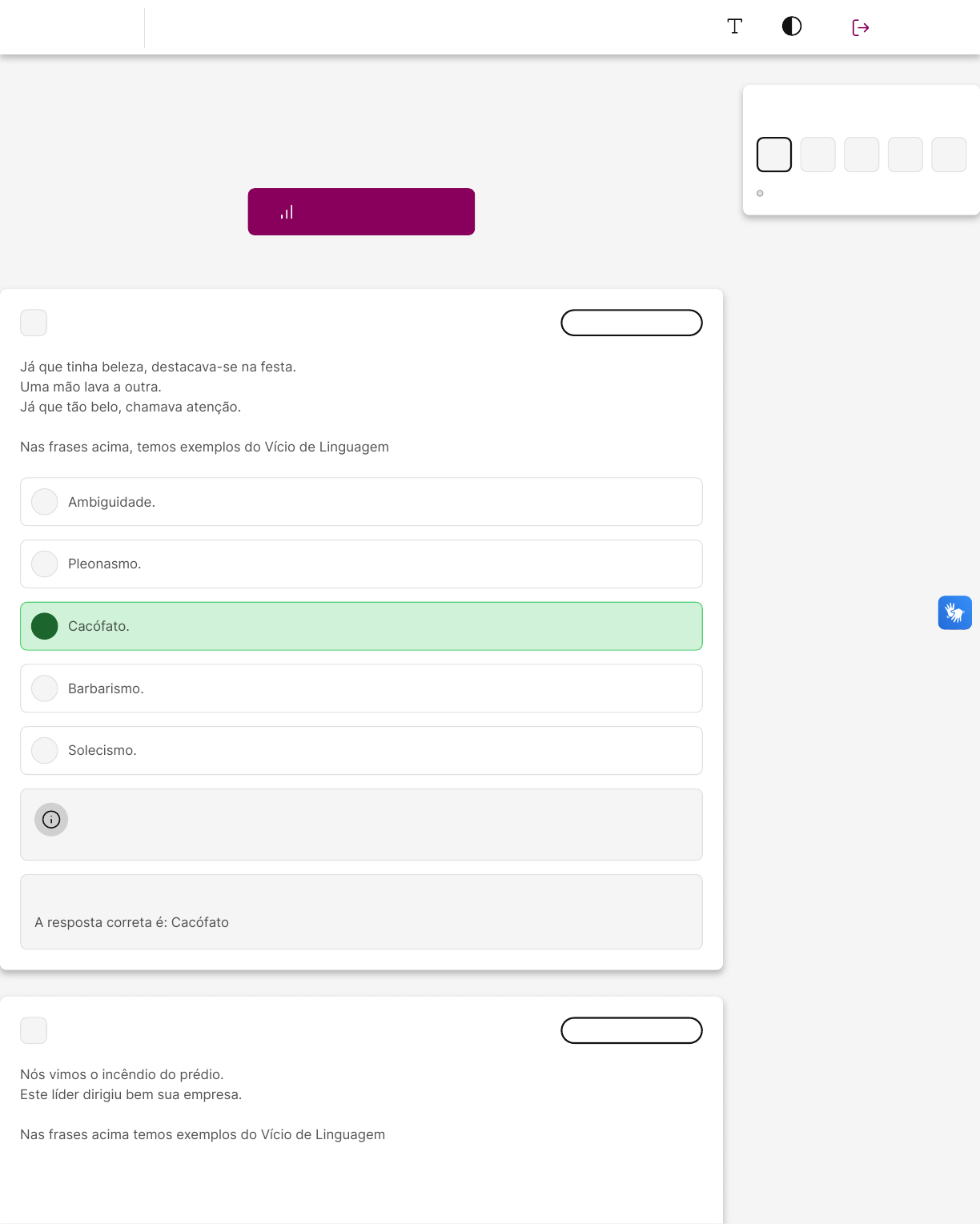 Você acertou 0 de 5 questões Verifique o seu desempenho e continue treinando! Você pode refazer o exercício quantas vezes quiser. Verificar Desempenho A B C D E 1 Marcar para revisão Já que tinha beleza, destacava-se na festa. Uma mão lava a outra. Já que tão belo, chamava atenção. Nas frases acima, temos exemplos do Vício de Linguagem Ambiguidade. Pleonasmo. Cacófato. Barbarismo. Solecismo. Questão não respondida Opa! A alternativa correta é a letra C. Confira o gabarito comentado! Gabarito Comentado A resposta correta é: Cacófato 2 Marcar para revisão Nós vimos o incêndio do prédio. Este líder dirigiu bem sua empresa. Nas frases acima temos exemplos do Vício de Linguagem Questão 1 de 5 Em branco �5� 1 2 3 4 5 Exercicio Conteúdo Sair A B C D E A B C D E Cacófato. Ambiguidade. Solecismo. Pleonasmo. Barbarismo. Questão não respondida Opa! A alternativa correta é a letra B. Confira o gabarito comentado! Gabarito Comentado Na primeira frase, há duas interpretações possíveis: ou se assistiu ao incêndio que acontecia no prédio, ou se assistiu ao incêndio estando no prédio. Na segunda frase, não se sabe se a empresa é do líder ou se ele dirigiu a empresa do interlocutor. 3 Marcar para revisão Em qual das palavras abaixo o hífen permanece após a Nova Ortografia da Língua Portuguesa? ultra-sonografia inter-regional auto-escola pára-choque auto-retrato Questão não respondida Opa! A alternativa correta é a letra B. Confira o gabarito comentado! Gabarito Comentado A resposta correta é:inter-regional A B C D E A B C D E 4 Marcar para revisão Indique a única alternativa que contém o desvio chamado de frases siamesas. Olá Joana estou com saudades apareça em breve. O presidente da empresa sofreu com o relatório. A Bovespa encerrou o dia em forte queda ontem Imagino que a Secretaria esteja aberta até agora Envie o ofício ao Conselho Tutelar mais próximo. Questão não respondida Opa! A alternativa correta é a letra A. Confira o gabarito comentado! Gabarito Comentado A resposta correta é: Olá Joana estou com saudades apareça em breve. 5 Marcar para revisão Quanto ao emprego do / X / esta letra representa os seguintes fonemas, exceto: /ch/: xarope, enxofre, vexame /cs/: sexo, látex, léxico /s/: exame, exílio, êxodo /ss/: auxílio, máximo, próximo /s/: sexto, texto, expectativa Questão não respondida Opa! A alternativa correta é a letra C. Confira o gabarito comentado! Gabarito Comentado A resposta correta é: /s/: exame, exílio, êxodo