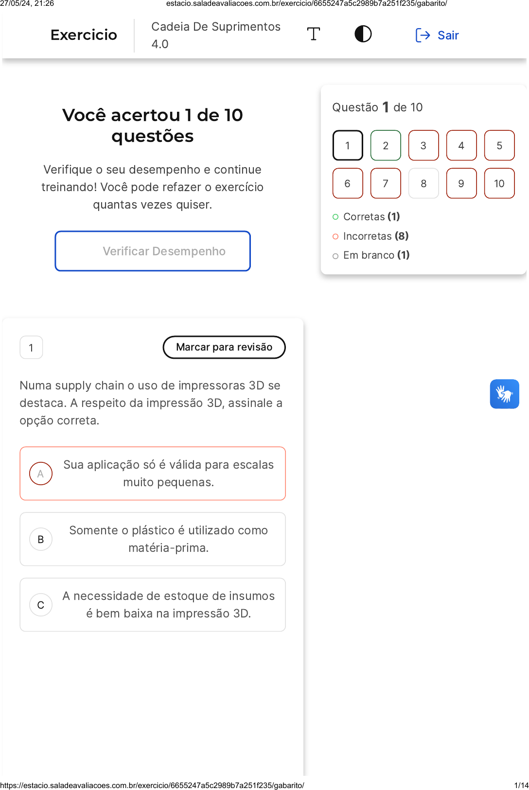 Você acertou 1 de 10 questões Verifique o seu desempenho e continue treinando! Você pode refazer o exercício quantas vezes quiser. Verificar Desempenho A B C 1 Marcar para revisão Numa supply chain o uso de impressoras 3D se destaca. A respeito da impressão 3D, assinale a opção correta. Sua aplicação só é válida para escalas muito pequenas. Somente o plástico é utilizado como matéria-prima. A necessidade de estoque de insumos é bem baixa na impressão 3D. Questão 1 de 10 Corretas �1� Incorretas �8� Em branco �1� 1 2 3 4 5 6 7 8 9 10 Exercicio Cadeia De Suprimentos 4.0 Sair 27/05/24, 21:26 estacio.saladeavaliacoes.com.br/exercicio/6655247a5c2989b7a251f235/gabarito/ https://estacio.saladeavaliacoes.com.br/exercicio/6655247a5c2989b7a251f235/gabarito/ 1/14 D E A velocidade de impressão é inferior a velocidade de máquinas tradicionais. O acabamento das peças impressas em plástico é impecável, produzindo peças prontas para serem despachadas para expedição. Resposta incorreta Opa! A alternativa correta é a letra D. Confira o gabarito comentado! Gabarito Comentado As impressões 3D não possuem a velocidade das máquinas mais tradicionais, sendo um modelo ainda inadequado para a produção em massa e o atendimento a grandes pedidos. Podendo produzir com diversas matérias-primas, como aço, fibra de carbono e plástico, em escalas de pequenos objetos a casas inteiras. Outro problema são os insumos necessários para alimentar a impressão 3D. Os locais de impressão ainda deverão ter um estoque de insumos, ou seja, os transportes dos fornecedores de matéria-prima até os locais de produção com impressoras 3D ainda serão necessários. As peças impressas ainda precisam passar por uma série de acabamentos após impressão, para então serem passarem para próxima etapa da cadeia. 2 Marcar para revisão 27/05/24, 21:26 estacio.saladeavaliacoes.com.br/exercicio/6655247a5c2989b7a251f235/gabarito/ https://estacio.saladeavaliacoes.com.br/exercicio/6655247a5c2989b7a251f235/gabarito/ 2/14 A B C D E Assinale a alternativa que descreve corretamente a blockchain Tecnologia de registro distribuído que foca na descentralização como medida de segurança. É uma criptomoeda que automatiza completamente as relações comerciais. A blockchain pode ser considerada um conjunto de boas práticas (semelhante às normas ISO� para se implementar a indústria 4.0. A blockchain ainda não é largamente adotada por não fornecer segurança suficiente em comparação às alternativas existentes. Quando a empresa adota a tecnologia de blockchain significa que está com sua cadeia completamente automatizada. Resposta correta Parabéns, você selecionou a alternativa correta. Confira o gabarito comentado! Gabarito Comentado A blockchain é uma tecnologia de registro distribuído que se concentra na descentralização como medida de segurança. Isso significa que, em vez de ter um ponto central de controle, a blockchain 27/05/24, 21:26 estacio.saladeavaliacoes.com.br/exercicio/6655247a5c2989b7a251f235/gabarito/ https://estacio.saladeavaliacoes.com.br/exercicio/6655247a5c2989b7a251f235/gabarito/ 3/14 A B C D E distribui suas operações entre uma rede de computadores, tornando-a mais segura contra ataques cibernéticos e fraudes. As outras alternativas apresentam conceitos e características que não descrevem corretamente o que é a blockchain. 3 Marcar para revisão Indique a alternativa em que todos os conceitos se relacionam com a indústria 4.0� Smart cities, Economia circular e IoT. Análise de redes, Economia circular e Kaizen. Full truck Load, Veículos não tripulados e Smart cities. Blockchain, hoshin kanri e Kaizen. Conectividade, Análise de dados em tempo real e interação homem- máquina. Resposta incorreta Opa! A alternativa correta é a letra E. Confira o gabarito comentado! Gabarito Comentado A alternativa correta é a que menciona "Conectividade, Análise de dados em 27/05/24, 21:26 estacio.saladeavaliacoes.com.br/exercicio/6655247a5c2989b7a251f235/gabarito/ https://estacio.saladeavaliacoes.com.br/exercicio/6655247a5c2989b7a251f235/gabarito/ 4/14 A B C tempo real e interação homem-máquina". Esses três conceitos são fundamentais na indústria 4.0. A conectividade permite a comunicação entre máquinas e sistemas, a análise de dados em tempo real possibilita a tomada de decisões rápidas e eficientes, e a interação homem-máquina é um elemento chave para a automação e a otimização dos processos industriais. 4 Marcar para revisão A transformação digital trouxe como uma consequência do conceito de indústria 4.0 o supply chain 4.0. Sobre esse contexto, assinale a alternativa correta que faz parte das considerações necessárias para a implementação destes conceitos. Utilizar a automatização de todas estações de trabalho. Modelos produtivos anteriores não se aplicam a novas implementações, visto a complexidade de um ramo de trabalho para o outro. Ferramentas como o Lean são importantes, mas sua aplicação só funciona em empresas de grande porte. 27/05/24, 21:26 estacio.saladeavaliacoes.com.br/exercicio/6655247a5c2989b7a251f235/gabarito/ https://estacio.saladeavaliacoes.com.br/exercicio/6655247a5c2989b7a251f235/gabarito/ 5/14 D E Considerar a utilização do conceito para toda a cadeia. Uma empresa não necessita de gerenciamento de processos de negócios dentro destes conceitos. Resposta incorreta Opa! A alternativa correta é a letra D. Confira o gabarito comentado! Gabarito Comentado Deve se realizar as seguintes considerações para a implementação dos conceitos de supply chain 4.0� ‒ Entender os modelos produtivos anteriores, elaborando, assim, o processo de automação de uma empresa. ‒ Expandir seu conceito para toda a cadeia. ‒ Considerar também alguns princípios preconizados pelo lean e pelo gerenciamento de processos de negócios. 5 Marcar para revisão Em uma empresa de manufatura, a implementação do block
