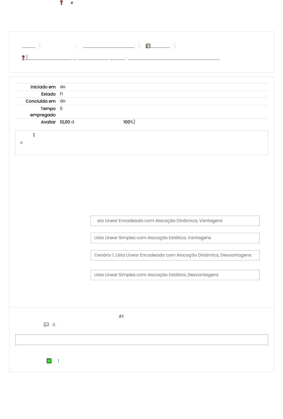 Painel Meus cursos 32010001906-T01-2024-1 📚 Módulo 1 📍 [Checkout de Presença] Módulo 1 - Noções de gerenciamento de memória e listas lineares Iniciado em domingo, 26 mai 2024, 19:13 Estado Finalizada Concluída em domingo, 26 mai 2024, 19:19 Tempo empregado 5 minutos 19 segundos Avaliar 10,00 de um máximo de 10,00(100%) Questão 1 Correto Atingiu 10,00 de 10,00 Considere o seguinte cenário: Um usuário dispõe de um computador com memória limitada e deseja construir um programa para armazenar um conjunto de informações que cresce dinamicamente. Além disso, não há um padrão previsível em relação a quais informações do conjunto serão necessárias no transcorrer da execução do programa. Agora, considerando o cenário descrito acima, relacione corretamente os pontos positivos e negativos do uso de listas lineares simples e encadeadas para armazenar o conjunto de informações: Menor consumo de memória Acesso aleatório eficiente Acesso aleatório ineficiente Alto consumo de memória fixo e alto custo para o crescimento dinâmico Lista Linear Encadeada com Alocação Dinâmica, Vantagens Lista Linear Simples com Alocação Estática, Vantagens Cenário 1, Lista Linear Encadeada com Alocação Dinâmica, Desvantagens Lista Linear Simples com Alocação Estática, Desvantagens Atividade anterior ◄ 💬 Fórum de Discussão do Módulo 1 - Noções de gerenciamento de memória e listas lineares Seguir para... Próxima atividade ✅ [A1] Avaliação do Módulo 1 - Noções de gerenciamento de memória e listas lineares ► Manter contato Suporte Técnico ao Usuário 26/05/2024, 19:19 📍 [Checkout de Presença] Módulo 1 - Noções de gerenciamento de memória e listas lineares: Revisão da tentativa https://ava.ufms.br/mod/quiz/review.php?attempt=966891&cmid=738886 1/2 https://ava.ufms.br/my/ https://ava.ufms.br/course/view.php?id=53724 https://ava.ufms.br/course/view.php?id=53724#section-2 https://ava.ufms.br/mod/quiz/view.php?id=738886 https://ava.ufms.br/mod/forum/view.php?id=738885&forceview=1 https://ava.ufms.br/mod/quiz/view.php?id=738888&forceview=1 https://suporteagetic.ufms.br (67) 3345-7613 suporte.agead@ufms.br 26/05/2024, 19:19 📍 [Checkout de Presença] Módulo 1 - Noções de gerenciamento de memória e listas lineares: Revisão da tentativa https://ava.ufms.br/mod/quiz/review.php?attempt=966891&cmid=738886 2/2 https://suporteagetic.ufms.br/ tel:(67) 3345-7613 mailto:suporte.agead@ufms.br https://api.whatsapp.com/send?phone=556733457613