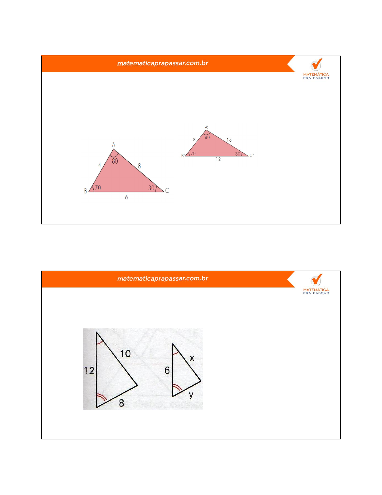 1 1 SEMELHANÇA DE TRIÂNGULOS Dois triângulos são semelhantes quando tem os ângulos respectivamente congruentes e os lados correspondentes proporcionais. 2 determine os valores de x e y nos casos abaixo : a) 2 3 b) 4 c) 3 5 d) 6 e) 4 7 Determine a medida do lado do quadrado da figura abaixo : 8 A figura mostra um “esquema”, no qual BC é paralelo a DE . AB = 20cm , BD = 16cm e CE = 20cm . a medida de AC é igual: 5 9 A incidência dos raios solares faz com que os extremos das sombras do homem e da árvore coincidam. O homem tem 1,80m de altura e sua sombra mede 2 m. Se a sombra da árvore mede 5m, a altura mede: 10 As bases de um trapézio ABCD medem 50 cm e 30 cm e a altura 10 cm. Prolongando-se os lados não paralelos, eles se interceptam num ponto E. determine a altura EF do triângulo ABE e a altura EG do triângulo CDE. 6 11 Para medir a largura x de um lago, foi utilizado o esquema abaixo. Nessas condições, obteve-se um triângulo ABC semelhante a um triângulo EDC. Determine, então, a largura x do lago. 12 Considere os triângulos semelhantes ABC e DEF representados abaixo. Considere, também, que possuem a mesma medida os ângulos BAC e EDF, ACB e DFE e, CBA e FED. Se a área do triângulo ABC é 12 cm2 e a do triângulo DEF é 300 cm2, determine a medida do lado DE em função de x.
