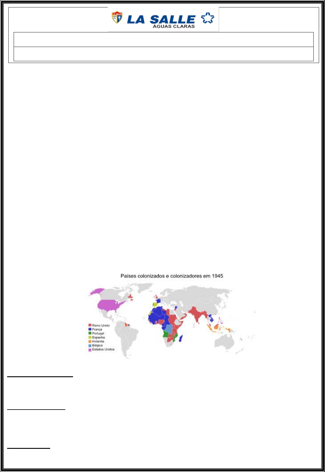 Estudante: 6º Ano/Turma: Educador: Franco Augusto C. Curricular: Geografia Atividades de Geografia Os mapas temáticos são representações gráficas da superfície terrestre ilustradas de acordo com algum critério preestabelecido. Para designar os diferentes aspectos do espaço geográfico, utilizam-se as legendas e os símbolos a elas correspondentes para espacializar determinados fenômenos. Mais do que apenas realizar descrições espaciais sobre determinadas atividades ou fenômenos naturais, os mapas temáticos também possuem o mérito de apresentarem formas distintas de leitura e interpretações da realidade, ofertando ao seu leitor uma melhor noção das manifestações sociais e da natureza, como as atividades culturais de uma região ou os índices pluviométricos de um país. Portanto, a produção dos mapas temáticos vai muito além da representação das áreas e suas formas, trata-se de reinterpretações dessas para melhor descrever dados e fenômenos. A seguir, os principais tipos de mapas temáticos. Mapas históricos: como o próprio nome indica, esse tipo de mapa representa algum acontecimento histórico nas suas mais variadas escalas. Eles necessitam de um título que aponte o período de sua ocorrência para melhor situar o leitor quanto ao contexto de época das informações descritas. Alguns mapas históricos também possuem a importante função de descrever como era realizada a técnica da cartografia em tempos pretéritos, bem como a visão de mundo que se tinha antigamente, antes do descobrimento das Américas, por exemplo. Mapas demográficos: são elaborados para descrever dados relacionados com a população de um determinado território. Podem explicitar a quantidade de habitantes, a localização, a densidade de ocupação ou os fluxos migratórios. Mapas econômicos: descrevem as atividades econômicas e a apropriação do espaço geográfico por elas realizada. Os mapas econômicos são importantes na compreensão de temas como a expansão da agropecuária, a localização industrial, a disponibilidade e a extração de recursos naturais, os sistemas de produção de energia, o conjunto de meios de transporte existente em um território, entre outras questões Mapas físicos: apontam a localização e a distribuição de elementos naturais, dividindo-se em vários subtipos, como os mapas topográficos (formas de relevo), os hidrográficos (cursos d'água), os hipsométricos (variações de altitudes), climáticos (variações atmosféricas), dentre tantos outros. Com eles, é possível realizar ações de planejamento de atividades econômicas ou de formas de ocupação e transformação dos solos. 1. Sobre os mapas temáticos, responda os itens a seguir: a) O que são mapas temáticos? ______________________________________________________________________________________ ______________________________________________________________________________________ ______________________________________________________________________________________ ______________________________________________________________________________________ b) Mapas físicos: ______________________________________________________________________________________ ______________________________________________________________________________________ ______________________________________________________________________________________ ______________________________________________________________________________________ c) Mapas demográficos: ______________________________________________________________________________________ ______________________________________________________________________________________ ______________________________________________________________________________________ ______________________________________________________________________________________ d) Mapas econômicos: ______________________________________________________________________________________ ______________________________________________________________________________________ ______________________________________________________________________________________ ______________________________________________________________________________________ 2. Qual a importância dos mapas e da cartografia? ______________________________________________________________________________________ ______________________________________________________________________________________ ______________________________________________________________________________________ ______________________________________________________________________________________ ______________________________________________________________________________________ De acordo com a escala, os mapas desempenham funções diferentes. Sobre as características de Planta, planisfério e globo terrestre, julgue os itens a seguir com (C) para certo e (E) para errado. 3. Quando se deseja representar uma área restrita, como uma casa, um bairro ou uma cidade, recorre-se ao globo terrestre. 4. Quando se deseja representar uma grande extensão de terras, como toda a superfície terrestre, utiliza-se o planisfério ou mapa-múndi. 5. Plantas são utilizadas em pequenas representações tais como: casas, apartamentos, lojas comerciais e shoppings. 6. Um globo terrestre representa a forma e a superfície terrestre da Terra com mais fidelidade que um mapa e é um instrumento didático amplamente utilizado. 7. As escalas dos mapas permitem representar um espaço qualquer em tamanho reduzido, independentemente de sua extensão real. 8. Explique o que são imagens orbitais e qual sua utilidade para a cartografia? ______________________________________________________________________________________ ______________________________________________________________________________________ ______________________________________________________________________________________ ______________________________________________________________________