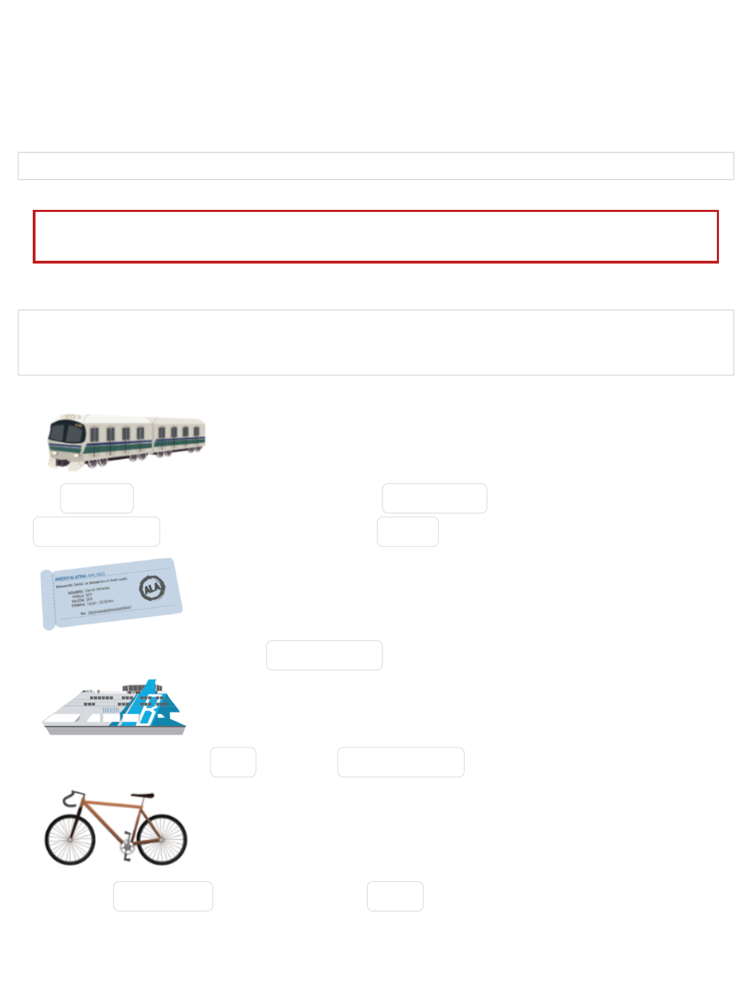 Iniciado em quarta-feira, 15 mai. 2024, 16:11 Estado Finalizada Concluída em quarta-feira, 15 mai. 2024, 16:14 Tempo empregado 3 minutos 7 segundos Notas 1,00/1,00 Avaliar 10,00 de um máximo de 10,00(100%) Informação Questão 1 Correto Atingiu 1,00 de 1,00 Completa las frases de acuerdo con las imágenes de los medios de transporte y las informaciones correspondientes, utilizando los contenidos que has estudiado en esta clase. 1. Tu TieneS (tener) que ir hasta al cajero automático veinticuatro (24) horas y sacar ochenta y cinco ($85,00) pesos para poder tomar el METRO . 2. El pasaje aéreo se puede cancelar con cuarenta y ocho (48) horas de antelación. 3. El crucero de la señorita Rosa va (ir) a durar treinta y siete (37) días de viaje. 4. Si vamos en La bicicleta es seguro que llegamos A la playa con dos horas de retraso. 15/05/24, 16:14 3.17 Teste seus conhecimentos: retomando: Revisão da tentativa https://aprendamais.mec.gov.br/mod/quiz/review.php?attempt=4457860&cmid=51011 1/1