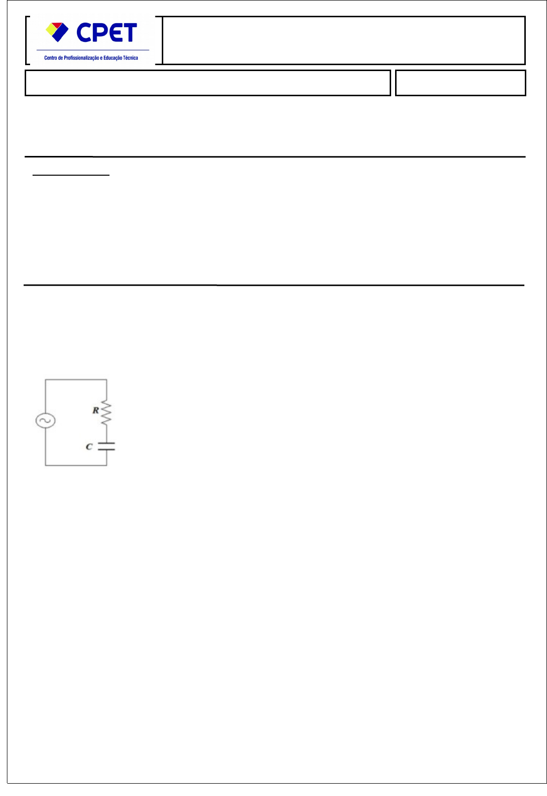 ELETRICIDADE II (2023) FINAL Data: 13/10/2023 Aluno(a): Sidnei Cavalcante leite. CPF:22683729871 Atividade Prática INSTRUÇÕES: · Esta Atividade contém questões totalizando 10 (dez) pontos; · Você deve preencher dos dados no Cabeçalho para sua identificação: · Nome / Data de entrega. · As respostas devem ser digitadas abaixo de cada pergunta; · Ao terminar salve o arquivo no formato PDF ou DOC; · Envio o arquivo pelo sistema no local indicado; · Em caso de dúvidas consulte o seu Tutor. Atenção: informe a resolução com os cálculos . Neste circuito RC série alimentada por uma fonte senoidal de (12,5/π) Hz, 50√2 V de pico. Os valores R e C são respectivamente iguais a 50Ω e 500μF. Determine o valor da tensão eficaz e a reatância capacitiva: valor eficaz da tensão é de 50 V. A reatância capacitiva é de 80Ω. Resolução dos cálculos de tensão eficaz da fonte: V=(V_m)/(√(2))=(50√(2)V)/(√(2))=50V V= ____(Vm)____=____ ( 50√(2).V)____= 50V (√(2) ) (√(2) ) Sendo Vm a amplitude da tensão. Essa relação entre o valor eficaz e a amplitude é válida somente para sinais senoidais. Determinação da reactância capacitiva Tendo-se a capacitância C do capacitor e a frequência do sinal senoidal podemos calcular a reactância capacitiva do capacitor em função destes parâmetros: X_C=(1)/(2\pi fC)=(1)/(2\pi \cdot (12,5)/(\pi)\cdot 5* 10^(-4)F)\nX_C=80\Omega Atividade Prática Serviços de Turismo e Viagens - GUI image1.png image3.jpg image2.png