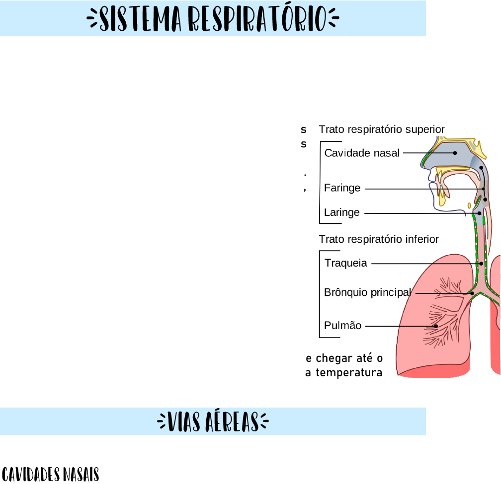 As vias aéreas são responsáveis pelo transporte do ar até os pulmões, onde ocorrem as trocas gasosas que irão oxigenar o sangue e retirar o gás carbônico circulante. Além disso, o sistema respiratório também participa da fonação (articulação da fala) e da percepção olfatória. As vias aéreas podem ser anatomicamente divididas em vias aéreas superiores e vias aéreas inferiores. As vias aéreas superiores têm localização extratorácica e são constituídas pelas cavidades nasais, faringe e laringe. Já as vias aéreas inferiores têm localização intratorácica, e é composta pela traqueia, brônquios, bronquíolos e alvéolos, que são as estruturas funcionais do pulmão. Fisiologicamente, as vias aéreas podem ser divididas em porção condutora e porção respiratória, ou seja, porção por onde o ar é conduzido e porção onde realmente ocorrem as trocas gasosas. Durante seu transporte até o pulmão, o ar é aquecido e purificado pelas estruturas presentes no epitélio respiratório, além da própria constituição anatômica do trato respiratório, que força o ar a “fazer voltas” antes de chegar até o pulmão, aquecendo e esfriando esse ar até a alcançar a temperatura ideal. Nariz – Composição anatômica: • Ossos nasais • Septo nasal • Lâmina perpendicular do etmoide • Vômer • Cartilagens do septo nasal • Narinas • Vestíbulo do nariz • Conchas nasais (superior, média, inferior) A parte externa do nariz é a parte do nariz visível na face e consiste em um arcabouço de sustentação de osso e de cartilagem hialina, recoberto com músculo e pele e revestido por uma túnica mucosa. As estruturas interiores da parte externa do nariz possuem três funções: (1) aquecimento, umedecimento e filtração do ar que entra no nariz; (2) detecção dos estímulos olfatórios (odor); e (3) modificação das vibrações da fala, à medida que passam pelas grandes câmaras ocas de ressonância. Ressonância refere-se ao prolongamento, amplificação ou modificação do som, por meio de vibração. Inferiormente ao epitélio olfatório (os receptores olfatórios situam-se na membrana que reveste as conchas nasais superiores e o septo adjacente, chamada de epitélio olfatório), a túnica mucosa contém capilares e epitélio colunar ciliado pseudoestratificado, com muitas células caliciformes. À medida que o ar inalado rodopia em tomo das conchas e meatos, é aquecido pelo sangue nos capilares. O muco produzido pelas células caliciformes umedece o ar e prende as partículas de poeira. A drenagem dos duetos lacrimonasais também ajuda a umedecer o ar e, ocasionalmente, é auxiliada pelas secreções dos seios paranasais. Os cílios movem o muco e as partículas de poeira aprisionadas em direção à faringe, de onde são deglutidos ou cuspidos, portanto, removendo as partículas do trato respiratório. Nasofaringe – Composição anatômica: • Toro tubário • Óstio da tuba faríngea • Tonsila faríngea É um tubo afunilado medindo aproximadamente 13 cm de comprimento, que começa nos cóanos (abertura nasofaríngea) e se estende até o nível da cartilagem cricoidea, a cartilagem mais inferior da laringe (caixa de voz). A faringe situa-se imediatamente posterior às cavidades nasal e oral, superior à laringe e imediatamente anterior às vértebras cervicais. Sua parede é composta de músculos esqueléticos e é revestida por túnica mucosa. A contração dos músculos esqueléticos auxilia na deglutição. A faringe funciona como uma passagem para o ar e o alimento, fornece uma câmara de ressonância para os sons da fala e aloja as tonsilas, que participam nas reações imunológicas contra invasores estranhos. A parte nasal da faringe é revestida com epitélio colunar ciliado pseudoestratificado e os cílios movimentam o muco para baixo, em direção à parte mais inferior da faringe. A parte nasal da faringe também troca pequenas quantidades de ar com as tubas auditivas, para equalizar a pressão do ar entre a faringe e a orelha média. Composição anatômica: • Cartilagem tireóidea - maior das cartilagens • Cartilagem cricóidea • Articulação cricotireóidea • Cartilagem aritenóidea • Articulação cricoaritenóidea • Cartilagem corniculada • Cartilagem cuneiforme • Epliglote • Músculos da laringe • Cavidade da laringe É uma passagem curta, que conecta a parte laríngea da faringe com a traqueia. Situa-se na linha mediana do pescoço, anteriormente ao esôfago e à 4ª até a 6ª vértebra cervical (C4-C6). A parede da laringe é composta de nove peças de cartilagem. Três ímpares (cartilagem tireóidea – “pomo de Adão” – epiglote e cartilagem cricóidea) e três em pares (cartilagens aritenóidea, cuneiforme e comiculada). Das cartilagens pares, as cartilagens aritenóideas são as mais importantes, uma vez que influenciam as mudanças na posição e tensão das pregas vocais. Os músculos extrínsecos da laringe conectam as cartilagens umas às outras. O revestimento da laringe, acima das pregas vocais, é o epitélio pavimentoso estratificado não queratinizado. O revestimento da laringe, abaixo das pregas vocais, é o epitélio colunar ciliado pseudoestratificado consistindo em células colunares ciliadas, células caliciformes e células basais. O muco produzido pelas células caliciformes ajuda a aprisionar a poeira não removida das passagens superiores. Os cílios, no trato respiratório superior, movimentam o muco e as partículas aprisionadas para baixo, em direção à faringe; os cílios, no trato respiratório inferior, movimentam o muco e as partículas para cima, em direção à faringe. A principal função da laringe é proteger as vias respiratórias, principalmente durante a deglutição, servindo de esfíncter das vias aéreas inferiores com o intuito de mantê-las pérvias. Composição anatômica: • Parte cervical • Parte torácica • Cartilagens traqueais •