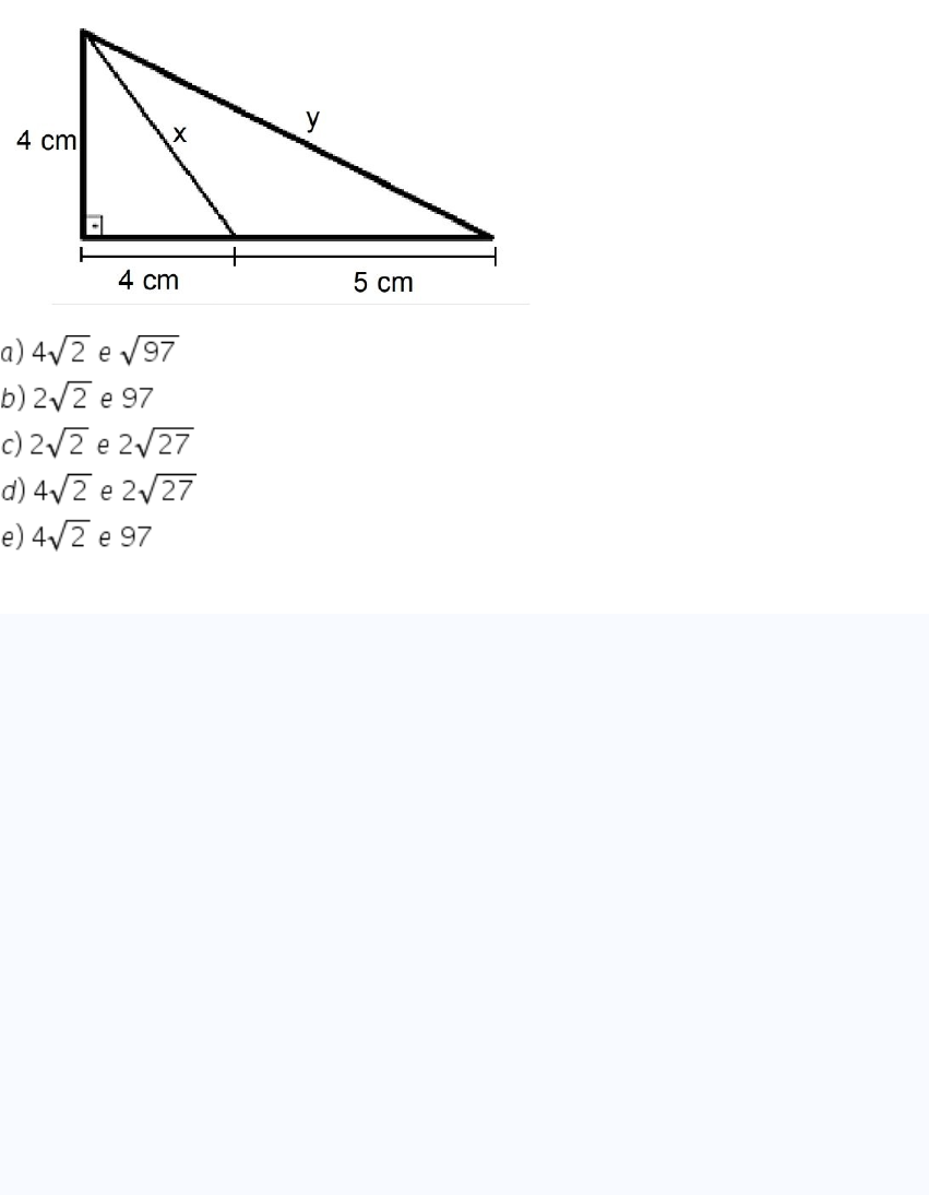 (IFRS - 2016) Na figura abaixo, o valor de x e y, respectivamente, é Ver Resposta Alternativa correta: a) 4√2 e √97. Para encontrar o valor do x, vamos aplicar o teorema de Pitágoras para o triângulo retângulo que possui catetos iguais a 4 cm. x2 = 42 + 42 x2 = 16 + 16 x = √32 x = 4√2 cm Para encontrar o valor de y, também usaremos o teorema de Pitágoras, agora considerando que um cateto mede 4 cm e o outro 9 cm (4 + 5 = 9). y2 = 42 + 92 y2 = 16 + 81 y = √97 cm Portanto, o valor de x e y, respectivamente, é 4√2 e √97. image1.jpeg image2.png