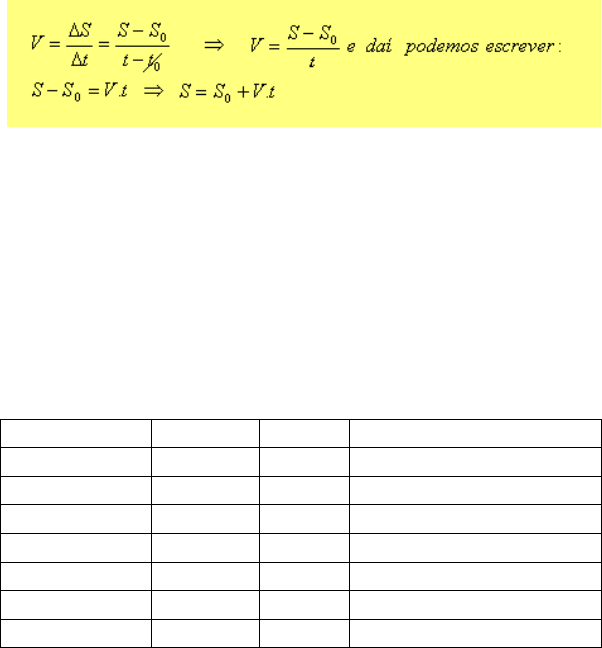 Vamos Estudar Física Nívio Bernardo www.fisicafacilniviobernardo.com 1 12-Função Horária da Posição do Movimento Uniforme Vamos agora chegar a uma função que nos vai fornecer a posição de um móvel sobre uma trajetória em qualquer instante dado. Para isto, vamos supor que um corpo em movimento uniforme, ao passar por certa posição da trajetória, passa a ser observado. Começamos a contar o tempo a partir desta posição, donde teremos t0 =0 (instante inicial) e S0 (posição inicial no instante da observação). Após um certo instante, t qualquer, o móvel estará passando por uma posição S da trajetória (posição final da observação). Como o movimento é uniforme temos: Essa função é denominada Função Horária da Posição e o gráfico desta função (s x t) é sempre uma reta que corta o eixo de S na posição inicial S0 (Veja Exercícios/Exemplos 1 e 2 tópico 11). A denominação “horária” é porque S depende do tempo, ou seja, S é função do tempo S= f(t). Exercícios/Exemplos 1- Preencha as colunas identificando a posição inicial S0, a velocidade V e o sentido do movimento de cada móvel representado pelas funções da primeira coluna. A unidade está no SI. S = s0+vt s0 v Sentido do Movimento S = 4+2t 4m 2m/s progressivo S = 5-3t S = -20+10t S = 5t S = -4t S = –2-8t S = 10-0,5t 2- Vamos agora determinar a função horária da posição da nossa esfera do exemplo 1 citado no tópico 11. Solução: A função horária é dada por: VtSS 0 , onde S0= 6 cm e V= 1,5 cm/s e daí temos: tS 5,16 3- Fazendo uso agora da função horária da posição para o tubo cinemático, determinada no exercício anterior, determine as posições da esfera dentro do tubo cinemático em: T=2s, 5s, 12s, 32s, 40s, 50s. Vamos Estudar Física Nívio Bernardo www.fisicafacilniviobernardo.com 2 Solução: 4- Em uma rodovia federal, um automóvel parte de uma cidade localizada no km 220 e logo fica com movimento uniforme retrógrado com velocidade de 60 km/h. Qual será a posição deste automóvel após 2h e 30 min? Solução: Temos que formular a função horária da posição deste movimento. Para isto temos: .5,2min302 /60 2200 heht hkmV inicialposiçãokmS Daí temos: S=S0+Vt S = 220-60t S = 220-60.2,5 S = 220 –150 =70km 5- Dois móveis A e B, num certo instante, estão passando por um determinado ponto da trajetória indicado na figura abaixo com velocidades, respectivamente, iguais a 60 km/h e 80 km/h em valores absolutos. Responda: a) Faça uma avaliação prévia analisando onde se dará mais ou menos o encontro. b) Qual o tempo de encontro? c) Determine a posição do encontro resolvendo algebricamente, ou seja, fazendo uso das funções. d) Construa o gráfico de S x t de ambos móveis num mesmo plano cartesiano. e) Determine no gráfico o par ordenado do ponto de interseção dos gráficos. f) O que este par ordenado representa fisicamente? Solução: Antes de qualquer coisa, temos que determinar as funções horárias das posições de cada móvel, pois são elas que nos fornecem as posições dos mesmos em qualquer instante dado. Móvel A Posição inicial kmS A 500 Velocidade hkmVA /60 ( movimento progressivo). Função horária tStVSS AAAA 60500 Móvel B Posição inicial kmS B 1200 Velocidade hkmV /80 (movimento retrógrado) Função horária tStVSS BBBB 801200 (o sinal negativo indica que o movimento é retrógrado) Vamos Estudar Física Nívio Bernardo www.fisicafacilniviobernardo.com 3 Agora, de posse das funções, podemos resolver o que se pede. a) O que podemos garantir no momento do encontro dos dois móveis é que eles terão as mesmas posições e, então, podemos afirmar que neste instante BA SS , ou seja, a posição do móvel A é a mesma do móvel B. Igualando as funções temos: Isto significa que, após 0,5h, eles se encontrarão. b) Podemos estimar a posição do encontro sem dificuldades, pois o movimento é uniforme (velocidades constantes para ambos) e a velocidade do carro B é maior que a do carro A, logo, B aproximar-se-á mais rapidamente. Como o ponto médio entre eles é a posição S=85m, o encontro deverá acontecer entre as posições S=50m e S=85m. c) Uma vez que temos o instante do encontro dos dois móveis é só substituir em qualquer das funções horárias que teremos a posição do encontro. Faça isto. Exercícios Propostos 3.2 1- (Fuvest-SP) Uma pessoa caminha com passadas iguais de 80 cm com velocidade constante de 2m/s. a) Quantos metros essa pessoa caminha em 60s? b) Quantos passos ela dá por segundo? 2- Dois carros A e B, num certo instante, estão afastados de 10 km. Eles caminham no mesmo sentido com velocidades, respectivamente, de 100 km/h e 120 km/h e o carro B está à frente de A. Determine a distância entre eles após 3 h de movimento. 3-Dois móveis A e B estão em movimento uniforme sobre uma mesma reta, no mesmo sentido, com velocidades, respectivamente, igual a 100 km/h e 120 km/h. Num certo instante, B está 10 km à frente de A. Determine depois de quanto tempo a distância entre eles será de 70 km. 4-(NARB) Um móvel obedece à função horária )(520 SItS . a) Represente o móvel na sua trajetória. b) Qual o instante em que o móvel passa pela posição 30 m? c) Qual o instante em que ele passa pela origem dos espaços? d) Qual o instante em que ele passa pela posição –30 m? e) Construa o gráfico de s x t. 50 60 120 80 60 80 120 50 140 70 70 1 0,5 140 2 A BS S t t t t t t h h Vamos Estudar Física Nívio Bernardo www.fisicafacilniviobernardo.com 4 5-(NARB) Dois carros, num certo instante, encontravam-se nas posições 40 km e 80 km de uma estrada com velocidades de 60 km/h e 40 km/h, respectivamente, no mesmo sentido. a) Represente-os numa trajetória. b) Determine o instante e a posição de encontro. c) Construa o gráfico s x t de ambos num mesmo plano cartesiano. d) Originar no gráfico o par ordenado do ponto de interseção dos gráficos. e) O que este par ordenado representa fisicame