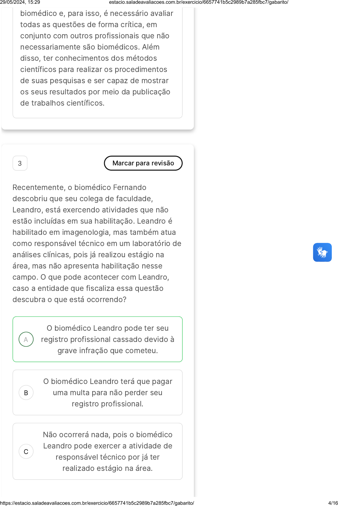 A B C biomédico e, para isso, é necessário avaliar todas as questões de forma crítica, em conjunto com outros profissionais que não necessariamente são biomédicos. Além disso, ter conhecimentos dos métodos científicos para realizar os procedimentos de suas pesquisas e ser capaz de mostrar os seus resultados por meio da publicação de trabalhos científicos. 3 Marcar para revisão Recentemente, o biomédico Fernando descobriu que seu colega de faculdade, Leandro, está exercendo atividades que não estão incluídas em sua habilitação. Leandro é habilitado em imagenologia, mas também atua como responsável técnico em um laboratório de análises clínicas, pois já realizou estágio na área, mas não apresenta habilitação nesse campo. O que pode acontecer com Leandro, caso a entidade que fiscaliza essa questão descubra o que está ocorrendo? O biomédico Leandro pode ter seu registro profissional cassado devido à grave infração que cometeu. O biomédico Leandro terá que pagar uma multa para não perder seu registro profissional. Não ocorrerá nada, pois o biomédico Leandro pode exercer a atividade de responsável técnico por já ter realizado estágio na área. 29/05/2024, 15:29 estacio.saladeavaliacoes.com.br/exercicio/6657741b5c2989b7a285fbc7/gabarito/ https://estacio.saladeavaliacoes.com.br/exercicio/6657741b5c2989b7a285fbc7/gabarito/ 4/16