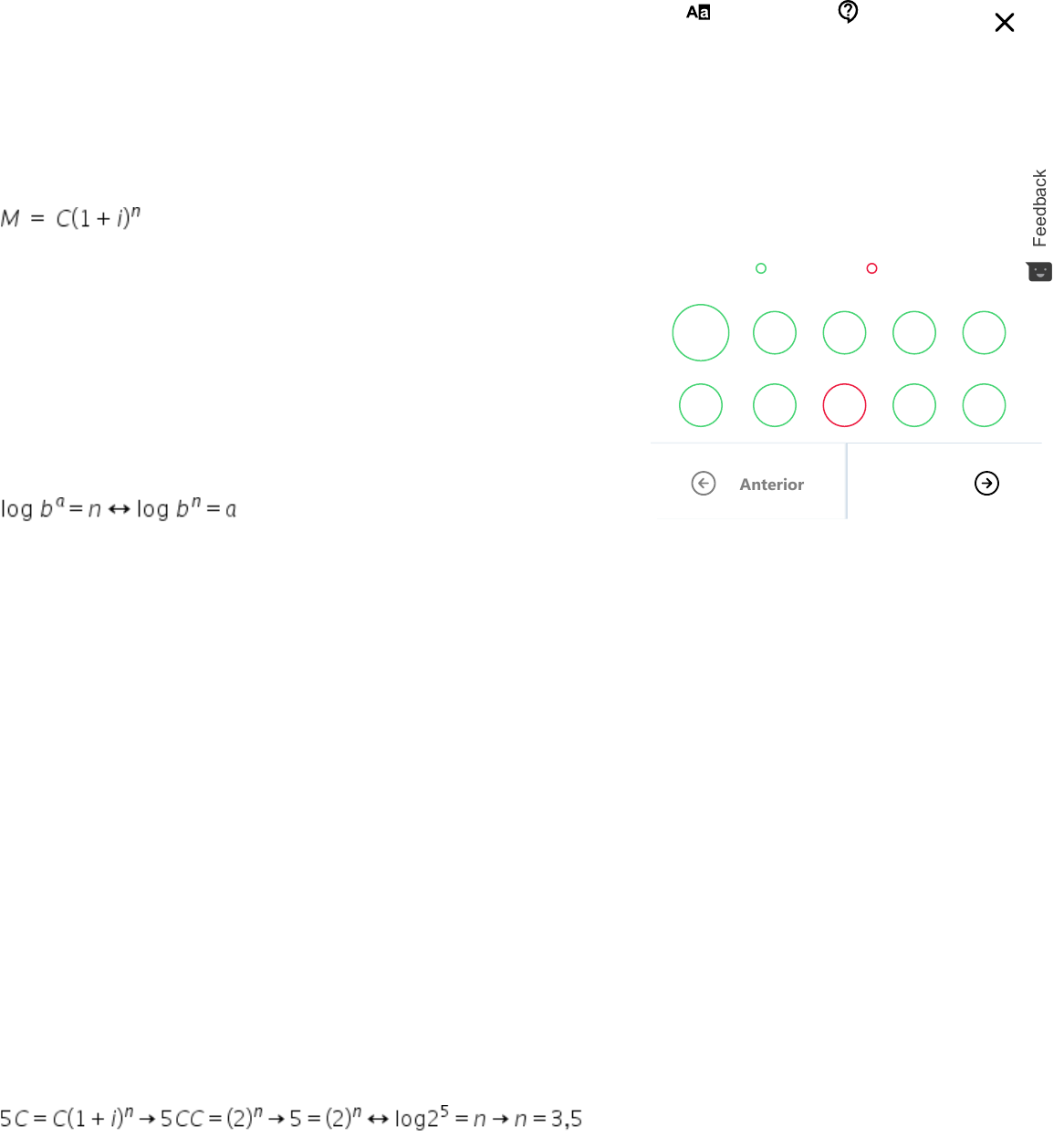 Questão 1 Respondida A maioria das aplicações financeiras realizadas atualmente adotam o regime de juros compostos, onde determinado capital (C) aplicado por determinado período de tempo (n) a uma taxa de juros (i) retorna um montante (M) conforme fórmula a seguir: . Percebe-se que, quando o valor desconhecido numa transação refere-se a "n", a operação para se descobrir o período respeita uma função logarítmica. Dessa forma, considerando um número "b" , positivo e diferente de "1", e um número "a" positivo, lemos logaritmo de "a" na base "b" e ao expoente "n" que se deve dar a base "b" de modo que a potência resultante seja "a", assim: . Dessa forma, considerando os conceitos de logaritmo e que o log2 = 0,30103 e log3 = 0,47712 (ambos na base 10), avalie as seguintes asserções e a relação proposta entre elas: I. Considerando uma taxa de juros de 100% ao mês, um capital C irá quintuplicar em um período de 3 meses e meio. PORQUE II. A esse capital foi aplicado uma remuneração dada pela equação: Dados: Prova final Matemática Financeira Acertos 9 de 10 Nota 45 pontos Corretas Erradas 1 2 3 4 5 6 7 8 9 10 PróximaAnterior Correção da prova Tamanho da fonte Falar com o tutor Fe ed ba ck A respeito do texto-base e das asserções, pede-se para que seja assinalada a opção correta: As asserções I e II são proposições verdadeiras, e a II é uma justifica correta da I. As asserções I e II são proposições verdadeiras, mas a II não é uma justifica correta da I. A asserção I é uma proposição verdadeira, e a II é uma proposição falsa. A asserção I é uma proposição falsa, e a II é uma proposição verdadeira. Tanto a asserção I quanto a asserção II são proposições falsas. Tanto a asserção I quanto a asserção II são proposições falsas. Sua resposta Fe ed ba ck Com base no texto-base, e uso de conhecimentos matemáticos, o aluno deve avaliar as asserções como segue. ASSERÇÃO I - Capital aplicado = C, montante resgatado de 5C, e taxa de juros ou 1, temos: Transformando a potência em logaritmo temos: Dessa forma, o prazo de operação para que o capital seja quintuplicado é de cerca de 2 meses e 9 dias. Pela explicação, percebe-se que tanto a proposição I quanto a proposição II são falsas. Fe ed ba ck