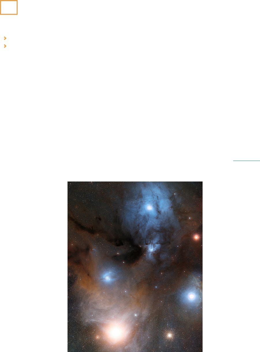 20.1 The Interstellar Medium Learning Objectives By the end of this section, you will be able to: Explain how much interstellar matter there is in the Milky Way, and what its typical density is Describe how the interstellar medium is divided into gaseous and solid components Astronomers refer to all the material between stars as interstellar matter; the entire collection of interstellar matter is called the interstellar medium (ISM). Some interstellar material is concentrated into giant clouds, each of which is known as a nebula (plural “nebulae,” Latin for “clouds”). The best-known nebulae are the ones that we can see glowing or reflecting visible light; there are many pictures of these in this chapter. Interstellar clouds do not last for the lifetime of the universe. Instead, they are like clouds on Earth, constantly shifting, merging with each other, growing, or dispersing. Some become dense and massive enough to collapse under their own gravity, forming new stars. When stars die, they, in turn, eject some of their material into interstellar space. This material can then form new clouds and begin the cycle over again. About 99% of the material between the stars is in the form of a gas—that is, it consists of individual atoms or molecules. The most abundant elements in this gas are hydrogen and helium (which we saw are also the most abundant elements in the stars), but the gas also includes other elements. Some of the gas is in the form of molecules—combinations of atoms. The remaining 1% of the interstellar material is solid—frozen particles consisting of many atoms and molecules that are called interstellar grains or interstellar dust (Figure 20.2). A typical dust grain consists of a core of rocklike material (silicates) or graphite surrounded by a mantle of ices; water, methane, and ammonia are probably the most abundant ices. Figure 20.2 Various Types of Interstellar Matter. The reddish nebulae in this spectacular photograph glow with light emitted by hydrogen atoms. The darkest areas are clouds of dust that block the light from stars behind them. The upper part of the picture is filled with the bluish glow of light reflected from hot stars embedded in the outskirts of a huge, cool cloud of dust and gas. The cool supergiant star Antares can be seen as a big, reddish patch in the lower-left part of the picture. The star is shedding some of its outer atmosphere and is surrounded by a cloud of its own making that reflects the red light of the star. The red nebula in the middle right partially surrounds the star Sigma Scorpii. (To the right of Antares, you can see M4, a much more distant cluster of extremely old 648 20 • Between the Stars: Gas and Dust in Space Access for free at openstax.org stars.) (credit: modification of work by ESO/Digitized Sky Survey 2) If all the interstellar gas within the Galaxy were spread out smoothly, there would be only about one atom of gas per cm3 in interstellar space. (In contrast, the air in the room where you are reading this book has roughly 1019 atoms per cm3.) The dust grains are even scarcer. A km3 of space would contain only a few hundred to a few thousand tiny grains, each typically less than one ten-thousandth of a millimeter in diameter. These numbers are just averages, however, because the gas and dust are distributed in a patchy and irregular way, much as water vapor in Earth’s atmosphere is often concentrated into clouds. In some interstellar clouds, the density of gas and dust may exceed the average by as much as a thousand times or more, but even this density is more nearly a vacuum than any we can make on Earth. To show what we mean, let’s imagine a vertical tube of air reaching from the ground to the top of Earth’s atmosphere with a cross-section of 1 square meter. Now let us extend the same-size tube from the top of the atmosphere all the way to the edge of the observable universe—over 10 billion light-years away. Long though it is, the second tube would still contain fewer atoms than the one in our planet’s atmosphere. While the density of interstellar matter is very low, the volume of space in which such matter is found is huge, and so its total mass is substantial. To see why, we must bear in mind that stars occupy only a tiny fraction of the volume of the Milky Way Galaxy. For example, it takes light only about four seconds to travel a distance equal to the diameter of the Sun, but more than four years to travel from the Sun to the nearest star. Even though the spaces among the stars are sparsely populated, there’s a lot of space out there! Astronomers estimate that the total mass of gas and dust in the Milky Way Galaxy is equal to about 15% of the mass contained in stars. This means that the mass of the interstellar matter in our Galaxy amounts to about 10 billion times the mass of the Sun. There is plenty of raw material in the Galaxy to make generations of new stars and planets (and perhaps even astronomy students). E X A M P L E 2 0 . 1 Estimating Interstellar Mass You can make a rough estimate of how much interstellar mass our Galaxy contains and also how many new stars could be made from this interstellar matter. All you need to know is how big the Galaxy is and the average density using this formula: You have to remember to use consistent units—such as meters and kilograms. We will assume that our Galaxy is shaped like a cylinder; the volume of a cylinder equals the area of its base times its height where R is the radius of the cylinder and h is its height. Suppose that the average density of hydrogen gas in our Galaxy is one atom per cm3. Each hydrogen atom has a mass of 1.7 × 10−27 kg. If the Galaxy is a cylinder with a diameter of 100,000 light-years and a height of 300 light-years, what is the mass of this gas? How many solar-mass stars (2.0 × 1030 kg) could be produced from this mass of gas if it were all turned into stars? Solution If the diameter of the Galaxy is 100,000 light-years