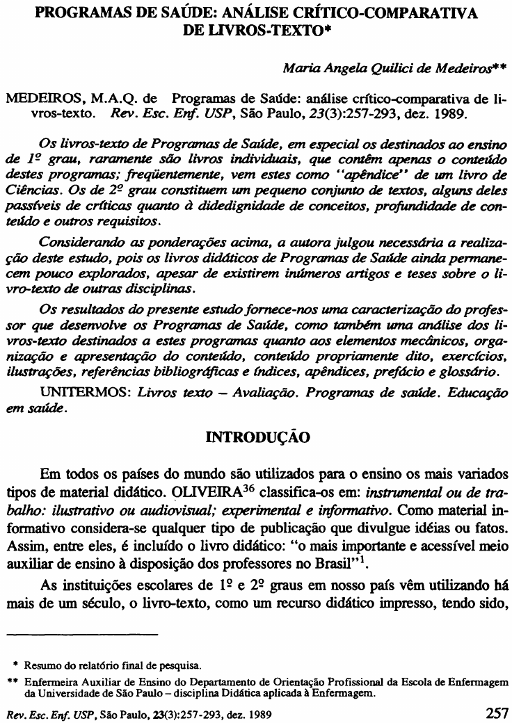 PROGRAMAS DE SAÚDE: ANÁLISE CRÍTICO-COMPARATIVA DE LTVROS-TEXTO* María Angela Quilici de Medeiros** MEDEIROS, M.A.Q. de Programas de Saúde: análise crítico-comparativa de li- vros-texto. Rev. Esc. Enf. USP, São Paulo, 23(3):257-293, dez. 1989. Os livros-texto de Programas de Saúde, em especial os destinados ao ensino de 1- grau, raramente são livros individuais, que contêm apenas o conteúdo destes programas; freqüentemente, vem estes como "apêndice" de um livro de Ciências. Os de 2- grau constituem um pequeno conjunto de textos, alguns deles passíveis de críticas quanto à didedignidade de conceitos, profundidade de con teúdo e outros requisitos. Considerando as ponderações acima, a autora julgou necessária a realiza ção deste estudo, pois os livros didáticos de Programas de Saúde ainda permane cem pouco explorados, apesar de existirem inúmeros artigos e teses sobre o li- vro-texto de outras disciplinas. Os resultados do presente estudo fornece-nos uma caracterização do profes sor que desenvolve os Programas de Saúde, como também uma análise dos li vros-texto destinados a estes programas quanto aos elementos mecânicos, orga nização e apresentação do conteúdo, conteúdo propriamente dito, exercícios, ilustrações, referências bibliográficas e índices, apêndices, prefácio e glossário. UNITERMOS: Livros texto — Avaliação. Programas de saúde. Educação em saúde. INTRODUÇÃO Em todos os países do mundo são utilizados para o ensino os mais variados tipos de material didático. OLIVEIRA 3 6 classifica-os em: instrumental ou de tra balho: ilustrativo ou audiovisual; experimental e informativo. Como material in formativo considera-se qualquer tipo de publicação que divulgue idéias ou fatos. Assim, entre eles, é incluído o livro didático: "o mais importante e acessível meio auxiliar de ensino à disposição dos professores no Brasil" 1 . As instituições escolares de 1- e 2- graus em nosso país vêm utilizando há mais de um século, o livro-texto, como um recurso didático impresso, tendo sido, * Resumo do relatório final de pesquisa. ** Enfermeira Auxiliar de Ensino do Departamento de Orientação Profissional da Escola de Enfermagem da Universidade de São Paulo - disciplina Didática aplicada à Enfermagem. inclusive, objeto de estudo comparativo realizado por BARBANTI 4, estudo este que contribuiu para a história do livro didático brasileiro. A Reforma de Ensino, mstituída pela Lei n 9 5692/71* revolucionou o siste ma educacional brasileiro que passou a dar maior importancia ao livro como ins trumento de trabalho indispensável. Uma pesquisa realizada por FRANCO 2 1 revelou que 80% dos professores consultados utilizam os livros didáticos para ministrarem suas aulas. O tradicional livro didático - considerado um dos mais antigos materiais instrucionais - está presente de maneira significativa em nossas escolas. "O livro didático é a principal leitura da maioria da população estudantil que freqüenta o primeiro grau e, em conseqüência, o principal canal de comunicação escrita na transmissão de uma concepção de Ciência, cientista e método científi- _._ .7" CO . É muito provável que os livros didáticos sejam os únicos livros com os quais interage a grande maioria da população em idade e sco la r 2 1 , 3 2 . O Centro Latino-Americano de Pesquisas em Ciências Sociais vem desen volvendo no Brasil, desde 1972, um trabalho sobre o livro, e já concluiu que, em aproximadamente 70% das casas de alunos de condição sócio-econômica menos favorecida os livros, quando existem, são livros didáticos. Na restropectiva histórica sobre o livro didático no Brasil, OLIVEIRA 3 6 afirma que os tradicionais eram centrados nos conteúdos e na apresentação de in formações, não se preocupando com as necessidades de aprendizagem do aluno e ignorando o processo ensino/aprendizagem. Posteriormente, o livro começou a ser um elemento integrante do ensino, atentando para os comportamentos deseja dos (visão behaviorista), os eventos correspondentes a atividades internas mani puláveis externamente (visão neo-behaviorista) e o processamento de informações e desenvolvimento dos processos intelectuais (visão cognitivista). Desde então, na elaboração dos livros didáticos, os autores preocuparam-se com os objetivos do ensino, o nível de desempenho esperado dos alunos, a adequação entre conteúdos e objetivos, práticas de desempenhos finais e outros. Todo livro, a princípio, pode ser utilizado para fins didáticos, ou seja, numa situação deliberadamente estruturada, com o objetivo de ensinar algo a alguém. Porém, de acordo com MOLINA 3 2 , não é todo livro utilizado para fins didáticos, que se constitui um livro didático, e sim aquela "obra escrita e organizada, com a finalidade específica de ser utilizada numa situação didática, sendo inconfundível porém mutável". * Documenta, Brasília, (129): 400-416 , ago. 1971. Uma análise global sobre este tema revelaria que falta ainda no Brasil, uma lei que defenda o livro dos obstáculos à sua disseminação. É necessário protegê-lo da infiltração de capital estrangeiro e tudo o que dela decorre, como também haver a conscientização de que o livro é, sob certos aspectos, uma indústria de base ina lienável. Num dos simpósios realizados da XXVIII Reunião Anual da Sociedade Bra sileira para o Progresso da Ciência (S.B.P.C.) 4 3 em 1977, o tema foi o problema do livro brasileiro, pois a situação era e é muito precária: o mercado interno é es treito, o externo inviável e a penetração do capital estrangeiro no campo editorial avassaladora - atualmente no Brasil, as editoras estrangeiras controlam 70% do mercado de livros técnicos. Dentre os vários depoimentos deste evento, encontramos o de DUARTE (a- pud 4 3 ) o qual afirma que as escolas modernas, com o uso de audiovisuais e apos tilas, agem desonestamente com os autores que vêem seus te