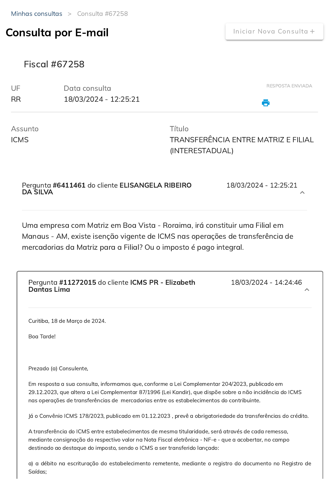 Minhas consultas > Consulta #67258 Consulta por E-mail Iniciar Nova Consulta Fiscal #67258 RR 18/03/2024 - 12:25:21 RESPOSTA ENVIADA ICMS TRANSFERÊNCIA ENTRE MATRIZ E FILIAL (INTERESTADUAL) UF Data consulta Assunto Título Uma empresa com Matriz em Boa Vista - Roraima, irá constituir uma Filial em Manaus - AM, existe isenção vigente de ICMS nas operações de transferência de mercadorias da Matriz para a Filial? Ou o imposto é pago integral. Pergunta #6411461 do cliente ELISANGELA RIBEIRO DA SILVA 18/03/2024 - 12:25:21 Curitiba, 18 de Março de 2024. Boa Tarde! Prezado (a) Consulente, Em resposta a sua consulta, informamos que, conforme a Lei Complementar 204/2023, publicado em 29.12.2023, que altera a Lei Complementar 87/1996 (Lei Kandir), que dispõe sobre a não incidência do ICMS nas operações de transferências de mercadorias entre os estabelecimentos do contribuinte. Já o Convênio ICMS 178/2023, publicado em 01.12.2023 , prevê a obrigatoriedade da transferências do crédito. A transferência do ICMS entre estabelecimentos de mesma titularidade, será através de cada remessa, mediante consignação do respectivo valor na Nota Fiscal eletrônica - NF-e - que a acobertar, no campo destinado ao destaque do imposto, sendo o ICMS a ser transferido lançado: a) a débito na escrituração do estabelecimento remetente, mediante o registro do documento no Registro de Saídas; Pergunta #11272015 do cliente ICMS PR - Elizabeth Dantas Lima 18/03/2024 - 14:24:46 https://www.econeteditora.com.br/consultoria_novo/app/ https://www.econeteditora.com.br/consultoria_novo/app/listar-consulta/ Sua dúvida foi resolvida? SIM, VOLTAR À TELA INICIAL NÃO, PRECISO ENVIAR OUTRA PERGUNTA b) a crédito na escrituração do estabelecimento destinatário, mediante o registro do documento no Registro de Entradas. Contudo, até o momento o Estado não manifestou-se sobre o assunto, como também não alterou o regulamento, desta forma, recomendamos a consulta ao �sco. Atenciosamente, Elizabeth Dantas Lima. Qualidade Econet - Avalie esta consulta, sua opinião é muito importante para nós. AVALIAR RESPOSTAS https://www.econeteditora.com.br/consultoria_novo/app/