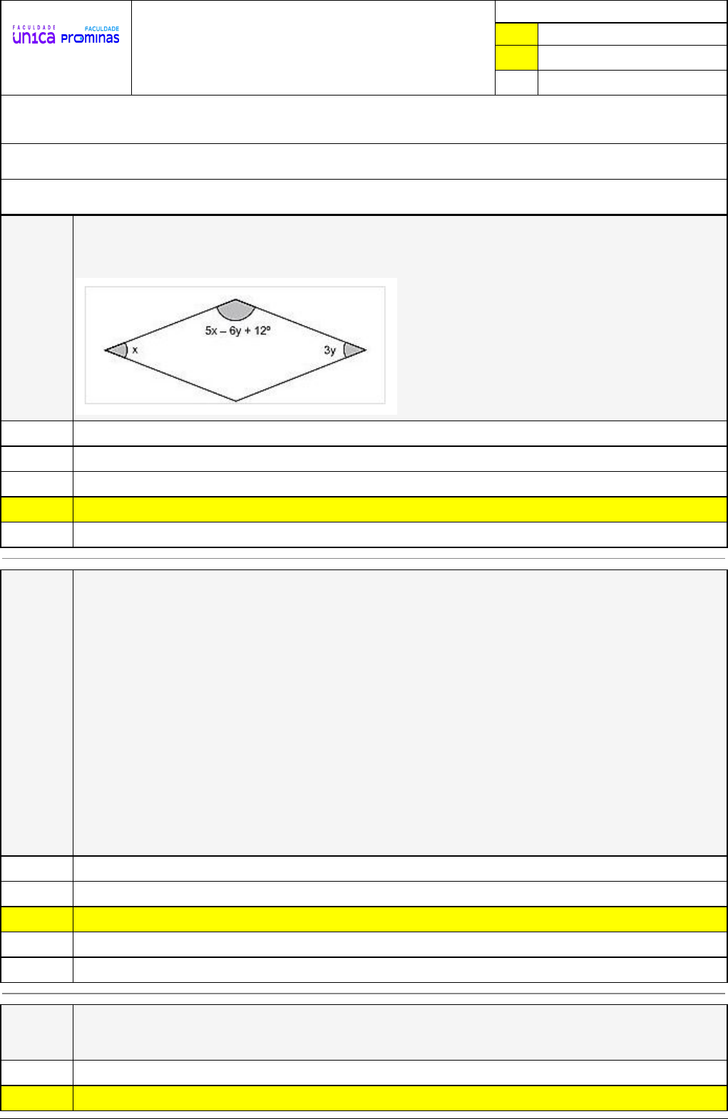 Pincel Atômico - 09/03/2024 00:07:05 1/7 ALAN MICHEL MENDONÇA RIBEIRO Avaliação Online (Curso Online - Automático) Atividade finalizada em 08/03/2024 19:29:59 (1235823 / 1) LEGENDA Resposta correta na questão # Resposta correta - Questão Anulada X Resposta selecionada pelo Aluno Disciplina: GEOMETRIA: FUNDAMENTOS E MÉTODOS DE ENSINO E PRÁTICAS PEDAGÓGICAS [935547] - Avaliação com 20 questões, com o peso total de 50,00 pontos [capítulos - Todos] Turma: Segunda Graduação: Segunda Graduação 6 meses - Licenciatura em Matemática - Grupo: FPD-OUTUBRO/2023 - SGegu0A041023 [101341] Aluno(a): 91516869 - ALAN MICHEL MENDONÇA RIBEIRO - Respondeu 17 questões corretas, obtendo um total de 42,50 pontos como nota [360344_1529 06] Questão 001 (VUNESP/2018/Prefeitura de Buritizal – SP/Oficial Administrativo) Em um losango, os ângulos opostos são congruentes. A figura representa um losango, sendo que as incógnitas x e y representam valores em graus. A soma x + y vale: 24° 72° 40° X 56° 88° [360344_1529 02] Questão 002 Os triângulos e quadriláteros são polígonos utilizados como base para muitos outros conceitos e abstrações da Geometria. Alguns aspectos específicos dessas figuras podem ser interessantes em eventos de construção ou desenhos geométricos. Considere as seguintes sentenças em relação aos triângulos e quadriláteros: (1) Num triângulo, a medida de um lado é sempre menor que a soma das medidas dos outros dois lados. (2) O triângulo equilátero é um tipo de triângulo isósceles. (3) Os pontos notáveis de um triângulo dependem, apenas, de um dos vértices para serem construídos. (4) Os quadriláteros paralelogramos e trapézios são diferenciados pela quantidade de ângulos congruentes e opostos. (5) Um losango é, ao mesmo tempo, um paralelogramo e um retângulo. (6) Trapézios são os quadriláteros convexos com apenas um par de lados paralelos. A soma dos números que acompanham apenas as sentenças verdadeiras é: 5. 6. X 9. 12. 3. [360344_1587 49] Questão 003 (ENADE 2008) No plano cartesiano xOy, as equações x2+y2+y=0 e x2-y-1=0 representam uma circunferência Γ e uma parábola P, respectivamente. Nesse caso: O raio da circunferência Γ é igual a 1. X A reta de equação y=-1 é tangente às curvas Γ e P. Pincel Atômico - 09/03/2024 00:07:05 2/7 Existe uma reta que passa pelo centro de Γ e que não intercepta a parábola P. A parábola P tem concavidade voltada para baixo. As curvas Γ e P têm mais de um ponto em comum. [360344_1528 73] Questão 004 No preâmbulo da Unidade 1 apresentamos o seguinte verso do poeta brasileiro Mário Quintana: “Linha curva: o caminho mais agradável entre dois pontos”. De forma afetuosa, o poeta quis, possivelmente, se inspirar em um dos princípios mais básicos da Geometria para propor uma espécie de paródia romântica. Em qual princípio geométrico Mário Quintana se inspirou para sugerir que há mais de um caminho entre dois pontos, dentre os quais uma linha curva seria o mais agradável, porém, não o único? Ao procedimento de medir e dividir terrenos em que os egípcios já utilizam noções de Geometria de forma prática, inclusive, para capitalizarem suas terras. Ao postulado euclidiano que propõe que um segmento de reta pode ser prolongado indefinidamente para construir uma reta. Ao processo de divisão da circunferência em partes iguais de acordo com o movimento do Sol e da Terra, na região mesopotâmica. À ideia primitiva de que as extremidades da superfície são linhas. X Ao axioma proposto por Euclides em que se pode traçar uma única reta ligando quaisquer dois pontos. [360344_1587 63] Questão 005 A equação do plano que é perpendicular ao vetor u = (7,2,- 3) e passa pelo ponto (4,- 2,1) é: 4x+9z-2=0 10x+2y-4z-14=0 2x+6y-9z-4=0 X 7x + 2y – 3z – 21 = 0 -7x-5y+3z=2=0 [360344_1529 21] Questão 006 (NCE-UFRJ/2018/ANTT) Um pentágono regular tem cinco diagonais, como mostra a figura a seguir: Um polígono regular com oito lados tem o seguinte número de diagonais: 8. 12. 15. X 20. 10. Pincel Atômico - 09/03/2024 00:07:05 3/7 [360344_1529 57] Questão 007 O avanço das tecnologias digitais afetou várias esferas das sociedades contemporâneas, dentre elas, a Educação. O ensino e a aprendizagem de Geometria Euclidiana Plana, bem como as construções geométricas, são apoiados por essas novas tecnologias digitais que favorecem muitas oportunidades pedagógicas. Assim, podemos afirmar que: O uso de tecnologias digitais não é recomendado para todos os níveis de ensino e conteúdos da Geometria Plana. X As tecnologias digitais podem fomentar o desenvolvimento de projetos e planos de ensino que incentivem a autonomia, experimentação e pesquisa dos alunos em relação à Geometria Plana e as construções geométricas. Apesar de a BNCC não prever o uso de tecnologias para o ensino de Geometria, os professores podem incluir essas ferramentas em seus projetos. A geometria dinâmica por meio das tecnologias digitais auxilia pouco no desenvolvimento do pensamento geométrico dos alunos da educação básica. O desenho geométrico por meio do papel e dos instrumentos físicos continua sendo a melhor opção para o desenvolvimento da visualização de figuras. [360344_1528 77] Questão 008 As escolas gregas de Artes, Filosofia e Matemática, por volta do século VI a. C., demonstravam certa hegemonia e expansão na produção, sistematização e divulgação de conhecimentos matemáticos, em especial, os relacionados à Geometria. Euclides, sem dúvida, foi um expoente e se destacou com a obra Os Elementos. Composto por 13 volumes, Os Elementos reuniram boa parte do que se sabia de Geometria naquele tempo, deu um salto significativo em aspectos metodológicos e contribui, até os dias de hoje, para o desenvolvimento de pesquisas e práticas de ensino e aprendizagem nesse vasto campo. Considere as seguintes afirmativas em relação às contribuições de Euclides e seus 