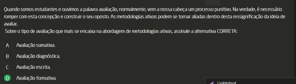 Quando somos estudantes e ouvimos a palavra avaliação, normalmente, vem a nossa cabeça um processo punitivo. Na verdade, é necessário romper com esta concepção e construir seu oposto. As metodologias ativas podem se tornar aliadas dentro desta ressignificação da ideia de avaliar. Sobre tipo de avaliação que mais se encaixa na abordagem de metodologias ativas, assinale a alternativa CORRETA: A Avaliação diagnóstica. B Avaliação formativa. C Avaliação escrita. D Avaliação somativa.