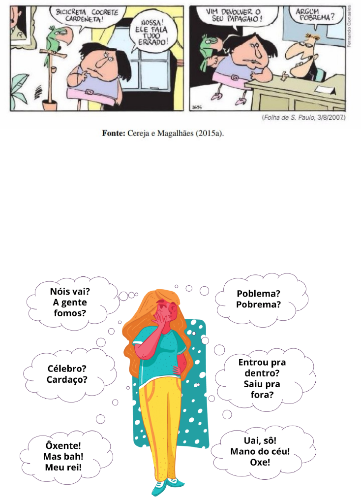 · Nessa charge, podemos identificar que a menina não deseja adotar o papagaio porque ele fala palavras erradas que aprendeu com sua antiga tutora. O papagaio perde o valor da adoção só por não saber pronunciar o português correto; ao avaliarmos tal ação, verificamos que o preconceito que a menina tem ao vocabulário do pássaro é maior do que o afeto que deveria ser levado em conta na adoção. · Nesta imagem, podemos observar algumas expressões usadas em algumas regiões do nosso país. Cada lugar tem seu próprio vocábulo e por conseguinte somente elas compreendem o que se é falado. Somos um país riquíssimo em vocábulo porém muitas vezes essa forma peculiar que cada região tem de se comunicar é vista como inadequada, sofrendo assim muito preconceito e discriminação. Muitas pessoas são forçadas a se adaptarem a esse modo imposto que a sociedade impõe, perdendo assim, suas origens, mas sendo aceitas por esses grupos. · Nessa imagem, que faz parte de uma matéria, observamos que uma jornalista zomba da forma como o ex-presidente fala. Ele usa uma linguagem simples para se comunicar pronunciando algumas palavras que não seguem as normas do português correto que é deitada nessa mesma matéria (adevogado). Ela tenta desmoralizar o seu discurso pelo modo simples como ele fala. seu discurso é dirigido aos menos favorecidos podendo assim dizer que ele fala a “linguagem do povo” e por esse motivo, sofre preconceito por não usar palavras de difícil compreensão e linguagem formal. Claramente ela o despreza pela forma como ele discursa, que fica muito claro pelo comentário que ela faz às palavras ditas por ele. image2.png image3.png image1.png