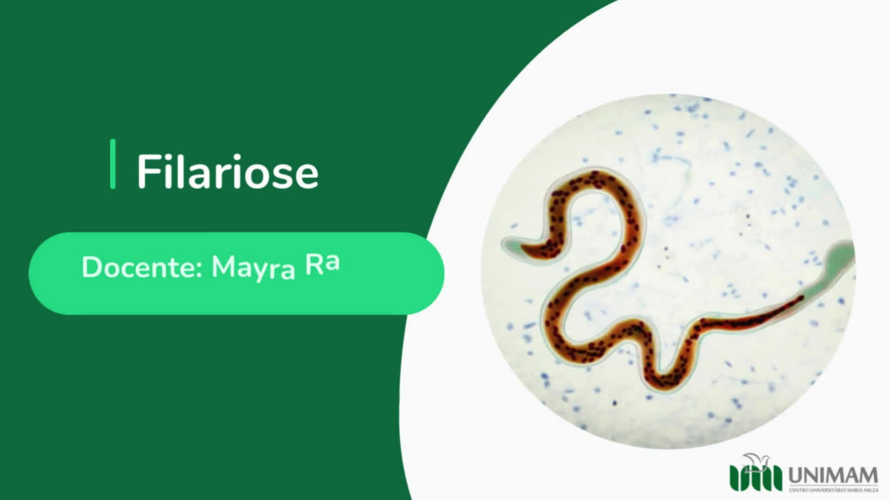 Discentes 01 02 03 04 05 06 07 Jusiane Alves Jull i Maira Banqueiro Leticia Soares Lohanne Ribeiro Gracinelma Freitas Nalanda Andrade Nathan Costa08 09 Pâmela Santana Kaliane Santos Ciclo de vida Sumário 01 02 03 Introdução Transmissão Morfologia Patogenia/Sintomas Referências 04 Tratamento 05 06 09 07 Diagnosticos 08 Epidemiologia Introdução Vetor: Mosquito do Gênero culex; Ciclo: heteroxeno; Hospedeiro definit ivo: Homem; Hospedeiro intermediário: Mosquito; Orgão de eleição: Sistema Linfático; No Brasil , a transmissão de Fi lariose está restrita a áreas endêmicas do município de Recife e região metropolitana; Agente etiológico: Wuchereria Bancrofti , Brugia Malay e Brugia Timor; Morfologia Macho e fêmea longos e delgados, opalino, translúcidos e revestidos por cutícula lisa; Fêmea - 8 a 10 cm e macho - 4 cm Larvas - microfilárias Vermes adultos vivem nos: Vasos linfáticos Linfonodos - enrolados Ciclo de vida Também são vetores da doença a Chrysomya (mosca varejeira) e algumas espécies do mosquito Anopheles, infectados pelas larvas do verme. Transmissão A picada do vetor biológico (fêmea) Culex quiquefasciatus (pernilongo ou muriçoca) transmite a Filariose Linfática Patogenia/Sintomas Febre Dor de cabeça Calafrios Acúmulo de líquido nos membros Aumento do volume testicular Aumento dos gânglios linfáticos (principalmente na virilha) Surgem com grande quantidade de parasitas circulantes Podem demorar até 12 meses para aparecer Estimulam reações inflamatórias Podem obstruir os vasos linfáticos, causando inchaço. Epidemiologia Distribuição geográfica: - É endêmica em regiões tropicais e subtropicais da Ásia, África, América Central e do Sul e algumas regiões do Pacífico. - As áreas mais afetadas incluem partes da Índia, Nigeria, Indonésia, Bangladesh e partes da América Latina. Grupos de risco: - População que vive em áreas endêmicas, com saneamento precário e má higiene. - Pessoas expostas a picadas de mosquitos infectados. DIAGNOSTICOS •EXAME MICROSCÓPICO DE SANGUE: ESSA É UMA DAS FORMAS MAIS COMUNS DE DIAGNÓSTICO •TESTE ANTÍGENO CIRCULANTE: ESSE DETECTA A PRESENÇA DE ANTÍGENOS LIBERADOS PELOS VERMES ADULTOS NA CORRENTE SANGUÍNEA DO HOSPEDEIRO •ULTRASSONOGRAFIA : PODE SER USADO PARA DETECTAR A PRESENÇA DOS VERMES ADULTOS NOS VASOS LINFÁTICOS. •RESSONÂNCIA MAGNÉTICA: AVALIAR ALTERAÇÕES CAUSADAS PELA INFECÇÃO. •BIÓPSIA: PARA SER UTILIZADA EM ALGUNS CASOS. O tratamento para f i lar iose é feito com antiparasitár ios; 02 Dieti lcarbamazina ou Ivermectina associada Dieti lcarbamazina. TRATAMENTO 01 02 03 Quando o parasita morre, at issar o sistema imonologico; 05 Em alguns casos, é possível também haver infecção secundária por bactérias ou fungos Antibióticos ou Antifúngicos 6 mg/k 12 dias Repetir se necessário Realização de cirurgia em caso de hidrocele;04 Filar iose envolve a adoção de medidas que ajudam a prevenir a picada do mosquito causador da f i lar iose, assim é importante que sejam uti l izados; PROFILAXIA Referências https://www.gov.br/saude/pt-br/assuntos/saude-de-a-a-z/f/elefantiase# https://youtu.be/43dzlcU60vM