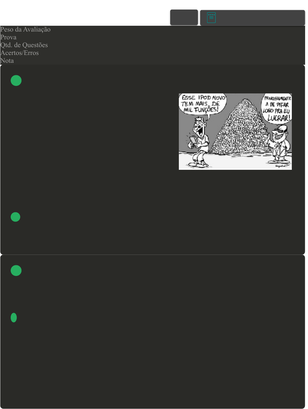 Prova Impressa GABARITO | Avaliação disciplina on-line (Cod.:883588) Peso da Avaliação 10,00 Prova 68820539 Qtd. de Questões 10 Acertos/Erros 9/1 Nota 9,00 A ideia sugerida pela charge está relacionada ao conceito de: FONTE: encurtador.com.br/tvxF9. Acesso em: 1º ago. 2019. A Tecnologia e sustentabilidade. B Desenvolvimento sustentável. C Obsolescência programada. D Reciclagem e reutilização. O ciclo de vida de um produto consiste basicamente nas etapas de produção, uso, coleta de resíduos, tratamento de resíduos e potencial uso (reúso) em mercados secundários. Neste fluxo, os resíduos plásticos descartáveis apresentam qualidade inferior e baixo custo quando reciclados, portanto, dificultando o estímulo para o seu reaproveitamento em mercados secundários. Assim, para alcançarmos um futuro sem plásticos na natureza, é preciso: A Que os produtos plásticos desenvolvidos possam ser reutilizados ou reciclados e que ocorra a coleta seletiva em 100% dos locais de consumo no mundo. B Que a mídia incentive a coleta seletiva e cada cidadão possa optar por consumir produtos de origem sustentável, tornando o uso do plástico proibido mundialmente e assim aumentar a reciclagem. C Que o ser humano tome consciência de suas atitudes perante o meio ambiente, utilizando objetos plásticos recicláveis e estimulando o uso de descartáveis. D Que os consumidores optem por produtos de origem orgânica e recusem o uso de plásticos, pois estes produtos devem deixar de ser utilizados, devido à falta de praticidade que proporcionam. VOLTAR A+ Alterar modo de visualização 1 2 Materiais como plástico, papel, metal e vidro são facilmente reconhecidos como potencialmente recicláveis, contudo, é possível constatar que boa parte da população não sabe onde destinar corretamente os resíduos eletrônicos como pilhas, baterias, aparelhos celulares, etc. Como é denominado o conjunto de ações que reintegra esses resíduos na cadeia produtiva? A Logística contínua. B Logística permanente. C Logística reversa. D Logística contemplativa. Observe a figura e, a partir das ideias sugeridas, avalie as asserções a seguir e a relação proposta entre elas. I- A utilização dos recursos naturais é imprescindível para a sobrevivência humana e cada pessoa deve utilizar esses recursos para realizar seus desejos. PORQUE II- Construir móveis utilizando madeiras de reflorestamento é uma forma de poupar florestas nativas e assim favorecer o desenvolvimento sustentável. Assinale a alternativa CORRETA: A A asserção I é uma proposição verdadeira, e a II é uma proposição falsa. B As asserções I e II são proposições verdadeiras, e a II é uma justificativa correta da I. C A asserção I é uma proposição falsa, e a II é uma proposição verdadeira. D As asserções I e II são proposições verdadeiras, mas a II não é uma justificativa correta de I. Ao visualizar essa questão você está utilizando recursos naturais! Já pensou nisso? Observe que os smartphones, tablets, computadores, notebooks e quaisquer outros meios de comunicação são fabricados a partir de alguma matéria-prima de origem natural, como minérios de ferro e derivados do petróleo. Sobre as relações de consumo e sustentabilidade, analise as sentenças a seguir: 3 4 5 I- Na fabricação de produtos tecnológicos é isenta a utilização de recursos naturais. II- O avanço da tecnologia dispensa o consumidor de se preocupar com o meio ambiente. III- Existe igualdade nas formas de consumo sustentável ao redor do mundo e isso favorece a sustentabilidade. IV- O equilíbrio planetário é afetado pelo comportamento da humanidade com relação ao consumo. Assinale a alternativa CORRETA: A As sentenças II e III estão corretas. B Somente a sentença I está correta. C As sentenças I e II estão corretas. D Somente a sentença IV está correta. O conceito de sustentabilidade abrange diversos ramos da sociedade. Atualmente, essa ideia está presente na Missão, Visão e Valores de diversas empresas no Brasil e no mundo, pois leva em consideração três dimensões fundamentais para o desenvolvimento sustentável. Sobre essas dimensões, assinale a alternativa CORRETA: A Financeira, Econômica e Lucrativa. B Econômica, Social e Ambiental. C Cultural, Energética e Aquática. D Social, Justa e Democrática. Há um contraste entre a reciclagem dos diferentes resíduos no Brasil. Se, por um lado, o país é campeão mundial em reciclagem de alumínio, com mais de 98% de reciclagem desse resíduo, o plástico apresenta um índice de reciclagem muito baixo, cerca de 1%, o que significa que há um grande volume de plásticos depositados em aterros e dispersos na natureza. Para melhorar esse cenário, cada cidadão brasileiro precisa fazer a sua parte para reduzir o consumo de plástico e reciclar o que já está em circulação. Com base no exposto, assinale a alternativa CORRETA: FONTE: https://www.wwf.org.br/?70222/Brasil-e-o-4-pais-do-mundo-que-mais-gera-lixo-plastico. Acesso em: 25 jul. 2019. A O consumidor brasileiro, ao desperdiçar comida e não separar os resíduos em casa, contribui para os baixos índices de reciclagem do plástico e do alumínio. B O uso excessivo do plástico, especialmente os descartáveis, contribui para Brasil ser líder mundial na reciclagem deste resíduo. C O plástico é um produto utilizado em larga escala na indústria, no comércio e nas residências de um modo geral, o que aumenta os índices de reciclagem. D O consumidor pode mudar seus hábitos, repensando, recusando, reduzindo, reutilizando e reciclando os produtos com componentes plásticos. 6 7 Considerando as informações da figura anexa, analise as sentenças a seguir: I- O consumidor é levado a adquirir produtos que não necessita para viver, mas que agrada o seu ego. II- Pelo excesso de consumo muitos se endividam, chegando ao ponto de ter seu nome em listas de inadimplentes. III- A figura expressa a ideia d