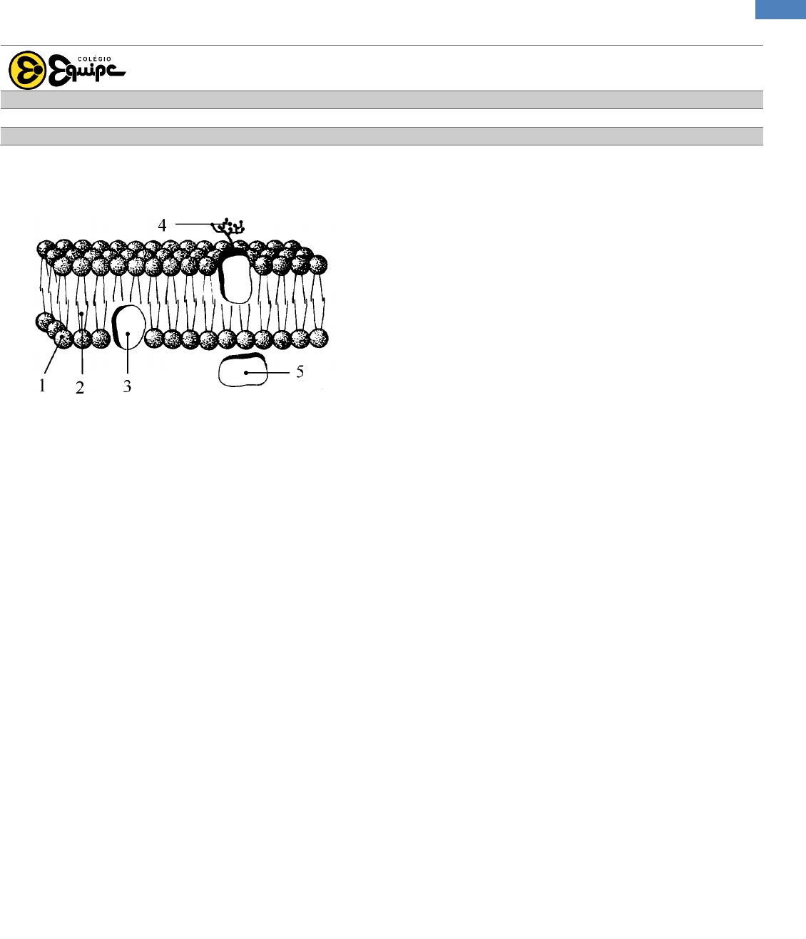 1 MEMBRANA PLASMÁTICA - EXERCÍCIOS Colégio Equipe de Juiz de Fora Rua São Mateus, 331 - São Mateus – Juiz de Fora – MG (32) 323-8686 29/04/2020: EXERCÍCIOS MEMBRANA PLASMÁTICA– 3º ano EM DISCIPLINA: BIOLOGIA PROFESSOR: FABRÍCIO MEMBRANA PLASMÁTICA - EXERCÍCIOS QUESTÃO 01) (UFES-ES) O modelo abaixo representa a configuração molecular da membrana celular, segundo Singer e Nicholson. Acerca do modelo proposto, assinale a alternativa incorreta. a) O algarismo 1 assinala a extremidade polar (hidrófila) das moléculas lipídicas. b) O algarismo 2 assinala a extremidade apolar (hidrófoba) das moléculas lipídicas. c) O algarismo 3 assinala uma molécula de proteína. d) O algarismo 4 assinala uma molécula de proteína que faz parte do glicocálix. e) O algarismo 5 assinala uma proteína extrínseca à estrutura da membrana. QUESTÃO 02) (UFF-94) A membrana plasmática é constituída de uma bicamada de fosfolipídeos, onde estão mergulhadas moléculas de proteínas globulares. As proteínas aí encontradas: a) estão dispostas externamente, formando uma capa que delimita o volume celular e mantém a diferença de composição molecular entre os meios intra e extracelular. b) apresentam disposição fixa, o que possibilita sua ação no transporte de íons e moléculas através da membrana. c) têm movimentação livre no plano da membrana, o que permite atuarem como receptores de sinais. d) dispõem-se na região mais interna, sendo responsáveis pela maior permeabilidade da membrana a moléculas hidrofóbicas. e) localizam-se entre as duas camadas de fosfolipídeos, funcionando como um citoesqueleto, que determina a morfologia celular. QUESTÃO 03) (UNIRIO-95) As células animais apresentam um revestimento externo específico, que facilita sua aderência, assim como reações a partículas estranhas, como, por exemplo, as células de um órgão transplantado. Esse revestimento é denominado: a) membrana celulósica. b) glicocálix. c) microvilosidades. d) interdigitações. e) desmossomos. QUESTÃO 04) (ENEM 2012) Quando colocados em água, os fosfolipídios tendem a formar lipossomos, estruturas formadas por uma bicamada lipídica, conforme mostrado na figura. Quando rompida, essa estrutura tende a se reorganizar em um novo lipossomo. Esse arranjo característico se deve ao fato de os fosfolipídios apresentarem uma natureza 2 MEMBRANA PLASMÁTICA - EXERCÍCIOS a) polar, ou seja, serem inteiramente solúveis em água. b) apoiar, ou seja, não serem solúveis em solução aquosa. c) anfotérica, ou seja, podem comportar-se como ácidos e bases. d) insaturada, ou seja, possuírem duplas ligações em sua estrutura. e) anfifílica, ou seja, possuírem uma parte hidrofílica e outra hidrofóbica. QUESTÃO 05) (ENEM 2017) Visando explicar uma das propriedades da membrana plasmática, fusionou-se uma célula de camundongo com uma célula humana, formando uma célula híbrida. Em seguida, com o intuito de marcar as proteínas de membrana, dois anticorpos foram inseridos no experimento, um específico para as proteínas de membrana do camundongo e outro para as proteínas de membrana humana. Os anticorpos foram visualizados ao microscópio por meio de fluorescência de cores diferentes. A mudança observada da etapa 3 para a etapa 4 do experimento ocorre porque as proteínas (A) movimentam-se livremente no plano da bicamada lipídica. (B) permanecem confinadas em determinadas regiões da bicamada. (C) auxiliam o deslocamento dos fosfolipídios da membrana plasmática. (D) são mobilizadas em razão da inserção de anticorpos. (E) são bloqueadas pelos anticorpos. QUESTÃO 06) (PUC-SP) As microvilosidades presentes nas células do epitélio intestinal têm a função de: a) aumentar a aderência entre uma célula e outra. b) produzir grande quantidade de ATP, necessária ao intenso metabolismo celular. c) sintetizar enzimas digestivas. d) secretar muco. e) aumentar a superfície de absorção. 3 MEMBRANA PLASMÁTICA - EXERCÍCIOS QUESTÃO 07) (PUC-SP) Sabe-se que células epiteliais acham-se fortemente unidas, sendo necessária uma força considerável para separá-las. Isto se deve à ação: a) do ATP, que se prende às membranas plasmáticas das células vizinhas. b) da substância intercelular. c) dos desmossomos. d) dos centríolos. e) da parede celular celulósica. QUESTÃO 08) (PUC-RJ-2003) Hemácias foram colocadas em uma solução de concentração desconhecida, tendo, após um certo tempo, sofrido hemólise. Em função deste resultado, foi possível dizer que a solução em questão apresenta-se: a) atônica em relação às hemácias. b) com alta concentração de sais. c) hipotônica em relação às hemácias. d) isotônica em relação às hemácias. e) hipertônica em relação às hemácias. QUESTÃO 09) (VUNESP-2008) No início da manhã, a dona de casa lavou algumas folhas de alface e as manteve em uma bacia, imersas em água comum de torneira, até a hora do almoço. Com esse procedimento, a dona de casa assegurou que as células das folhas se mantivessem a) túrgidas, uma vez que foram colocadas em meio isotônico. b) túrgidas, uma vez que foram colocadas em meio hipotônico. c) túrgidas, uma vez que foram colocadas em meio hipertônico. d) plasmolizadas, uma vez que foram colocadas em meio isotônico. e) plasmolizadas, uma vez que foram colocadas em meio hipertônico. QUESTÃO 10) Todas as células possuem uma membrana plasmática que separa o conteúdo protoplasmático do meio extracelular. A existência e integridade da membrana é importante porque: a) regula trocas entre a célula e o meio só permitindo a passagem de moléculas de fora para dentro da célula e impedindo a passagem no sentido inverso. b) possibilita à célula manter a composição intracelular diversa da do meio ambiente. c) impede a penetração de substâncias existentes em excesso no meio ambiente. d) exige sempre consumo energético para a captação de alimentos do meio exter